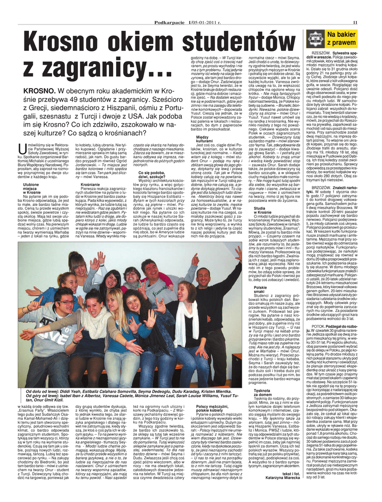 P dk p i 1/05-01-2011 Podkarpacie 1/05 01 2011 r. Krosno okiem studentów z zagranicy… KROSNO. W obecnym roku akademickim w Krośnie przebywa 49 studentów z zagranicy. Sześcioro z Grecji, siedemnaścioro z Hiszpanii, ośmiu z Portugalii, szesnastu z Turcji i dwoje z USA. Jak podoba im się Krosno? Co ich zdziwiło, zszokowało w naszej kulturze? Co sądzą o krośnianach? U mówiliśmy się w Rektoracie Państwowej Wyższej Szkoły Zawodowej, w rynku. Spotkanie zorganizował Bartłomiej Michalski z uczelnianego Biura Współpracy Narodowej. Poprosiłam, aby zaprosił na rozmowę przynajmniej po dwoje studentów z każdego kraju. to kobiety, lubią ubrania. Nie tylko kupować. Oglądanie i przymierzanie sprawia im taką samą radość, jak nam. Do gustu bardzo przypadł im również Ogród Jordanowski. – To miejsce jest bardzo kolorowe i miło spędza się tam czas. Ten park jest śliczny – mówi Vanessa. Ulubione miejsca w Krośnie Na pytanie jak im się podoba Krosno odpowiadają, że jest to małe, ale bardzo ładne miasto. Cenią tu przede wszystkim spokój, świeże powietrze i czystą okolicę. Mają też swoje ulubione miejsca, gdzie lubią spędzać wolny czas. Na pierwszym miejscu, chórem i z uśmiechem na twarzy wymieniają Marhabę – jeden z lokali na rynku, gdzie Krośnianie Pierwsza reakcja zagranicznych studentów na pytanie o ludzi w Krośnie jest bardzo zaskakująca. Pada kilka wypowiedzi, z których wynika, że ludzie tutaj są nieprzyjaźni. - Raz się zgubiłam i nie wiedziałam gdzie jestem. Pytałam kilku ludzi o drogę, ale dopiero któryś z kolei, jakiś młody chłopak wskazał mi drogę. Ludzie w ogóle się nie zatrzymywali, patrzyli na mnie dziwnie e – wspomina Vanessa. Wtedy wynikła mię- często się skarżą na hałasy dochodzące z naszego mieszkania. Zdarza się bowiem, że w mieszkaniu odbywa się impreza, niejednokrotnie do późnych godzin nocnych. Co się podoba, dziwi, szokuje? Wystrój i architektura kościołów przy rynku, a więc gotyckiego klasztoru franciszkanów i kościoła farnego bardzo spodobały się Hiszpance Estibaliz – Byłam w tych kościołach przy rynku, są piękne – mówi. Podobnie jak rynek i uliczki wokół niego. Na pytanie co ich szokuje w naszej kulturze Sarah (Amerykanka) odpowiada, że ludzie tu bardzo często się spóźniają, co jest zupełnie dla niej obce, bo w Ameryce ludzie są punktualni. Onur wskazuje godziny na dobę. – W Turcji kiedy chcę zjeść coś o trzeciej nad ranem, po prostu wychodzę i nie ma z tym problemu. Tutaj jedynie możemy iść wtedy na stację benzynową, y ale tam jest bardzo drogo – dodaje Onur. Zadziwiające jest to, że Seyma twierdzi, że w Krośnie brakuje dobrych restauracji, gdzie można dobrze i smacznie zjeść. – Na dodatek wszystkie są w podziemiach, gdzie jest zimno i nie ma zasięgu dla telefonów komórkowych h – dopowiada Yusuf. Cieszą się jednak, że w Polsce został wprowadzony zakaz palenia w lokalach i restauracjach, bo dym z papierosów bardzo im przeszkadzał. Między kulturami Jest coś co, ciągle dziwi Polaków, krośnian, co w kulturze tureckiej jest normalne. – Kiedy witam się z kolegą – mówi student Onur – podaję mu rękę i zbliżam swoją głowę do jego głowy, dotykamy się lewą i prawą stroną czoła. Tak jak w Polsce kobiety całują się na powitanie, tak mężczyźni w Turcji robią podobnie, tylko nie całują się, a jedynie dotykają głowami. To ciągle jest dla tutejszych ludzi dziwne. -Niektórzy biorą nas nawet za homoseksualistów, a w naszej kulturze to zwykłe, męskie powitanie e – dodaje Yusuf. W naszej kulturze nie ma czegoś, co miałoby zszokować gości z zagranicy. Może tylko to, że Turcy nie tkną wieprzowiny, a wynika to z ich religii i jedynie ta część naszej polskiej kultury jest dla nich nie do przyjęcia. normalna rzeczz – mówi Seyma. Jeśli chodzi o urodę, to dziewczyny zgodnie twierdzą, że jest wielu przystojnych mężczyzn w Krośnie i potrafią się oni dobrze ubrać. Są oczywiście wyjątki, ale to jak w każdej kulturze. Vanessa zwróciła uwagę na to, że większość chłopców ma ogolone włosy na krótko. - Nie mają fantazyjnych fryzur – dodaje Monica. Chłopcy natomiast twierdzą, że Polskie kobiety są cudowne. – Brunetki, blondynki. Nieważne. polskie dziewczyny są śliczne e – mówi Onur i Yusuf. Yusuf nawet umówił się na randkę z krośnianką. Nie wynikło niestety z tego nic poważnego. Ciekawie wypada ocena Polek w oczach zagranicznych studentek. – Dziewczyny tutaj są bardzo mądre – mówi stanowczo Şeyma. Tak, zdecydowanie da się to zauważyćć – dodaje kiwając głową Sarah. – I potrafią pić alkohol. Kobiety tu znają umiar i wiedzą kiedy powiedzieć stop – zauważa Onur. Sarah dodaje także, że polskie dziewczyny są bardzo szczupłe, a w sklepach ciuchy mają bardzo małe rozmiary. – Nie mogę kupić tutaj spodni dla siebie, bo wszystkie są bardzo małe i ciasne, zwłaszcza w nogawce e – mówi z uśmiechem na twarzy, mimo iż jej figura nie pozostawia wiele do życzenia. Studia w Krośnie Ci młodzi ludzie przyjechali do krośnieńskiej Państwowej Wyższej Szkoły Zawodowej w ramach wymiany studenckiej „Erasmus”. Mówią, że zostali tu bardzo mile przyjęci. – Czujemy czasem na sobie wzrok tutejszych studentów, ale rozumiemy to, bo jesteśmy tu po prostu nowi i inni – tłumaczy Vanessa. Profesorowie są dla nich bardzo łagodni. Zwalniają ich z zajęć, jeśli mają zaplanowaną jakąś wycieczkę. Nikt nie robi im z tego powodu problemów, bo zdają sobie sprawę, że przyjechali do Polski również po to, żeby coś zobaczyć i zwiedzić. Polskie smaki Studenci z zagranicy próbowali kilku polskich dań. Bardzo smakują im nasze zupy, ale przede wszystkim są zachwyceni żurkiem. Próbowali też pierogów. Na pytanie o nasz krośnieński kebab, odpowiadają, że jest dobry, ale zupełnie inny niż w Hiszpanii c