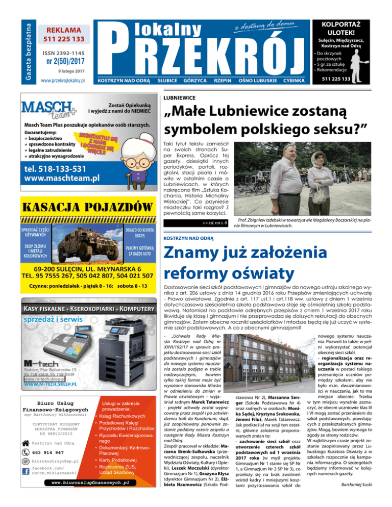 Gazeta bezpłatna REKLAMA 511 225 133 ISSN 2392-1145 nr 2(50)/2017 9 lutego 2017 www.przekrojlokalny.pl P RZEKRÓJ lokalny KOSTRZYN NAD ODRĄ SŁUBICE GÓRZYCA RZEPIN OŚNO LUBUSKIE CYBINKA KOLPORTAŻ ULOTEK! Sulęcin, Międzyrzecz, Kostrzyn nad Odrą •Do skrzynek pocztowych •5 gr. za sztukę •Rekomendacje 511 225 133 LUBNIEWICE „Małe Lubniewice zostaną symbolem polskiego seksu?” Taki tytuł tekstu zamieścił na swoich stronach Super Express. Oprócz tej gazety, dziesiątki innych periodyków, portali, rozgłośni, stacji pisało i mówiło w ostatnim czasie o Lubniewicach, w których nakręcono film „Sztuka Kochania. Historia Michaliny Wisłockiej”. Co przyniesie miasteczku taki rozgłos? Z pewnością same korzyści. >> cd. na s. 6 Prof. Zbigniew Izdebski w towarzystwie Magdaleny Boczarskiej na planie filmowym w Lubniewicach. KOSTRZYN NAD ODRĄ Czynne: poniedziałek - piątek 8 - 16; sobota 8 - 13 Kasy fiskalne • Kserokopiarki • Komputery sprzedaż i serwis Słubice, Plac Bohaterów 15 95 758 8508, 95 758 8509 www.m-tech.sklep.pl www.m-tech.sklep.pl Biuro Usług Finansowo-Księgowych mgr Bartłomiej Mikłaszewski CERTYFIKAT KSIĘGOWY MINISTRA FINANSÓW NR 68813/2015 Kostrzyn nad Odrą 663 914 947 [email protected] facebook.com/ BUFKB.Miklaszewski Usługi w zakresie prowadzenia: • Ksiąg Rachunkowych • Podatkowej Księgi Przychodów i Rozchodów • Ryczałtu Ewidencjonowanego • Dokumentacji KadrowoPłacowej • Karty Podatkowej • Rozliczenia ZUS, Urząd Skarbowy www.biurouslugfinansowych.pl Znamy już założenia reformy oświaty Dostosowanie sieci szkół podstawowych i gimnazjów do nowego ustroju szkolnego wynika z art. 206 ustawy z dnia 14 grudnia 2016 roku Przepisów zmieniających uchwałę - Prawo oświatowe. Zgodnie z art. 117 ust.1 i art.118 ww. ustawy z dniem 1 września dotychczasowa sześcioletnia szkoła podstawowa staje się ośmioletnią szkołą podstawową. Natomiast na podstawie odrębnych przepisów z dniem 1 września 2017 roku likwiduje się klasę I gimnazjum i nie przeprowadza się dalszych rekrutacji do obecnych gimnazjów. Zatem obecne roczniki sześciolatków i młodsze będą się już uczyć w systemie szkół podstawowych. A co z obecnymi gimnazjami? - „Uchwała Rady Miasta Kostrzyn nad Odrą nr XXVI/192/17 w sprawie projektu dostosowania sieci szkół podstawowych i gimnazjów do nowego systemu nauczania została podjęta w trybie nadzwyczajnym, bowiem tylko takiej formie może być wyrażone stanowisko Miasta w odniesieniu do zmian w Prawie oświatowym - wyjaśniał radnym Marek Tatarewicz - projekt uchwały został wypracowany przez zespół i po zatwierdzeniu trafi do Kuratorium, skąd, już zaopiniowany ponownie zostanie poddany ocenie zespołu a następnie Rady Miasta Kostrzyn nad Odrą. Zespół pracował w składzie: Marzena Brenk-Sułkowska (przewodniczącej zespołu, naczelnik Wydziału Oświaty, Kultury i Opieki), Leszek Moczulski (dyrektor Gimnazjum Nr 1), Grażyna Kłysz (dyrektor Gimnazjum Nr 2), Elżbieta Naumowicz (Szkoła Pod- stawowa Nr 2), Marzanna Senger (Szkoła Podstawowa Nr 4) oraz radnych w osobach: Monika Sądej, Krystyna Srokowska, Jeremi Filuś, Marek Tatarewicz. Jak podkreślał na sesji ten ostatni, główne założenia proponowanych zmian to: - zachowanie sieci szkół oraz utworzenie czterech szkół podstawowych od 1 września 2017 roku (w myśl projektu Gimnazjum Nr 1 stanie się SP Nr 1, a Gimnazjum Nr 2 SP Nr 3), co przełoży się na brak zwolnień wśród kadry i mniejszymi kosztami przystosowania szkół do nowego systemu nauczania. Pozwoli to także w pełni wykorzystać potencjał obecnej sieci szkół. - regionalizacja oraz reorganizacja systemu nauczania w postaci takiego przesunięcia uczniów pomiędzy szkołami, aby nie było m.in. dwuzmianowości w nauczaniu, jak to ma miejsce obecnie. Trzeba w tym miejscu wyraźnie zaznaczyć, że obecni uczniowie klas III i VI mogą zostać przeniesieni do szkół podstawowych, powstających z przekształcanych gimnazjów. Mogą, bowiem wymaga to zgody ze strony rodziców. W najbliższym czasie projekt zostanie zaopiniowany przez Lubuskiego Kuratora Oświaty a w szkołach rozpocznie się kampania informacyjna. O szczegółach będziemy informować w kolejnych numerach gazety. Bartłomiej Suski nr 2(50)/2017 2 Ogłoszenia Drobne Kupię medale, znaczki pocztowe, monety złote, srebrne, stare kartki pocztowe i koperty ze znaczkami: polskie, rosyjskie i niemieckie. Tel. 609 110 831 Sprzedam ziemię HUMUS, kopaną ze stawu. 10 ton - 250 zł + transport Tel. 608 275 272 Sprzedam mieszkanie 3 pok. o pow. 53,6 m2, 3-piętro, Sulęcin, osiedle Słoneczne kontakt 732876464, Zdzisław Poszukuję pracy: posprzątam dom lub roznoszenie ulotek lub jako opiekunka do dziecka. Tel. 722 106 696 Ocieplanie budynków, tel. 881 507 760 Sprzedam fortepian (antyk), stan b. dobry, koncertowy, niemiecki, wymiary: 2,1 x 1,4. Tel. 692 927 397 Opiekunki do Niemiec AMBERCARE24 , wymagany j. niem. komunikatywny, do 1500 euro na rękę, legalnie od zaraz 535 340 311 lub 533 848 005 lub 730 340 005 Wyborcze obietnice PiS Zrealizowane obietnice będą zmieniać kolor na zielony • Program „500plus” – 500 zł miesięcznie na drugie i każde kolejne dziecko w rodzinie (na pierwsze przy zarobkach na osobę w rodzinie nie przekraczających 800 zł); • Obniżenie wieku emerytalnego – 60 lat dla kobiet i 65 lat dla mężczyzn; • Zwiększenie kwoty wolnej od podatku do 8 tys. zł; • Obniżenie podatku VAT z 23 do 22 proc.; • Zlikwidowanie 8 procentowego podatku VAT na ubranka dla dzieci; • Mieszkania po 2 tys. zł za mkw; • Obniżenie z 19 do 15 proc. podatku CIT dla małych firm; • Minimalna stawka godzinowa wynagrodzenia na poziomie 12 zł brutto; • Przewalutowanie „frankowiczów” na korzystnych dla nich warunkach; • Przedszkola mają być darmowe, a do szkół mają powrócić dentyści i pielęgniarki; • 1,2 mln nowych miejsc pracy dla młodych ludz