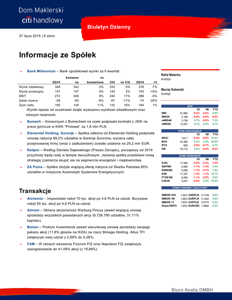 Biuletyn Dzienny 27 lipca 2015 | 6 stron Informacje ze Spółek Bank Millennium – Bank opublikował wyniki za II kwartał: Wynik odsetkowy Wynik prowizyjny EBIT Saldo rezerw Zysk netto Rafał Materka 2Q15 konsens us vs konsensus Citi vs Citi 2Q14 r/r 348 147 272 -59 165 342 147 249 -65 149 2% 0% 9% -8% 11% 333 145 244 -67 142 5% 2% 11% -11% 16% 376 163 288 -74 164 -7% -10% -6% -20% 1% Analityk Maciej Kałowski Analityk GPW Wyniki lepsze od oczekiwań dzięki wyższemu wynikowi odsetkowymi oraz niższym rezerwom. Bumech – Konsorcjum z Bumechem na czele podpisało kontrakt z JSW na prace górnicze w KWK “Pniówek” za 1,8 mln PLN. Elemental Holding, Gorenje – Spółka zależna od Elemental Holding podpisała umowę nabycia 69,2% udziałów w Gorenje Surovina, wycena całej przejmowanej firmy (wraz z zadłużeniem) została ustalona na 29,2 mln EUR. Radpol – Według Daniela Dajewskiego (Prezes Zarządu), począwszy od 2016 przychody będą rosły w tempie dwucyfrowym. Jesienią spółka przedstawi nową strategię (zamierza skupić sie na segmencie energetyki i ciepłownictwa. ZA Polna – Spółka złożyła wiążącą ofertę nabycia od Skarbu Państwa 85% udziałów w Instytucie Automatyki Systemów Energetycznych. Transakcje Alchemia – Impexmetal nabył 70 tys. akcji po 4,6 PLN za udział. Boryszew nabył 50 tys. akcji po 4,6 PLN za udział. WIG WIG20 mWIG40 sWIG80 51,860 2,188 3,738 13,207 1D 1M -0.2% -4.2% -0.6% -6.9% 0.7% -0.5% 0.1% 0.5% YTD 0.9% -5.5% 7.3% 9.1% RYNKI WSCHODZĄCE MSCI BUX RTS ISE 133.7 22,384 859 78,712 1D 1M YTD -0.9% -0.9% 14.5% 0.3% 2.5% 34.6% -2.9% -9.7% 8.7% 0.5% -6.5% -8.2% RYNKI ROZWINIĘTE DJIA S&P500 NASDAQ DAX FTSE100 CAC40 17,569 2,080 5,089 11,347 6,580 5,057 1D -0.9% -1.1% -1.1% -1.4% -1.1% -0.6% 1M YTD -2.2% -1.4% -1.4% 1.0% -0.7% 7.4% -1.1% 15.7% -3.9% 0.2% 0.2% 18.4% RYNEK PIENIĘŻNY I WALUTOWY WIBOR O/N WIBOR 1M WIBOR 1Y Stopa REPO 1.62% 1.66% 1.83% 1.50% USDPLN EURPLN CHFPLN EURUSD 3.7729 4.1442 3.9175 1.0984 0.6% 0.6% 0.3% 0.0% Amrest – Główny akcjonariusz Warburg Pincus zawarł wiążącą umowę sprzedaży wszystkich posiadanych akcji (6.726.790 udziałów, 31,71% kapitału). Bioton – Prokom Investments zawarł warunkową umowę sprzedaży swojego pakietu akcji (11,8% głosów na WZA) na rzecz Bimega Holding. Altus TFI zwiększyło swój udział z 2,99% do 5,28%. FAM – W ramach wezwania Fulcrum FIZ oraz Napoleon FIZ zwiększyły zaangażowanie do 41,09% akcji (z 19,88%). Biuro Analiz DMBH Biuletyn dzienny 27 lipca 2015 Kalendarium Spółek Erne Ventures – ZWZA w sprawie m.in. pokrycia straty za rok obrotowy 2014. Feerum – Pierwszy dzień obrotu bez prawa do dywidendy (0,12 PLN na akcję). Grajewo – NWZA w sprawie podwyższenia kapitału zakładowego w drodze emisji nowych akcji, oferty publicznej akcji nowej emisji, pozbawienia dotychczasowych akcjonariuszy w całości prawa pob oru i in. Hetan Technologies – ZWZA w sprawie m.in. podziału zysku za rok 2014. LiveChat Software – Ostatni dzień obrotu z prawem do dywidendy (0,71 PLN na akcję). Magellan – Wypłata dywidendy (1,85 PLN na akcję). SKOK – Pierwszy dzień obrotu bez dywidendy (0,04 na akcję zwykłą oraz 0,06 PLN na akcję uprzywilejowaną). WDB Brokerzy Ubezpieczeniowi – Wypłata dywidendy (0,07 PLN na akcję). Wezwania Bioton – NovoTek Pharmaceuticals ogłosiło wezwanie na 28.335.186 (33% głosów na WZA), oferowana cena 7 PLN za udział. Zapisy potrwają od 16 lipca do 7 sierpnia. Wzywający zamierza kupić akcje wyłącznie, jeżeli złożone zostaną zapisy na co najmniej 25.759.260 akcji (odpowiadające 30% głosów na WZA). Zapisy zostały wstrzymane. Echo Investment – Lisala ogłosiła wezwanie do sprzedaży 100.897.904 akcji (24,45% głosów na WZA), oferowana cena 6,75 PLN za udział. Zapisy potrwają od 14 do 29 lipca. Wzywający zamierza osiągnąć łącznie próg 66% głosów na WZA. KCI – Grzegorz Hajdarowicz wraz z podmiotami zależnymi ogłosił wezwanie do sprzedaży 124.267.824 akcji spółki (7,09% głosów na WZA), oferowana cena 0,03 PLN za udział. Zapisy potrwają od 31 lipca do 14 sierpnia. Polcolorit – Barbara Urbaniak-Marconi ogłosiła wezwanie do sprzedaży 4,27 mln akcji spółki (20,2% głosów na WZA), oferowana cena 0,75 PLN za udział. Zapisy potrwają od 27 lipca do 1 września. Wzywający ma zamiar wycofać spółkę z GPW. TVN – Southbank Media ogłosił wezwanie do sprzedaży 160.952.702 akcji spółki (45,63% kapitału akcyjnego), oferowana cena 20 PLN za udział. Zapisy potrwają od 24 lipca do 24 sierpnia. Wzywający ma zamiar wycofać spółkę z GPW. Pamapol – Amerykanka Struktura (kontrolowana przez Pawła oraz Mariusza Szataniak) ogłosił wezwanie do sprzedaży 6.642.200 akcji (21,13% głosów na WZA), oferowana cena 1,15 PLN za udział. Zapisy potrwają od 17 sierpnia do 18 września. Wzywający zamierza osiągnąć 100% głosów na WZA i nie planuje na obecną chwilę wycofywać spółki z obrotu na GPW. Biuletyn dzienny 27 lipca 2015 Oferta publiczna Certyfikatów Inwestycyjnych PZU FIZ Akord seria B Informujemy, że od 20 lipca do 5 sierpnia 2015 r. Dom Maklerski Banku Handlowego S.A. przyj muje od inwestorów zapisy w ramach oferty publicznej Certyfikatów Inwestycyjnych PZU FIZ Akord seria B. Cena emisyjna wynosi 99,83 PLN. Prospekt emisyjny jest dostępny na stronie DMBH http://www.dmbh.pl. Miejsce przyjmowania zapisów od inwestorów indywidualnych: Bezpośrednio: Telefonicznie: w Punkcie Obsługi Klientów DMBH w Warszawie przy ul. Senatorskiej 16 punktach przyjmowania zleceń zlokalizowanych w wybranych oddziałach Citi Handlowy w Telecentrum DMBH Dodatkowych informacji udzielą Państwu nasi pracownicy w dni robocze w godzinach 08:00 – 18:00 pod numerem telefonu +48 22 690 11 11, a także osobiście i telefonicznie w punktach przyjmujących zapisy w godzinach ich pracy. Biuletyn dzienny 27 lipca 2015 Wskaźniki Spółek (1) C/Z Spółka BOGDANKA BUDIMEX ELECTRICA C/WK EV/EBIT