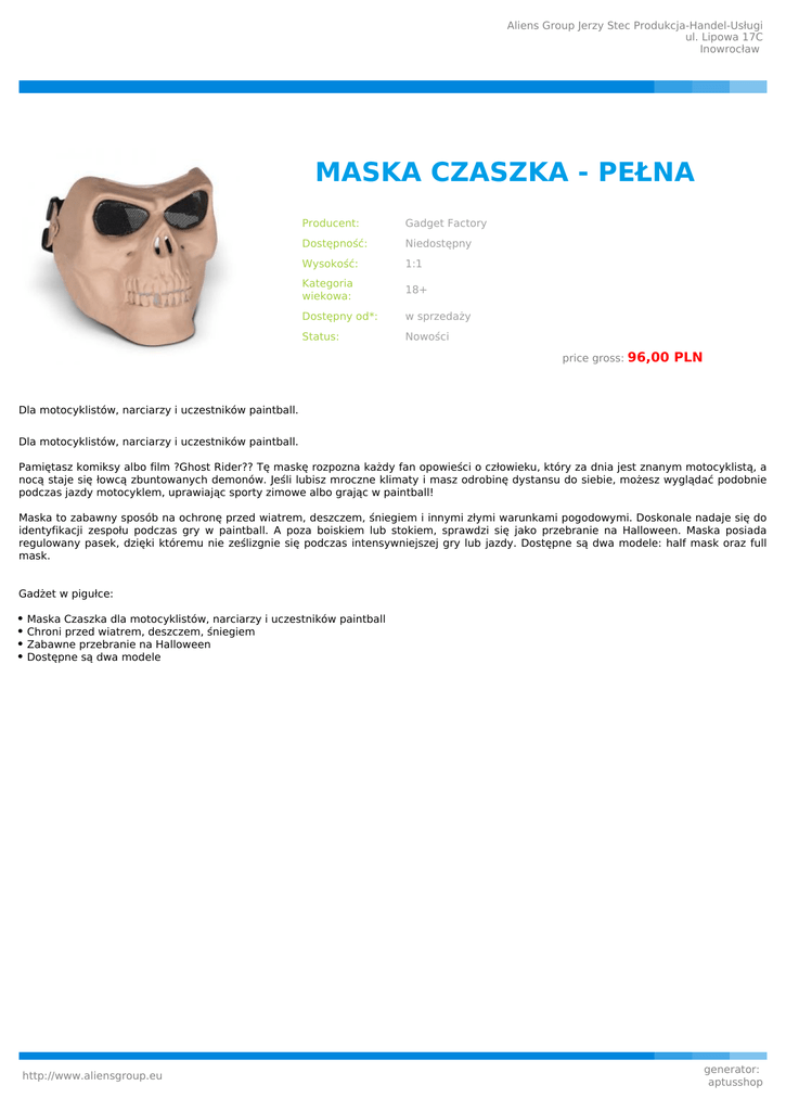 Aliens Group Jerzy Stec Produkcja-Handel-Usługi ul. Lipowa 17C Inowrocław MASKA CZASZKA - PEŁNA Producent: Gadget Factory Dostępność: Niedostępny Wysokość: 1:1 Kategoria wiekowa: 18+ Dostępny od*: w sprzedaży Status: Nowości price gross: 96,00 PLN Dla motocyklistów, narciarzy i uczestników paintball. Dla motocyklistów, narciarzy i uczestników paintball. Pamiętasz komiksy albo film ?Ghost Rider?? Tę maskę rozpozna każdy fan opowieści o człowieku, który za dnia jest znanym motocyklistą, a nocą staje się łowcą zbuntowanych demonów. Jeśli lubisz mroczne klimaty i masz odrobinę dystansu do siebie, możesz wyglądać podobnie podczas jazdy motocyklem, uprawiając sporty zimowe albo grając w paintball! Maska to zabawny sposób na ochronę przed wiatrem, deszczem, śniegiem i innymi złymi warunkami pogodowymi. Doskonale nadaje się do identyfikacji zespołu podczas gry w paintball. A poza boiskiem lub stokiem, sprawdzi się jako przebranie na Halloween. Maska posiada regulowany pasek, dzięki któremu nie ześlizgnie się podczas intensywniejszej gry lub jazdy. Dostępne są dwa modele: half mask oraz full mask. Gadżet w pigułce: Maska Czaszka dla motocyklistów, narciarzy i uczestników paintball Chroni przed wiatrem, deszczem, śniegiem Zabawne przebranie na Halloween Dostępne są dwa modele http://www.aliensgroup.eu generator: aptusshop