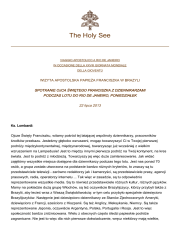 The Holy See VIAGGIO APOSTOLICO A RIO DE JANEIRO IN OCCASIONE DELLA XXVIII GIORNATA MONDIALE DELLA GIOVENTÙ WIZYTA APOSTOLSKA PAPIEŻA FRANCISZKA W BRAZYLI SPOTKANIE OJCA ŚWIĘTEGO FRANCISZKA Z DZIENNIKARZAMI PODCZAS LOTU DO RIO DE JANEIRO, PONIEDZIAŁEK 22 lipca 2013 Ks. Lombardi: Ojcze Święty Franciszku, witamy pośród tej latającej wspólnoty dziennikarzy, pracowników środków przekazu. Jesteśmy głęboko wzruszeni, mogąc towarzyszyć Ci w Twojej pierwszej podróży międzykontynentalnej, międzynarodowej, towarzysząc już wcześniej z wielkim wzruszeniem na Lampedusie! Jest to między innymi pierwsza podróż na Twój kontynent, na kres świata. Jest to podróż z młodzieżą. Towarzyszy jej więc duże zainteresowanie. Jak widać zajęliśmy wszystkie miejsca dostępne dla dziennikarzy podczas tego lotu. Jest nas ponad 70 osób, a grupa została utworzona na podstawie bardzo różnych kryteriów, to znaczy są tu przedstawiciele telewizji - zarówno redaktorzy jak i kamerzyści, są przedstawiciele prasy, agencji prasowych, radia, operatorzy internetu ... Tak więc w zasadzie, są tu odpowiednio reprezentowane wszystkie media. Są to również przedstawiciele różnych kultur, różnych języków. Mamy na pokładzie dużą grupę Włochów, są też oczywiście Brazylijczycy, którzy przybyli także z Brazylii, aby lecieć wraz z Waszą Świątobliwością: w tym celu przybyło specjalnie dziesięcioro Brazylijczyków. Następnie jest dziesięcioro dziennikarzy ze Stanów Zjednoczonych Ameryki, dziewięcioro z Francji, sześcioro z Hiszpanii. Są też Anglicy, Meksykanie, Niemcy. Są także reprezentowane Japonia, oczywiście Argentyna, Polska, Portugalia i Rosja. Jest to więc społeczność bardzo zróżnicowana. Wielu z obecnych często śledzi papieskie podróże zagraniczne. Nie jest to więc dla nich pierwsze doświadczenie, wręcz niektórzy mają wielkie, 2 znając te podróże znacznie lepiej niż Ty. Inni są natomiast tutaj po raz pierwszy, gdyż na przykład Brazylijczycy śledzą tę podróż szczególnie. Pomyśleliśmy więc, aby powitać Ciebie w tej grupie głosem jednego, a może lepiej jednej z nas, wybranej, sądzę, że bez większych problemów związanych z rywalizacją - gdyż jest to z pewnością osoba, która odbyła najwięcej podróży zagranicznych z Ojcem Świętym: współzawodnicząc z doktorem Gasbarrim, także pod względem odbytych podróży. Ponadto jest to osoba, która pochodzi z kontynentu Waszej Świątobliwości, a więc może mówić do Ciebie po hiszpańsku, w Twoim języku ojczystym. Jest osobistością, kobietą, a więc słusznie byłoby, abyśmy udzielili jej głosu. Tak więc natychmiast przekazuję mikrofon Valentinie Alazraki, która od wielu lat jest korespondentką Televisa, a mimo to, jak widać, zawsze zachowuje młodość. Cieszymy się też, iż jest pośród nas, gdyż kilka tygodni temu złamała sobie nogę i obawialiśmy się, że nie będzie mogła pojechać. Tymczasem wykurowała się na czas, zdjęła gips dwa lub trzy dni temu, a teraz jest już w samolocie. Tak więc to ona wyrazi uczucia, jakie ta latająca wspólnota żywi wobec Ciebie. Valentina Alazraki: [po hiszpańsku] Dzień dobry Papieżu Franciszku! Jedyną moją zasługą uzasadniającą przywilej powitania Ciebie jest spora liczba godzin lotu. Uczestniczyłam w pierwszej podróży Jana Pawła II do mojej ojczyzny, Meksyku. Wówczas byłam maskotką, teraz 34 i pół roku później - jestem dziekanem! Z tego względu mam zaszczyt powitać Waszą Świątobliwość. Wiemy od Twoich przyjaciół i współpracowników w Argentynie, że dziennikarze nie są specjalnie "świętymi, do których żywisz szczególne nabożeństwo". Być może pomyślałeś, że ksiądz Lombardi wprowadził Ciebie do zagrody dla lwów ... Ale prawdą jest, to że nie jesteśmy tak bardzo okrutni i z przyjemnością towarzyszymy w Twojej podróży. Chcielibyśmy, abyś tak nas postrzegał, jako towarzyszy w tej i w tylu jeszcze innych podróżach. Oczywiście jesteśmy dziennikarzami i jeśli dziś, czy jutro lub w następnych dniach zechcesz odpowiedzieć na pytania, chętnie skorzystamy z okazji, bo jesteśmy dziennikarzami. Widzieliśmy, że zawierzyłeś tę podróż Maryi, udając się do bazyliki Santa Maria Maggiore, udasz się do Aparecidy. Pomyślałam, aby zrobić Tobie mały prezent, bardzo małą pielgrzymującą Matkę Bożą, żeby Tobie towarzyszyła w tej pielgrzymce i jeszcze w tak wieku innych. Chodzi w tym wypadku o Matkę Bożą z Guadalupe, ale nie dlatego, że jest Królową Meksyku, ale ponieważ jest Patronką Ameryki, tak więc, żadna Matka Boża się nie obrazi, ani Królowa Argentyny, ani z Aparecidy, ani żadna inna. Składam ją w darze z wielką miłością nas wszystkich i z nadzieją, że będzie Ciebie chroniła w tej podróży i wielu innych. Ks. Lombardi: A teraz oddajmy oczywiście głos Ojcu Świętemu, żeby powiedział nam co najmniej kilka słów wprowadzenia do tej podróży. Papież Franciszek: 3 Dzień dobry, Dzień dobry wszystkim. Mówili - sam słyszałem trochę dziwne rzeczy: "nie jesteście świętymi, do których żywię szczególne nabożeństwo". Jestem tutaj między lwami... , ale nie tak bardzo okrutnymi, cóż? Dziękuję. Naprawdę nie udzielam wywiadów, ale nie wiem dlaczego, nie mogę, i tak już jest. Trudno mi ich udzielać, ale dziękuję za to towarzyszenie. Ta pierwsza podróż ma na celu właśnie odnalezienie młodych, ale nie w izolacji od ich życia, lecz w tkance społecznej, w społeczeństwie. Kiedy bowiem izolujemy młodych dopuszczamy się niesprawiedliwości; odbieramy im przynależność, przynależność do rodziny, ojczyzny, kultury, wiary ... Przynależą, a nam nie wolno ich izolować! Ale, przede wszystkim, nie izolować ich od całego społeczeństwa! Są oni naprawdę przyszłością narodu. To prawda! Ale nie tylko oni: są oni przyszłością, bo mają siłę, są młodzi, pójdą do przodu