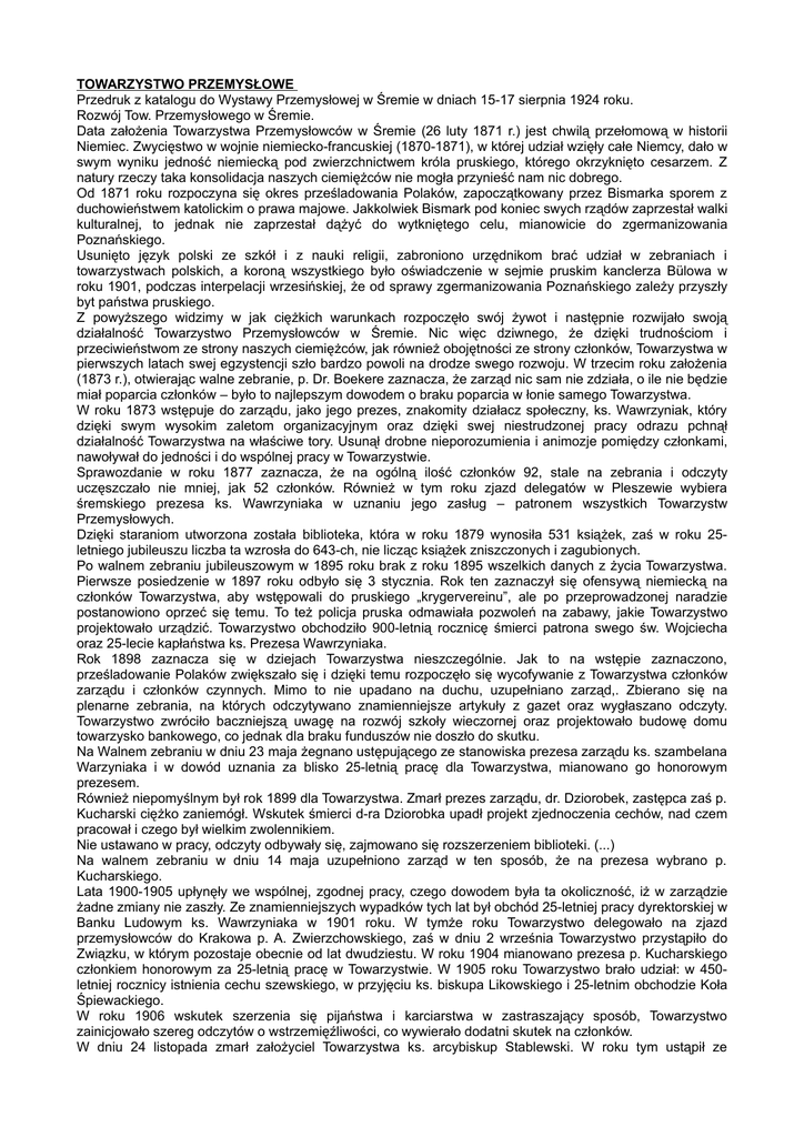 TOWARZYSTWO PRZEMYSŁOWE Przedruk z katalogu do Wystawy Przemysłowej w Śremie w dniach 15-17 sierpnia 1924 roku. Rozwój Tow. Przemysłowego w Śremie. Data założenia Towarzystwa Przemysłowców w Śremie (26 luty 1871 r.) jest chwilą przełomową w historii Niemiec. Zwycięstwo w wojnie niemiecko-francuskiej (1870-1871), w której udział wzięły całe Niemcy, dało w swym wyniku jedność niemiecką pod zwierzchnictwem króla pruskiego, którego okrzyknięto cesarzem. Z natury rzeczy taka konsolidacja naszych ciemiężców nie mogła przynieść nam nic dobrego. Od 1871 roku rozpoczyna się okres prześladowania Polaków, zapoczątkowany przez Bismarka sporem z duchowieństwem katolickim o prawa majowe. Jakkolwiek Bismark pod koniec swych rządów zaprzestał walki kulturalnej, to jednak nie zaprzestał dążyć do wytkniętego celu, mianowicie do zgermanizowania Poznańskiego. Usunięto język polski ze szkół i z nauki religii, zabroniono urzędnikom brać udział w zebraniach i towarzystwach polskich, a koroną wszystkiego było oświadczenie w sejmie pruskim kanclerza Bülowa w roku 1901, podczas interpelacji wrzesińskiej, że od sprawy zgermanizowania Poznańskiego zależy przyszły byt państwa pruskiego. Z powyższego widzimy w jak ciężkich warunkach rozpoczęło swój żywot i następnie rozwijało swoją działalność Towarzystwo Przemysłowców w Śremie. Nic więc dziwnego, że dzięki trudnościom i przeciwieństwom ze strony naszych ciemiężców, jak również obojętności ze strony członków, Towarzystwa w pierwszych latach swej egzystencji szło bardzo powoli na drodze swego rozwoju. W trzecim roku założenia (1873 r.), otwierając walne zebranie, p. Dr. Boekere zaznacza, że zarząd nic sam nie zdziała, o ile nie będzie miał poparcia członków – było to najlepszym dowodem o braku poparcia w łonie samego Towarzystwa. W roku 1873 wstępuje do zarządu, jako jego prezes, znakomity działacz społeczny, ks. Wawrzyniak, który dzięki swym wysokim zaletom organizacyjnym oraz dzięki swej niestrudzonej pracy odrazu pchnął działalność Towarzystwa na właściwe tory. Usunął drobne nieporozumienia i animozje pomiędzy członkami, nawoływał do jedności i do wspólnej pracy w Towarzystwie. Sprawozdanie w roku 1877 zaznacza, że na ogólną ilość członków 92, stale na zebrania i odczyty uczęszczało nie mniej, jak 52 członków. Również w tym roku zjazd delegatów w Pleszewie wybiera śremskiego prezesa ks. Wawrzyniaka w uznaniu jego zasług – patronem wszystkich Towarzystw Przemysłowych. Dzięki staraniom utworzona została biblioteka, która w roku 1879 wynosiła 531 książek, zaś w roku 25letniego jubileuszu liczba ta wzrosła do 643-ch, nie licząc książek zniszczonych i zagubionych. Po walnem zebraniu jubileuszowym w 1895 roku brak z roku 1895 wszelkich danych z życia Towarzystwa. Pierwsze posiedzenie w 1897 roku odbyło się 3 stycznia. Rok ten zaznaczył się ofensywą niemiecką na członków Towarzystwa, aby wstępowali do pruskiego „krygervereinu”, ale po przeprowadzonej naradzie postanowiono oprzeć się temu. To też policja pruska odmawiała pozwoleń na zabawy, jakie Towarzystwo projektowało urządzić. Towarzystwo obchodziło 900-letnią rocznicę śmierci patrona swego św. Wojciecha oraz 25-lecie kapłaństwa ks. Prezesa Wawrzyniaka. Rok 1898 zaznacza się w dziejach Towarzystwa nieszczególnie. Jak to na wstępie zaznaczono, prześladowanie Polaków zwiększało się i dzięki temu rozpoczęło się wycofywanie z Towarzystwa członków zarządu i członków czynnych. Mimo to nie upadano na duchu, uzupełniano zarząd,. Zbierano się na plenarne zebrania, na których odczytywano znamienniejsze artykuły z gazet oraz wygłaszano odczyty. Towarzystwo zwróciło baczniejszą uwagę na rozwój szkoły wieczornej oraz projektowało budowę domu towarzysko bankowego, co jednak dla braku funduszów nie doszło do skutku. Na Walnem zebraniu w dniu 23 maja żegnano ustępującego ze stanowiska prezesa zarządu ks. szambelana Warzyniaka i w dowód uznania za blisko 25-letnią pracę dla Towarzystwa, mianowano go honorowym prezesem. Również niepomyślnym był rok 1899 dla Towarzystwa. Zmarł prezes zarządu, dr. Dziorobek, zastępca zaś p. Kucharski ciężko zaniemógł. Wskutek śmierci d-ra Dziorobka upadł projekt zjednoczenia cechów, nad czem pracował i czego był wielkim zwolennikiem. Nie ustawano w pracy, odczyty odbywały się, zajmowano się rozszerzeniem biblioteki. (...) Na walnem zebraniu w dniu 14 maja uzupełniono zarząd w ten sposób, że na prezesa wybrano p. Kucharskiego. Lata 1900-1905 upłynęły we wspólnej, zgodnej pracy, czego dowodem była ta okoliczność, iż w zarządzie żadne zmiany nie zaszły. Ze znamienniejszych wypadków tych lat był obchód 25-letniej pracy dyrektorskiej w Banku Ludowym ks. Wawrzyniaka w 1901 roku. W tymże roku Towarzystwo delegowało na zjazd przemysłowców do Krakowa p. A. Zwierzchowskiego, zaś w dniu 2 września Towarzystwo przystąpiło do Związku, w którym pozostaje obecnie od lat dwudziestu. W roku 1904 mianowano prezesa p. Kucharskiego członkiem honorowym za 25-letnią pracę w Towarzystwie. W 1905 roku Towarzystwo brało udział: w 450letniej rocznicy istnienia cechu szewskiego, w przyjęciu ks. biskupa Likowskiego i 25-letnim obchodzie Koła Śpiewackiego. W roku 1906 wskutek szerzenia się pijaństwa i karciarstwa w zastraszający sposób, Towarzystwo zainicjowało szereg odczytów o wstrzemięźliwości, co wywierało dodatni skutek na członków. W dniu 24 listopada zmarł założyciel Towarzystwa ks. arcybiskup Stablewski. W roku tym ustąpił ze stanowiska prezesa p. Kucharski, urażony artykułami powstałego w Poznaniu pisma „Przemysłowiec”, traktującego o sprawach przemysłu i rzemiosła. Na walnem zebraniu, odbytem w dniu 3 lutego wybrano zarząd w następującym składzie: pp. E. Neyman, dr. Matuszewski, zastępca, A. Kochanowski, sekret
