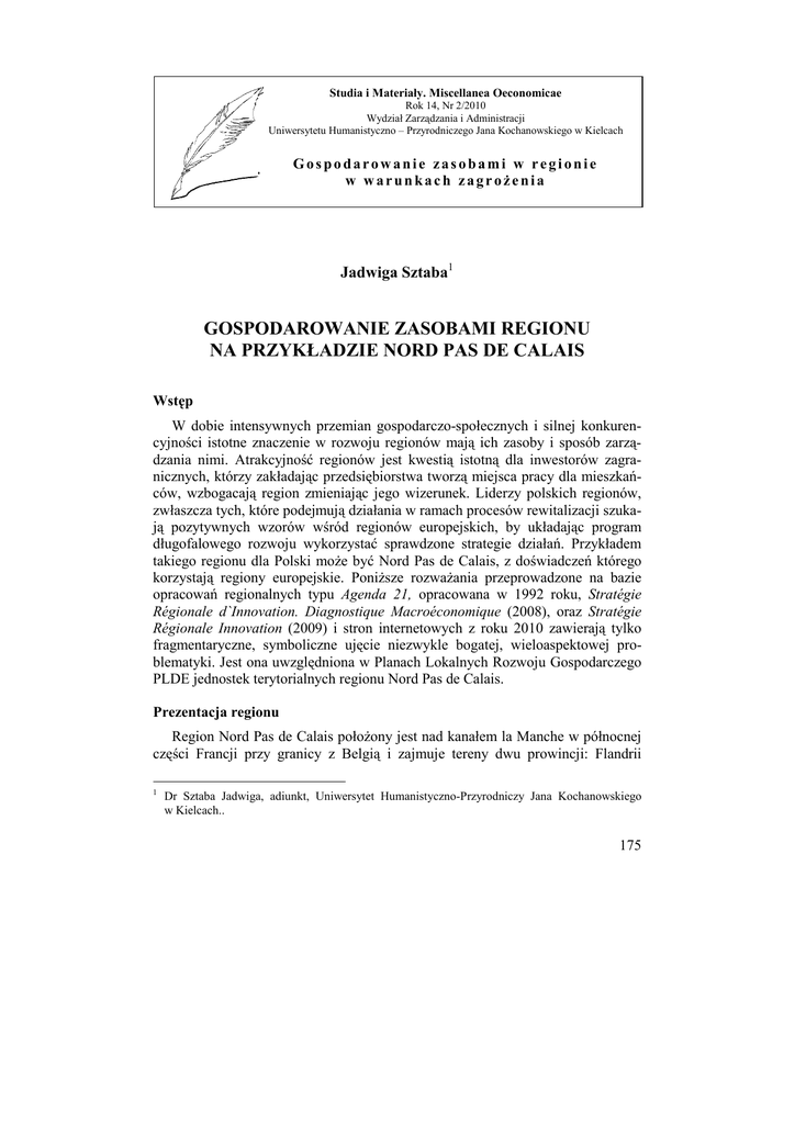 Studia i Materiały. Miscellanea Oeconomicae Rok 14, Nr 2/2010 Wydział Zarządzania i Administracji Uniwersytetu Humanistyczno – Przyrodniczego Jana Kochanowskiego w Kielcach Gospodarowanie zasobami w regionie w warunkach zagroŜenia Jadwiga Sztaba1 GOSPODAROWANIE ZASOBAMI REGIONU NA PRZYKŁADZIE NORD PAS DE CALAIS Wstęp W dobie intensywnych przemian gospodarczo-społecznych i silnej konkurencyjności istotne znaczenie w rozwoju regionów mają ich zasoby i sposób zarządzania nimi. Atrakcyjność regionów jest kwestią istotną dla inwestorów zagranicznych, którzy zakładając przedsiębiorstwa tworzą miejsca pracy dla mieszkańców, wzbogacają region zmieniając jego wizerunek. Liderzy polskich regionów, zwłaszcza tych, które podejmują działania w ramach procesów rewitalizacji szukają pozytywnych wzorów wśród regionów europejskich, by układając program długofalowego rozwoju wykorzystać sprawdzone strategie działań. Przykładem takiego regionu dla Polski moŜe być Nord Pas de Calais, z doświadczeń którego korzystają regiony europejskie. PoniŜsze rozwaŜania przeprowadzone na bazie opracowań regionalnych typu Agenda 21, opracowana w 1992 roku, Stratégie Régionale d`Innovation. Diagnostique Macroéconomique (2008), oraz Stratégie Régionale Innovation (2009) i stron internetowych z roku 2010 zawierają tylko fragmentaryczne, symboliczne ujęcie niezwykle bogatej, wieloaspektowej problematyki. Jest ona uwzględniona w Planach Lokalnych Rozwoju Gospodarczego PLDE jednostek terytorialnych regionu Nord Pas de Calais. Prezentacja regionu Region Nord Pas de Calais połoŜony jest nad kanałem la Manche w północnej części Francji przy granicy z Belgią i zajmuje tereny dwu prowincji: Flandrii 1 Dr Sztaba Jadwiga, adiunkt, Uniwersytet Humanistyczno-Przyrodniczy Jana Kochanowskiego w Kielcach.. 175 i Artois. Jego powierzchnia wynosi 12 414 km kw., co stanowi 2,3% terytorium kraju. Zamieszkiwany jest przez ponad 4 048 000 mieszkańców, a więc 6,6% populacji Francji2. Gęstość zaludnienia wynosi 326 osób na km. kw. ZłoŜony jest z dwu departamentów: Nord i Pas de Calais, 13 okręgów, 156 kantonów i 1547 gmin. W departamencie Nord mieszka 64% ludności, zaś w departamencie Pas de Calais 36%. W środowiskach miejskich zamieszkuje 95% ludności regionu, pozostała część stanowiąca około 5% mieszka na obszarach wiejskich. Jest to region ludzi młodych, o wysokim wskaźniku przyrostu naturalnego. Zajmuje trzecią pozycję pod względem rozwoju przemysłowego we Francji, a czwartą pod względem potencjału ekonomicznego z PKB = 96,5 mln euro. Jest to okrąg surowcowy. Rozkwita przemysł elektromaszynowy, przemysł zaawansowanych technologii, hutnictwa Ŝelaza. 35% zatrudnionych pracuje w przemyśle cięŜkim. Region ma bardzo dobrze rozwiniętą infrastrukturę drogową. 550 km autostrad łączy stolice europejskie. Posiada 1127 km linii kolejowych i 700 km dróg wodnych. Do najwaŜniejszych miast regionu naleŜą: Boulogne sur Mer, Calais, Dunkerque, Lille, Arras. KaŜde z miast stanowi osobliwą wizytówkę regionu. Tradycje przemysłowe Od czasów średniowiecza region znany był jako strefa niezwykłej aktywności ekonomicznej i handlowej3. W XIX wieku, w okresie pierwszej rewolucji przemysłowej związanej z pojawieniem się telegrafu, maszyny parowej, kolei Ŝelaznej intensywnie rozwijał się wykorzystując najnowsze osiągnięcia techniczne. Dodatkowym atutem regionu były duŜe pokłady węgla kamiennego, na bazie którego rozwinął się przemysł cięŜki. Przez szereg lat obok paryskiego region północny uchodził za obszar najbardziej uprzemysłowiony. Wysoki wskaźnik wydobycia węgla kamiennego i jego przetwórstwa w zakładach koksochemicznych i energetycznych, duŜe moŜliwości transportowe miały wpływ na potencjał ekonomiczny regionu i kraju. Z bazą węglową związana była takŜe czarna metalurgia oparta na rudzie Ŝelaza sprowadzanej z Lotaryngii. Rozwijał się równieŜ przemysł włókienniczy, wełniany, bawełniany, lniany i jutowy. W okresie powojennym wytwarzano tutaj prawie 3/5 całej francuskiej produkcji tkanin wełnianych i 1/3 tkanin bawełnianych. Region słynął takŜe z uprawy pszenicy i buraków cukrowych w wielkopowierzchniowych, zmechanizowanych gospodarstwach rolnych. Rentowności produkcji rolnej sprzyjał dobrze rozbudowany przemysł spoŜywczy, chłonny rynek, stosunkowo duŜa liczba mieszkańców, wysoka gęstość zaludnienia. W paśmie nadmorskich łąk rozwinęła się hodowla bydła mlecznego. DuŜe znaczenie dla regionu miała Dunkierka, duŜy port pasaŜerski i rybacki, gdzie rozwijał się przemysł hutniczy, metalurgiczny, stoczniowy, rafineryjny4. 2 3 4 Institut National de la Statistique et des Etudes Economiques: w dniu 1 stycznia 2010 roku liczba mieszkańców Francji wynosiła 64 647 000 osób. P. Bonnevie, Dictionnaire encyclopédique, Hachette, Paris 1986, s. 375. Ibidem, s. 179. 176 Korzystnie rozwijający się region miał jednak problemy gospodarcze. Regres nastąpił w latach pięćdziesiątych XX wieku, kiedy to wydobycie węgla kamiennego zaczęło spadać. O ile jeszcze w 1955 roku wydobyto ponad 71 mln ton, to w roku 1973 juŜ tylko 27 mln ton. Przestarzały sprzęt wydobywczy, stare metody eksploatacji, brak zabezpieczeń były przyczyną licznych wypadków, do których dochodziło w kopalniach regionu. Do najbardziej spektakularnych naleŜał tragiczny wypadek w kopalni w Lievin w 1974 roku w wyniku którego zginęło 42 górników. Podjęto wówczas szereg natychmiastowych działań, do których naleŜały między innymi decyzje o zamykaniu nierentownych zakładów pracy, hut, fabryk. Efektem tych działań były zwolnienia z pracy i szukanie nowych rozwiązań przez władze lokalne. Problemy ekonomiczne kraju potęgował światowy kryzys gospodarczy lat siedemdziesiątych spowodowany pięciokrotnym wzrostem cen ropy naftowej na rynkach światowych, który dotknął Francj