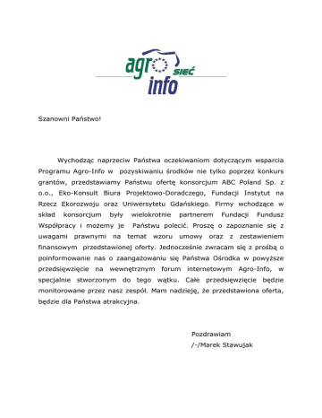 Szanowni Państwo! Wychodząc naprzeciw Państwa oczekiwaniom dotyczącym wsparcia Programu Agro-Info w pozyskiwaniu środków nie tylko poprzez konkurs grantów, przedstawiamy Państwu ofertę konsorcjum ABC Poland Sp. z o.o., Eko-Konsult Biura Projektowo-Doradczego, Fundacji Instytut na Rzecz Ekorozwoju oraz Uniwersytetu Gdańskiego. Firmy wchodzące w skład konsorcjum były Współpracy i możemy je uwagami prawnymi na wielokrotnie partnerem Fundacji Fundusz Państwu polecić. Proszę o zapoznanie się z temat wzoru umowy oraz z zestawieniem finansowym przedstawionej oferty. Jednocześnie zwracam się z prośbą o poinformowanie nas o zaangażowaniu się Państwa Ośrodka w powyższe przedsięwzięcie na wewnętrznym forum internetowym Agro-Info, w specjalnie stworzonym do tego wątku. Całe przedsięwzięcie będzie monitorowane przez nasz zespół. Mam nadzieję, że przedstawiona oferta, będzie dla Państwa atrakcyjna. Pozdrawiam /-/Marek Stawujak
