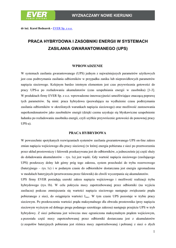 dr inż. Karol Bednarek - EVER Sp. z o.o. PRACA HYBRYDOWA I ZASOBNIKI ENERGII W SYSTEMACH ZASILANIA GWARANTOWANEGO (UPS) WPROWADZENIE W systemach zasilania gwarantowanego (UPS) jednym z najważniejszych parametrów użytkowych jest czas podtrzymania zasilania odbiorników w przypadku zaniku lub nieprawidłowych parametrów napięcia sieciowego. Kolejnym bardzo istotnym elementem jest czas przywrócenia gotowości do pracy UPS-a po rozładowaniu akumulatorów (czas uzupełniania energii w zasobniku) [1-3]. W produktach firmy EVER Sp. z o.o. wprowadzono innowacyjności umożliwiające znaczącą poprawę tych parametrów. Są nimi: praca hybrydowa (pozwalająca na wydłużenie czasu podtrzymania zasilania odbiorników w określonych warunkach napięcia sieciowego) oraz możliwość zastosowania superkondensatorów jako zasobników energii (dzięki czemu uzyskuje się błyskawiczne uzupełnienie ładunku po rozładowaniu zasobnika energii, czyli szybkie przywrócenie gotowości do ponownej pracy UPS-a). PRACA HYBRYDOWA W powszechnie spotykanych rozwiązaniach systemów zasilania gwarantowanego UPS on-line zakres zmian napięcia wejściowego dla pracy sieciowej (w której energia pobierana z sieci po przetworzeniu przez układ prostowniczy i falownik przekazywana jest do odbiorników, a jednocześnie jej część służy do doładowania akumulatorów – rys. 1a) jest wąski. Gdy wartość napięcia sieciowego (zasilającego UPS) przekroczy dolny lub górny próg tego zakresu, system przechodzi do trybu rezerwowego (bateryjnego – rys. 1c) i w podanym czasie do odbiorników dostarczana jest energia zgromadzona w modułach bateryjnych (przetworzona przez falownik) do chwili wyczerpania się akumulatorów. UPS firmy EVER posiadają szeroki zakres napięcia wejściowego i możliwość realizacji trybu hybrydowego (rys. 1b). W celu pokrycia mocy zapotrzebowanej przez odbiorniki (na wyjściu zasilacza) podczas zmniejszania się wartości napięcia sieciowego następuje zwiększanie prądu pobieranego z sieci, do osiągnięcia wartości Imax. W tym czasie UPS pozostaje w trybie pracy sieciowym. Po przekroczeniu wartości prądu maksymalnego dla obwodu prostownika (przy napięciu sieciowym wyższym od dolnego progu podanego szerokiego zakresu) następuje przejście UPS w tryb hybrydowy. Z sieci pobierana jest wówczas moc ograniczona maksymalnym prądem wejściowym, a pozostała część mocy zapotrzebowanej przez odbiorniki dostarczana jest z akumulatorów (z zespołów bateryjnych pobierana jest różnica mocy zapotrzebowanej i pobranej z sieci o złych 1 parametrach). Czas podtrzymania zasilania odbiorników przy pracy hybrydowej może być obliczony jak rozładowanie akumulatorów (w pracy rezerwowej), przy obciążeniu systemu tylko tą różnicą mocy. a) praca sieciowa b) praca hybrydowa c) praca rezerwowa Rys. 1. Schematy przepływu energii (bilans mocy) w poszczególnych trybach pracy UPS EVER W konwencjonalnych rozwiązaniach zamiast trybu hybrydowego realizowana jest już praca bateryjna, wówczas cała energia oddawana do odbiorników pobierana jest z akumulatorów i w efekcie ewidentnie krócej zasilane są odbiorniki. ZASOBNIKI ENERGII Zasobniki energii mają różne zakresy zastosowań [1]. Jedne nadają się do stacjonarnego gromadzenia ogromnych energii w systemach energetycznych (elektrownie szczytowo-pompowe, zasobniki pneumatyczne), inne natomiast mogą być stosowane w systemach mobilnych czy układach zasilania gwarantowanego UPS (akumulatory, superkondensatory). Superkondensatory są zasobnikami energii o charakterze eksploatacyjnym analogicznym do akumulatorów (powszechnie wykorzystywanych m. in. w UPS-ach). Głównymi mankamentami w eksploatacji akumulatorów są: długi czas uzupełniania energii (mała gęstość mocy) oraz krótka żywotność (wynikająca z uwarunkowań chemicznych). Wad tych nie mają superkondensatory. Największą ich zaletą jest duża gęstość mocy (rzędu 100-krotnie wyższa niż w akumulatorach, sięgająca 10000 W/kg), świadcząca o możliwościach poboru z tych źródeł bardzo dużych energii w krótkim czasie, a zatem stosowania bardzo dużych prądów ładowania i rozładowania. Związane jest to w efekcie z osiąganiem krótkich czasów uzupełniania gromadzonej energii (rzędu kilku minut), czyli znacznej szybkości uzyskiwania gotowości do ponownej pracy po rozładowaniu. Ponadto mają małą rezystancję wewnętrzną i mały prąd upływu, czyli znikome wewnętrzne straty energetyczne, wysoką sprawność (nawet przekraczająca 95%), bardzo dużą żywotność (ponad 20 lat lub 1000000 cykli ładowania-rozładowania), mogą pracować w szerokim zakresie temperatur (-40˚C ÷ 65˚C). Niewielka jest degradacja ich własności użytkowych przy wielokrotnym ładowaniu i rozładowaniu oraz znikoma szkodliwość dla środowiska. Największą wadą superkondensatorów jest 2 bardzo wysoka cena, co wraz z burzliwym rozwojem nanotechnologii oraz masowej produkcji może szybko ulec zmianie. Korzystniejszym parametrem w akumulatorach niż w superkondensatorach jest gęstość energii (zdolność do gromadzenia energii). W bateriach elektrochemicznych jest ona na poziomie 100 Wh/kg, a w ultrakondensatorach jest około dziesięciokrotnie mniejsza. Więcej szczegółów dotyczących tych zasobników energii przedstawiono w pracach [1,2]. WYNIKI BADAŃ I ANALIZ Jako uzasadnienie przedstawionych wcześniej rozważań dokonano obliczeń szacunkowych czasów podtrzymania zasilania odbiorników przez system UPS podczas wystąpienia nieprawidłowości napięcia sieciowego (przekroczenie dolnej wartości klasycznego zakresu napięciowego) dla przypadków: rozwiązania konwencjonalnego UPS (praca rezerwowa) oraz UPS EVER POWERLINE GREEN 20 kVA (praca hybrydowa). Obliczenia zrealizowano dla wartości napięcia: 150 V oraz 110 V (w konwencjonalnych systemach przy takich wartościach realizowana jest praca rezerwowa). Uzyskane wyniki zamieszczono na rys. 2