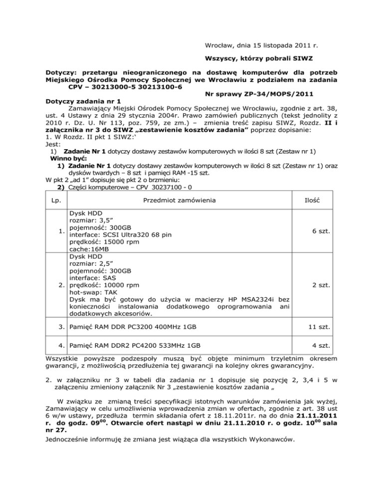 Wrocław, dnia 15 listopada 2011 r. Wszyscy, którzy pobrali SIWZ Dotyczy: przetargu nieograniczonego na dostawę komputerów dla potrzeb Miejskiego Ośrodka Pomocy Społecznej we Wrocławiu z podziałem na zadania CPV – 30213000-5 30213100-6 Nr sprawy ZP-34/MOPS/2011 Dotyczy zadania nr 1 Zamawiający Miejski Ośrodek Pomocy Społecznej we Wrocławiu, zgodnie z art. 38, ust. 4 Ustawy z dnia 29 stycznia 2004r. Prawo zamówień publicznych (tekst jednolity z 2010 r. Dz. U. Nr 113, poz. 759, ze zm.) – zmienia treść zapisu SIWZ, Rozdz. II i załącznika nr 3 do SIWZ „zestawienie kosztów zadania” poprzez dopisanie: 1. W Rozdz. II pkt 1 SIWZ:‘ Jest: 1) Zadanie Nr 1 dotyczy dostawy zestawów komputerowych w ilości 8 szt (Zestaw nr 1) Winno być: 1) Zadanie Nr 1 dotyczy dostawy zestawów komputerowych w ilości 8 szt (Zestaw nr 1) oraz dysków twardych – 8 szt i pamięci RAM -15 szt. W pkt 2 „ad 1” dopisuje się pkt 2 o brzmieniu: 2) Części komputerowe – CPV 30237100 - 0 Lp. Przedmiot zamówienia Dysk HDD rozmiar: 3,5” pojemność: 300GB 1. interface: SCSI Ultra320 68 pin prędkość: 15000 rpm cache:16MB Dysk HDD rozmiar: 2,5” pojemność: 300GB interface: SAS 2. prędkość: 10000 rpm hot-swap: TAK Dysk ma być gotowy do uŜycia w macierzy HP MSA2324i bez konieczności instalowania dodatkowego oprogramowania ani dodatkowych akcesoriów. 3. Pamięć RAM DDR PC3200 400MHz 1GB 4. Pamięć RAM DDR2 PC4200 533MHz 1GB Ilość 6 szt. 2 szt. 11 szt. 4 szt. Wszystkie powyŜsze podzespoły muszą być objęte minimum trzyletnim okresem gwarancji, z moŜliwością przedłuŜenia tej gwarancji na kolejny okres gwarancyjny. 2. w załączniku nr 3 w tabeli dla zadania nr 1 dopisuje się pozycję 2, 3,4 i 5 w załączeniu zmieniony załącznik Nr 3 „zestawienie kosztów zadania „ W związku ze zmianą treści specyfikacji istotnych warunków zamówienia jak wyŜej, Zamawiający w celu umoŜliwienia wprowadzenia zmian w ofertach, zgodnie z art. 38 ust 6 w/w ustawy, przedłuŜa termin składania ofert z 18.11.2011r. na do dnia 21.11.2011 r. do godz. 0900. Otwarcie ofert nastąpi w dniu 21.11.2010 r. o godz. 1000 sala nr 27. Jednocześnie informuję Ŝe zmiana jest wiąŜąca dla wszystkich Wykonawców. Załącznik nr 3 Zestawienie kosztów zadania* Dotyczy: dostawy komputerów dla potrzeb Miejskiego Społecznej we Wrocławiu z podziałem na zadania. CPV – 30213000-5 30213100-6 Ośrodka Pomocy Nazwa Wykonawcy............................................................................................. Zadanie nr 1 L.P. 1 1 2 3 Przedmiot zamówienia 2 Zestaw komputerowy nr 1 Dysk HDD rozmiar: 3,5” SCSI Ultra320 68 pin Dysk HDD rozmiar: 2,5” SAS 4 Pamięć RAM DDR PC3200 400MHz 1GB 5 Pamięć RAM DDR2 PC4200 533MHz 1GB Wartość ogółem Data … .. ... .. .. .. ... .. .. Iloś ć szt. Cena jednostk owa brutto Wartość ogółem brutto = kol. 3x kol. 4 Nazwa, typ, marka oferowanego sprzętu 3 4 5 6 8 6 2 11 4 …. .. ... .. .. .. ... .. .. .. ... ... .. .. ... .. .. .. ... .. . (p i ecz ęć i p od p i s w yk o n a wc y ) Zadanie nr 2 L.P. Przedmiot zamówienia Iloś ć szt. 1 2 3 2 3 Zestaw komputerowy nr 2 Laptop nr 1 Cena jednostk owa brutto Wartość ogółem brutto = kol. 3x kol. 4 Nazwa, typ, marka oferowanego sprzętu 4 5 6 9 1 Wartość ogółem Data … .. ... .. .. .. ... .. .. …. .. ... .. .. .. ... .. .. .. ... ... .. .. ... .. .. .. ... .. . (p i ecz ęć i p od p i s w yk o n a wc y ) *naleŜy wpisać cenę ofertową dla oferowanego zadania
