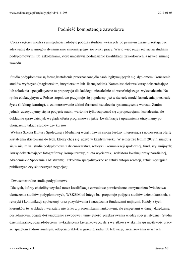 www.radiomaryja.pl/artykuly.php?id=1141295 2012-01-08 Podnieść kompetencje zawodowe Coraz częściej wiedza i umiejętności zdobyte podczas studiów wyższych po pewnym czasie przestają być adekwatne do wymogów dynamicznie zmieniającego się rynku pracy. Warto więc rozejrzeć się za studiami podyplomowymi lub szkoleniami, które umożliwią podniesienie kwalifikacji zawodowych, a nawet zmianę zawodu. Studia podyplomowe są formą kształcenia przeznaczoną dla osób legitymujących się dyplomem ukończenia studiów wyższych (magisterskim, inżynierskim lub licencjackim). Natomiast ciekawe kursy dokształcające lub szkolenia specjalistyczne to propozycja dla każdego, niezależnie od wcześniejszego wykształcenia. Na rynku edukacyjnym w Polsce stopniowo przyjmuje się popularny już w świecie model kształcenia przez całe życie (lifelong learning), a zainteresowanie takimi formami kształcenia systematycznie wzrasta. Zanim jednak zdecydujemy się na podjęcie nauki, warto nie tylko zapoznać się z propozycjami kształcenia, ale dokładnie sprawdzić, jak wygląda oferta programowa i jakie kwalifikacje i uprawnienia otrzymamy po ukończeniu takich studiów czy kursów. Wyższa Szkoła Kultury Społecznej i Medialnej wciąż rozwija swoją bardzo interesującą i nowoczesną ofertę kształcenia skierowaną do tych, którzy chcą się uczyć w każdym wieku. W semestrze letnim 2012 r. znajdują się w niej m.in. studia podyplomowe z dziennikarstwa, retoryki i komunikacji społecznej, funduszy unijnych; kursy dokształcające: fotograficzny, komputerowy, pilota wycieczek, redaktora lokalnej prasy parafialnej, Akademickie Spotkania z Mistrzami; szkolenia specjalistyczne ze sztuki autoprezentacji, sztuki wystąpień publicznych czy skutecznych negocjacji. Dwusemestralne studia podyplomowe Dla tych, którzy chcieliby uzyskać nowe kwalifikacje zawodowe potwierdzone otrzymaniem świadectwa ukończenia studiów podyplomowych, WSKSiM od lutego br. proponuje podjęcie studiów dziennikarskich, z retoryki i komunikacji społecznej oraz pozyskiwania i zarządzania funduszami unijnymi. Każdy z tych kierunków to wykłady i warsztaty nie tylko z pracownikami naukowymi, ale ekspertami w danej dziedzinie, posiadającymi bogate doświadczenie zawodowe i umiejętność przekazywania wiedzy specjalistycznej. Studia dziennikarskie, poza zdobyciem wykształcenia kierunkowego, dają wyjątkową w skali kraju możliwość pracy ze sprzętem audiowizualnym, odbycia praktyk w gazecie, radiu lub telewizji, zrealizowania własnych www.radiomaryja.pl Strona 1/3 pomysłów artykułów, audycji czy filmów przygotowanych pod kierunkiem doświadczonych pracowników mediów jako prace dyplomowe. Kształcenie na studiach podyplomowych z retoryki i komunikacji społecznej to propozycja dla każdego, niezależnie od wykształcenia czy wykonywanego zawodu, przygotowująca do pięknego i mądrego wypowiadania się. Nauczyciele, lekarze, prawnicy, informatycy, przedsiębiorcy, osoby duchowne w oparciu o klasyczną koncepcję retoryki zdobywają na toruńskiej uczelni umiejętności skutecznego przekonywania, poprawnej argumentacji, poprawnego rozumowania i mówienia, kompozycji tekstów (pisanych i mówionych), interpretacji tekstów, publicznego wygłaszania i prezentacji tekstów, dyskusji, mediacji i negocjacji, kształtowania eleganckiego wizerunku osobowego oraz operowania głosem. Natomiast studia podyplomowe: fundusze unijne - pozyskiwanie i zarządzanie niezmiennie cieszą się zainteresowaniem osób, które pragną pod okiem ekspertów przygotowywać projekty o dofinansowanie różnych przedsięwzięć ze środków unijnych, a także nauczyć się je skutecznie realizować i nimi zarządzać. Ponieważ dobiega końca perspektywa finansowa 2007-2013, podjęcie w tym roku studiów to najlepszy moment, żeby przygotować się do nowych wymogów i poznać możliwości pozyskania funduszy w kolejnym rozdaniu. Kursy dokształcające Zajęcia z profesjonalistami, sprzęt najwyższej klasy i stosunkowo niskie koszty kształcenia to atuty proponowanych przez WSKSiM kursów dokształcających. Można się podczas nich nauczyć obsługi komputera (w zależności od stopnia zaawansowania), fotografowania, redagowania gazetek lokalnych czy parafialnych, a także przygotować się do zdobycia licencji pilota wycieczek. Podczas kursu przygotowującego do pracy w branży turystycznej obok zajęć teoretycznych przewidziano bardzo atrakcyjne zajęcia praktyczne, w tym wycieczkę krajową i zagraniczną, gdzie pod okiem opiekuna przyszły pilot nabywa najważniejsze umiejętności niezbędne w tym zawodzie. Interesującą propozycją są także Akademickie Spotkania z Mistrzami, które - dzięki wykorzystaniu możliwości kształcenia na odległość - pozwalają uczestnikom spotykać się z wykładowcami w wirtualnej sali na platformie e-learningowej, a raz w semestrze w malowniczo położonym kampusie uczelni. Wiedza w pigułce - dwudniowe szkolenia specjalistyczne Najnowsza propozycja toruńskiej uczelni to szkolenia z zakresu komunikacji prowadzone przez ekspertów, które zostały przygotowane w taki sposób, by uczyć przez doświadczenie, czyli skutecznie łączyć teorię z praktyką. Można na nich w krótkim czasie zdobyć wiedzę z zakresu doskonalenia wizerunku i www.radiomaryja.pl Strona 2/3 indywidualnego stylu, czyli nauczyć się trudnej sztuki autoprezentacji, jakże potrzebnej w każdym zawodzie. Będzie również możliwość opanowania zasad sztuki wystąpień publicznych i przygotowania się do wypowiedzi przed kamerą i mikrofonem pod okiem red. Wojciecha Gąssowskiego, twórcy Radiowej Akademii Umiejętności w Polskim Radiu. Natomiast dla tych, którzy chcieliby się nauczyć technik negocjacyjnych, przygotowano szkolenie prowadzone przez Dariusza Sobkowa - dyplomatę, b. ambasadora tytularnego przy UE w Brukseli i b. konsula generalnego w Strasburgu. W programie m.in. fazy procesu negocjacyj
