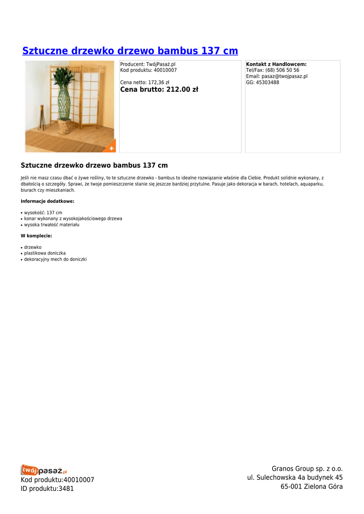 Sztuczne drzewko drzewo bambus 137 cm Producent: TwójPasaż.pl Kod produktu: 40010007 Cena netto: 172,36 zł Kontakt z Handlowcem: Tel/Fax: (68) 506 50 56 Email: [email protected] GG: 45303488 Cena brutto: 212.00 zł Sztuczne drzewko drzewo bambus 137 cm Jeśli nie masz czasu dbać o żywe rośliny, to te sztuczne drzewko - bambus to idealne rozwiązanie właśnie dla Ciebie. Produkt solidnie wykonany, z dbałością o szczegóły. Sprawi, że twoje pomieszczenie stanie się jeszcze bardziej przytulne. Pasuje jako dekoracja w barach, hotelach, aquaparku, biurach czy mieszkaniach. Informacje dodatkowe: ● ● ● wysokość: 137 cm konar wykonany z wysokojakościowego drzewa wysoka trwałość materiału W komplecie: ● ● ● drzewko plastikowa doniczka dekoracyjny mech do doniczki Kod produktu:40010007 ID produktu:3481 Granos Group sp. z o.o. ul. Sulechowska 4a budynek 45 65-001 Zielona Góra
