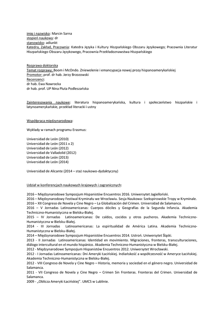 imię i nazwisko: Marcin Sarna stopień naukowy: dr stanowisko: adiunkt Katedra, Zakład, Pracownia: Katedra Języka i Kultury Hiszpańskiego Obszaru Językowego; Pracownia Literatur Hiszpańskiego Obszaru Językowego, Pracownia Przekładoznawstwa Hiszpańskiego Rozprawa doktorska Temat rozprawy: Boom i McOndo. Zniewolenie i emancypacja nowej prozy hispanoamerykańskiej Promotor: prof. dr hab. Jerzy Brzozowski Recenzenci: dr hab. Ewa Nawrocka dr hab. prof. UP Nina Pluta Podleszańska Zainteresowania naukowe: literatura hispanoamerykańska, kultura i społeczeństwo latynoamerykańskie, przekład literacki i ustny hiszpańskie i Współpraca międzynarodowa: Wykłady w ramach programu Erasmus: Universidad de León (2010) Universidad de León (2011 x 2) Universidad de León (2012) Universidad de Valladolid (2012) Universidad de León (2013) Universidad de León (2014) Universidad de Alicante (2014 – staż naukowo-dydaktyczny) Udział w konferencjach naukowych krajowych i zagranicznych: 2016 – Międzynarodowe Sympozjum Hispanistów Encuentros 2016. Uniwersytet Jagielloński. 2016 – Międzynarodowy Festiwal Kryminału we Wrocławiu. Sesja Naukowa: Szekspirowskie Tropy w Kryminale. 2016 – XII Congreso de Novela y Cine Negro – La Globalización del Crimen. Universidad de Salamanca. 2016 – V Jornadas Latinoamericanas: Cuerpos dóciles y Geografías de la Segunda Infancia. Akademia Techniczno-Humanistyczna w Bielsku-Białej. 2015 – IV Jornadas Latinoamericanas: De caldos, cocidos y otros pucheros. Akademia TechnicznoHumanistyczna w Bielsku-Białej. 2014 - III Jornadas Latinoamericanas: La espiritualidad de América Latina. Akademia TechnicznoHumanistyczna w Bielsku-Białej. 2014 – Międzynarodowe Sympozjum Hispanistów Encuentros 2014. Ustroń. Uniwersytet Śląski. 2013 - II Jornadas Latinoamericanas: Identidad en movimiento. Migraciones, fronteras, transculturaciones, diálogo intercultural en el mundo hispánico. Akademia Techniczno-Humanistyczna w Bielsku-Białej. 2012 - Międzynarodowe Sympozjum Hispanistów Encuentros 2012. Uniwersytet Wrocławski. 2012 - I Jornadas Latinoamericanas: Dni Ameryki Łacińskiej. Indiańskość a współczesność w Ameryce Łacińskiej. Akademia Techniczno-Humanistyczna w Bielsku-Białej. 2012 - VIII Congreso de Novela y Cine Negro – Historia, memoria y sociedad en el género negro. Universidad de Salamanca. 2011 - VII Congreso de Novela y Cine Negro – Crimen Sin Fronteras. Fronteras del Crimen. Universidad de Salamanca. 2009 - „Oblicza Ameryki Łacińskiej”. UMCS w Lublinie. Kontakt: tel. + 48 12 662-60-64; nr pokoju 459, ul. Podchorążych. e-mail: [email protected] Publikacje : Książki: 1. Boom i McOndo. Wokół nowej prozy hispanoamerykańskiej, Wydawnictwo Naukowe Uniwersytetu Pedagogicznego, Kraków 2017 (w przygotowaniu) 2. Polska iberystyka: skąd pochodzimy, kim jesteśmy, dokąd zmierzamy? (red.), Wydawnictwo Naukowe Uniwersytetu Pedagogicznego, Kraków 2016 (w przygotowaniu) Artykuły: 1. 2. 3. 4. 5. 6. 7. 8. 9. 10. 11. 12. 13. 14. 15. 16. 17. 18. 19. 20. 21. “Dirección: Norte. Migrar entre la realidad y la literatura” (w druku) “Ritos de violencia en Roberto Bolaño” (w druku) “Investigar crimenes imprecisos. El caso autoficcional de Alberto Fuguet” (w druku) “Territorios Bolaño: Latinoamérica vs. Europa” [w]: Wilk-Rasieńska, Joanna; Kobiela Kwaśniewska, Marta; Lyszczyna Jacek (eds.), “Relecturas y nuevos horizontes en los estudios hispánicos, Vol 1., Literatura (poesía y narrativa), Wydawnictwo Uniwersytetu Śląskiego, Katowice 2016, ISBN 978-838012-669-5 “Posibles miradas en torno a la frontera norte mexicana” [w]: Jastrzębska A.S. (coord.), “Identidad en movimiento. Fronteras, migraciones y dialogo intercultural en el mundo hispanico”, Wydawnictwo Naukowe ATH, Bielsko-Biała, 2014,ISBN 978-83-63713-95-9 “Exorcismos del pasado y retos del presente. Historia y sociedad latinoamericanas a través del género negro y sus proximidades” [w]: “Historia y cultura de España y América Latina en las fuentes literarias, documentales y artísticas”, Wydawnictwo Uniwersytetu Wrocławskiego, Wrocław 2014, ISBN: 978-83229-3434-0 “Tonalidades del crimen. Un recorrido sin piedad por América Latina”, [w]: Javier Sánchez Zapatero; Álex Martín Escribá (eds.), “Historia, memoria y sociedad en el género negro. Literatura, cine, televisión y cómic”, Andavira Editora, 2013, ISBN: 978-84-8408-696-3 “Un crimen sin límites. El caso mexicano”, [w]: Javier Sánchez Zapatero; Álex Martín Escribá (eds.), “El género negro. El fin de la frontera”, Andavira Editora, 2012, ISBN: 978-84-8408-648-2 „O McOndo”, CURARA. Pismo latynoamerykanistów UJ, nr 9, wiosna 2007; ISSN 1898-0848 „O Wstydzie”, CURARA. Pismo latynoamerykanistów UJ, nr 9, wiosna 2007; ISSN 1898-0848 „Konfabolaño”, CURARA. Pismo latynoamerykanistów UJ, nr 9, wiosna 2007; ISSN 1898-0848 „Miasto przypałów”, CURARA. Pismo latynoamerykanistów UJ, nr 9, wiosna 2007; ISSN 1898-0848 „Materia pożądania i śmierć na ulicy Unzueta”, CURARA. Pismo latynoamerykanistów UJ, nr 9, wiosna 2007; ISSN 1898-0848 „Przyjaźń od pierwszego wejrzenia, czyli romans przeszłości z teraźniejszością”, CURARA. Pismo latynoamerykanistów UJ, nr 9, wiosna 2007; ISSN 1898-0848 „Prawdziwa fikcja”, CURARA. Pismo latynoamerykanistów UJ, nr 9, wiosna 2007; ISSN 1898-0848 „Fidel tuż obok”, CURARA. Pismo latynoamerykanistów UJ, nr 9, wiosna 2007; ISSN 1898-0848 „Przez piekło do raju”, Jorge Franco, „Paraíso Travel”, CURARA Pismo latynoamerykanistów nr 8, Wrzesień 2006; ISSN 1898-0848 „Wycieczka osobista”, Alberto Cousté, „Julio Cortázar”, CURARA Pismo latynoamerykanistów nr 8, Wrzesień 2006; ISSN 1898-0848 „Pro-Sábato”, Ernesto Sábato, „O bohaterach i grobach”, CURARA Pismo latynoamerykanistów nr 8, Wrzesień 2006; ISSN 1898-0848 „Starsi przyjaciele dwaj”, Ángel Es