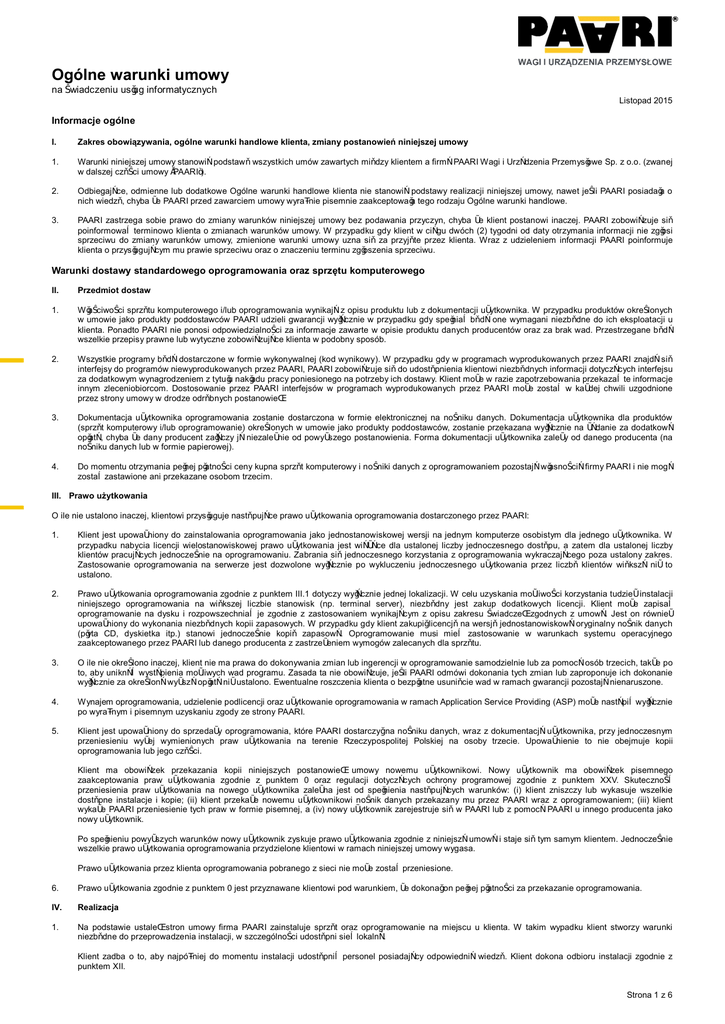 Ogólne warunki umowy na świadczeniu usług informatycznych Listopad 2015 Informacje ogólne I. Zakres obowiązywania, ogólne warunki handlowe klienta, zmiany postanowień niniejszej umowy 1. Warunki niniejszej umowy stanowią podstawę wszystkich umów zawartych między klientem a firmą PAARI Wagi i Urządzenia Przemysłowe Sp. z o.o. (zwanej w dalszej części umowy „PAARI”). 2. Odbiegające, odmienne lub dodatkowe Ogólne warunki handlowe klienta nie stanowią podstawy realizacji niniejszej umowy, nawet jeśli PAARI posiadała o nich wiedzę, chyba że PAARI przed zawarciem umowy wyraźnie pisemnie zaakceptowała tego rodzaju Ogólne warunki handlowe. 3. PAARI zastrzega sobie prawo do zmiany warunków niniejszej umowy bez podawania przyczyn, chyba że klient postanowi inaczej. PAARI zobowiązuje się poinformować terminowo klienta o zmianach warunków umowy. W przypadku gdy klient w ciągu dwóch (2) tygodni od daty otrzymania informacji nie zgłosi sprzeciwu do zmiany warunków umowy, zmienione warunki umowy uzna się za przyjęte przez klienta. Wraz z udzieleniem informacji PAARI poinformuje klienta o przysługującym mu prawie sprzeciwu oraz o znaczeniu terminu zgłoszenia sprzeciwu. Warunki dostawy standardowego oprogramowania oraz sprzętu komputerowego II. Przedmiot dostaw 1. Właściwości sprzętu komputerowego i/lub oprogramowania wynikają z opisu produktu lub z dokumentacji użytkownika. W przypadku produktów określonych w umowie jako produkty poddostawców PAARI udzieli gwarancji wyłącznie w przypadku gdy spełniać będą one wymagani niezbędne do ich eksploatacji u klienta. Ponadto PAARI nie ponosi odpowiedzialności za informacje zawarte w opisie produktu danych producentów oraz za brak wad. Przestrzegane będą wszelkie przepisy prawne lub wytyczne zobowiązujące klienta w podobny sposób. 2. Wszystkie programy będą dostarczone w formie wykonywalnej (kod wynikowy). W przypadku gdy w programach wyprodukowanych przez PAARI znajdą się interfejsy do programów niewyprodukowanych przez PAARI, PAARI zobowiązuje się do udostępnienia klientowi niezbędnych informacji dotyczących interfejsu za dodatkowym wynagrodzeniem z tytułu nakładu pracy poniesionego na potrzeby ich dostawy. Klient może w razie zapotrzebowania przekazać te informacje innym zleceniobiorcom. Dostosowanie przez PAARI interfejsów w programach wyprodukowanych przez PAARI może zostać w każdej chwili uzgodnione przez strony umowy w drodze odrębnych postanowień. 3. Dokumentacja użytkownika oprogramowania zostanie dostarczona w formie elektronicznej na nośniku danych. Dokumentacja użytkownika dla produktów (sprzęt komputerowy i/lub oprogramowanie) określonych w umowie jako produkty poddostawców, zostanie przekazana wyłącznie na żądanie za dodatkową opłatą, chyba że dany producent załączy ją niezależnie od powyższego postanowienia. Forma dokumentacji użytkownika zależy od danego producenta (na nośniku danych lub w formie papierowej). 4. Do momentu otrzymania pełnej płatności ceny kupna sprzęt komputerowy i nośniki danych z oprogramowaniem pozostają własnością firmy PAARI i nie mogą zostać zastawione ani przekazane osobom trzecim. III. Prawo użytkowania O ile nie ustalono inaczej, klientowi przysługuje następujące prawo użytkowania oprogramowania dostarczonego przez PAARI: 1. Klient jest upoważniony do zainstalowania oprogramowania jako jednostanowiskowej wersji na jednym komputerze osobistym dla jednego użytkownika. W przypadku nabycia licencji wielostanowiskowej prawo użytkowania jest wiążące dla ustalonej liczby jednoczesnego dostępu, a zatem dla ustalonej liczby klientów pracujących jednocześnie na oprogramowaniu. Zabrania się jednoczesnego korzystania z oprogramowania wykraczającego poza ustalony zakres. Zastosowanie oprogramowania na serwerze jest dozwolone wyłącznie po wykluczeniu jednoczesnego użytkowania przez liczbę klientów większą niż to ustalono. 2. Prawo użytkowania oprogramowania zgodnie z punktem III.1 dotyczy wyłącznie jednej lokalizacji. W celu uzyskania możliwości korzystania tudzież instalacji niniejszego oprogramowania na większej liczbie stanowisk (np. terminal server), niezbędny jest zakup dodatkowych licencji. Klient może zapisać oprogramowanie na dysku i rozpowszechniać je zgodnie z zastosowaniem wynikającym z opisu zakresu świadczeń zgodnych z umową. Jest on również upoważniony do wykonania niezbędnych kopii zapasowych. W przypadku gdy klient zakupił licencję na wersję jednostanowiskową oryginalny nośnik danych (płyta CD, dyskietka itp.) stanowi jednocześnie kopię zapasową. Oprogramowanie musi mieć zastosowanie w warunkach systemu operacyjnego zaakceptowanego przez PAARI lub danego producenta z zastrzeżeniem wymogów zalecanych dla sprzętu. 3. O ile nie określono inaczej, klient nie ma prawa do dokonywania zmian lub ingerencji w oprogramowanie samodzielnie lub za pomocą osób trzecich, także po to, aby uniknąć wystąpienia możliwych wad programu. Zasada ta nie obowiązuje, jeśli PAARI odmówi dokonania tych zmian lub zaproponuje ich dokonanie wyłącznie za określoną wyższą opłatą niż ustalono. Ewentualne roszczenia klienta o bezpłatne usunięcie wad w ramach gwarancji pozostają nienaruszone. 4. Wynajem oprogramowania, udzielenie podlicencji oraz użytkowanie oprogramowania w ramach Application Service Providing (ASP) może nastąpić wyłącznie po wyraźnym i pisemnym uzyskaniu zgody ze strony PAARI. 5. Klient jest upoważniony do sprzedaży oprogramowania, które PAARI dostarczył na nośniku danych, wraz z dokumentacją użytkownika, przy jednoczesnym przeniesieniu wyżej wymienionych praw użytkowania na terenie Rzeczypospolitej Polskiej na osoby trzecie. Upoważnienie to nie obejmuje kopii oprogramowania lub jego części. Klient ma obowiązek przekazania kopii niniejszych postanowień umowy nowemu użytkownikowi. Nowy użytkownik ma obowiązek pisem