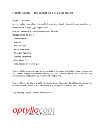 Monety Upjers – 100 monet na gry online Upjers Region: cały świat Języki: polski, angielski, niemiecki, francuski, włoski, hiszpański, portugalski, …. Platformy PC: https://pl.upjers.com Graczy: kilkanaście milionów na całym świecie. Doładowanie do gier : - Undermaster - Uptasia - My Free Zoo - Wolni Farmerzy - My Little Farmies - Zielone Imperium - Free Aqua Zoo - oraz dziesiątki innych gier. Monety Upjers możesz wymienić na walutę premium w każdej z gier producenta. Do Ciebie należy ostateczna decyzja w jaki sposób wykorzystać środki, aby maksymalnie rozbudować prowadzoną rozgrywkę. Monety Upjers to łatwy sposób na zbudowanie własnego interaktywnego imperium w świecie gier Upjers. Ciesz się nieograniczonymi przywilejami już teraz! Kup monety Upjers i zostań PREMIUM !!!