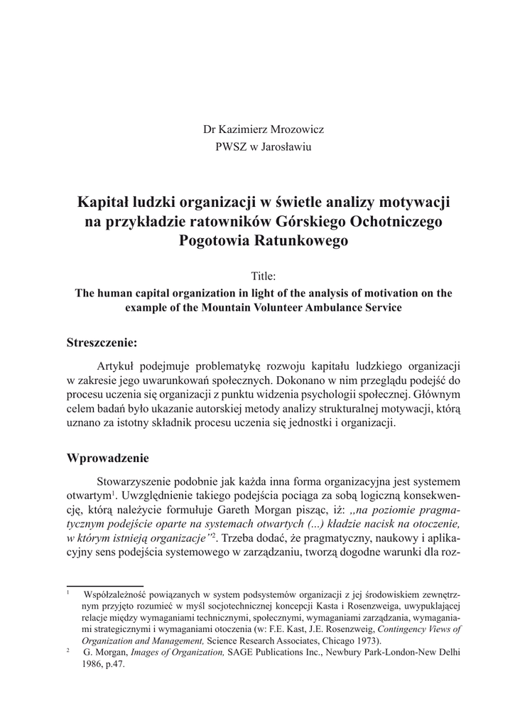 51 Dr Kazimierz Mrozowicz PWSZ w Jarosławiu Kapitał ludzki organizacji w świetle analizy motywacji na przykładzie ratowników Górskiego Ochotniczego Pogotowia Ratunkowego Title: The human capital organization in light of the analysis of motivation on the example of the Mountain Volunteer Ambulance Service Streszczenie: Artykuł podejmuje problematykę rozwoju kapitału ludzkiego organizacji w zakresie jego uwarunkowań społecznych. Dokonano w nim przeglądu podejść do procesu uczenia się organizacji z punktu widzenia psychologii społecznej. Głównym celem badań było ukazanie autorskiej metody analizy strukturalnej motywacji, którą uznano za istotny składnik procesu uczenia się jednostki i organizacji. Wprowadzenie Stowarzyszenie podobnie jak każda inna forma organizacyjna jest systemem otwartym1. Uwzględnienie takiego podejścia pociąga za sobą logiczną konsekwencję, którą należycie formułuje Gareth Morgan pisząc, iż: ,,na poziomie pragma� tycznym podejście oparte na systemach otwartych (...) kładzie nacisk na otoczenie, w którym istnieją organizacje”2. Trzeba dodać, że pragmatyczny, naukowy i aplikacyjny sens podejścia systemowego w zarządzaniu, tworzą dogodne warunki dla roz1 2 Współzależność powiązanych w system podsystemów organizacji z jej środowiskiem zewnętrznym przyjęto rozumieć w myśl socjotechnicznej koncepcji Kasta i Rosenzweiga, uwypuklającej relacje między wymaganiami technicznymi, społecznymi, wymaganiami zarządzania, wymaganiami strategicznymi i wymaganiami otoczenia (w: F.E. Kast, J.E. Rosenzweig, Contingency Views of Organization and Management, Science Research Associates, Chicago 1973). G. Morgan, Images of Organization, SAGE Publications Inc., Newbury Park-London-New Delhi 1986, p.47. 52 Kazimierz Mrozowicz woju zdolności adaptacyjnych organizacji3, stając się metodą ,,dobrego dopasowania”, należy mieć wszak na uwadze świadomość tego, że ,,w różnego typu warun� kach otoczenia potrzebne są odmienne ,,gatunki” organizacji”4. Tom Burns i George Stalker dowiedli, iż szybkość i nieprzewidywalność zmian w otoczeniu premiują elastyczne style organizacji oraz zarządzania5, zaś Paul Lawrence i Jaya Lorsch udowodnili, iż do efektywnego działania w różnych warunkach rynkowych potrzebne są zróżnicowane sposoby organizacji i zarządzania, a organizacje działające w niepewnym i niespokojnym otoczeniu muszą posiąść wyższy stopień wewnętrznego zróżnicowania6. Otoczenie organizacji samo w sobie tworzone przez zbiór jakościowo i ilościowo zróżnicowanych czynników, wpływa na wyniki działań organizacji, nakładając ograniczenia i wymuszając dostosowywania się jako cenę za jej przetrwanie7, legitymizuje się strukturalną, a także funkcjonalną determinacją zmienności. Zmiana poprzez swoją stałą obecność w działaniach organizacji stała się czymś w rodzaju elementu strukturalnego8. Wyjątkowo ciekawym i wyzywającym badawczo, a przy tym istotnym z praktycznego punktu widzenia, staje się jednostkowa percepcja zmiany9 oraz psychologiczne uwarunkowania towarzyszących jej zjawisk i procesów. Psychologia różnic indywidualnych umożliwia dogłębniejszą eksplorację psychologicznej partycypacji jednostki w procesach społecznych i organizacyjnych, co sprawia, że staje się możliwym wyjście na rozleglejszy, niż wyłącznie badanie postaw jednostki wobec zmian organizacyjnych, obszar badawczy i analiza zagadnienia zdolności adaptacyjnych organizacji w pryzmacie jakości jej kapitału ludzkiego. Termin ,,kapitał ludzki” został wprowadzony do nauki przez Theodore Schultza10, który pisał: ,,zdolności ludzkie mogą być wrodzone lub nabyte. Cechy (...), które są cenione i mogą być rozwijane dzięki odpowiednim inwestycjom, będą 3 4 5 6 7 8 9 10 Przykłady zastosowania ogólnej teorii systemów w badaniach nad organizacjami można znaleźć w: D. Katz, R.L. Kahn, The Social Psychology of Organization, John Wiley, New York 1978; F.E. Kast, J.E. Rosenzweig, Contingency Views of Organization and Management, Science Research Associates, Chicago 1973; M. Beer, Organization Change and Development, Goodyear, Santa Monica 1980. G. Morgan, op. cit., p.51. T. Burns, G.M. Stalker, The Management of Innovation, Tavistock, London 1961. P. Lawrence, J. Lorsch, Organization and Environment, Harvard Graduate School Business Administration, Cambridge, Mass. 1967 i P. Lawrence, J. Lorsch, Differentiation and Integration in Complex Organizations, ,,Administrative Science Quarterly”, nr 12, 1967, pp.1-77. Na temat złożoności struktury i funkcji otoczenia w: M.J. Hatch, Teoria organizacji, Wyd. Naukowe PWN, Warszawa 2002, s.77-106. M. Armstrong, Zarządzanie zasobami ludzkimi, Oficyna Ekonomiczna, Kraków 2005, s.295-311. K. Mrozowicz, Zmiany organizacyjne w świetle postaw ratowników pogotowia górskiego, w: S. Lachiewicz (red.), Teoria i praktyka zarządzania rozwojem organizacji, Monografie Politechniki Łódzkiej, Łódź 2008, nr 1197, s.363-373. T.W. Schultz, Investment in Human Capital, ,,American Economic Review”, LI, March 1961, pp.117. Kapitał ludzki organizacji w świetle analizy motywacji... 53 stanowić kapitał ludzki”11. W tej właśnie postaci został zaadaptowany przez autora niniejszego artykułu. W naszkicowanej powyżej perspektywie badawczej, celem przewodnim podjętych analiz uczyniono znaczenie motywacji12 w podejmowaniu i pełnieniu ról społeczno-zawodowych13. Przyjęto przy tym założenie, że motywacja – ujmowana teoretycznie jako instrument wpływu, treść działania i proces14 – jest podstawową determinantą efektywności działania na poziomie jednostkowym i organizacyjnym. Po wtóre, założono, że jest ona podstawowym korelatem implementacji zmian organizacyjnych, stanowiąc jedno ze źródeł sprawnego i skutecznego ich wdrażania. Po trzecie, motywacja jako stymulanta procesu uczenia się i modelowania zachowań stanow