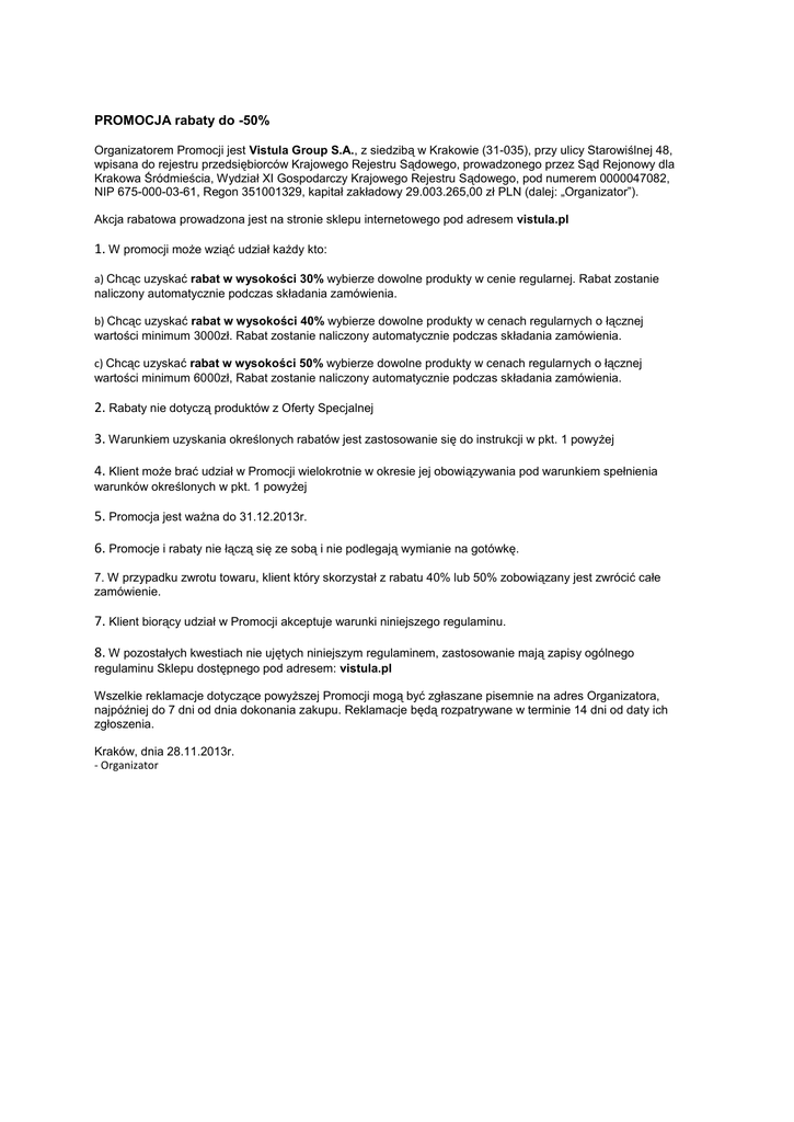 PROMOCJA rabaty do -50% Organizatorem Promocji jest Vistula Group S.A., z siedzibą w Krakowie (31-035), przy ulicy Starowiślnej 48, wpisana do rejestru przedsiębiorców Krajowego Rejestru Sądowego, prowadzonego przez Sąd Rejonowy dla Krakowa Śródmieścia, Wydział XI Gospodarczy Krajowego Rejestru Sądowego, pod numerem 0000047082, NIP 675-000-03-61, Regon 351001329, kapitał zakładowy 29.003.265,00 zł PLN (dalej: „Organizator”). Akcja rabatowa prowadzona jest na stronie sklepu internetowego pod adresem vistula.pl 1. W promocji może wziąć udział każdy kto: a) Chcąc uzyskać rabat w wysokości 30% wybierze dowolne produkty w cenie regularnej. Rabat zostanie naliczony automatycznie podczas składania zamówienia. b) Chcąc uzyskać rabat w wysokości 40% wybierze dowolne produkty w cenach regularnych o łącznej wartości minimum 3000zł. Rabat zostanie naliczony automatycznie podczas składania zamówienia. c) Chcąc uzyskać rabat w wysokości 50% wybierze dowolne produkty w cenach regularnych o łącznej wartości minimum 6000zł, Rabat zostanie naliczony automatycznie podczas składania zamówienia. 2. Rabaty nie dotyczą produktów z Oferty Specjalnej 3. Warunkiem uzyskania określonych rabatów jest zastosowanie się do instrukcji w pkt. 1 powyżej 4. Klient może brać udział w Promocji wielokrotnie w okresie jej obowiązywania pod warunkiem spełnienia warunków określonych w pkt. 1 powyżej 5. Promocja jest ważna do 31.12.2013r. 6. Promocje i rabaty nie łączą się ze sobą i nie podlegają wymianie na gotówkę. 7. W przypadku zwrotu towaru, klient który skorzystał z rabatu 40% lub 50% zobowiązany jest zwrócić całe zamówienie. 7. Klient biorący udział w Promocji akceptuje warunki niniejszego regulaminu. 8. W pozostałych kwestiach nie ujętych niniejszym regulaminem, zastosowanie mają zapisy ogólnego regulaminu Sklepu dostępnego pod adresem: vistula.pl Wszelkie reklamacje dotyczące powyższej Promocji mogą być zgłaszane pisemnie na adres Organizatora, najpóźniej do 7 dni od dnia dokonania zakupu. Reklamacje będą rozpatrywane w terminie 14 dni od daty ich zgłoszenia. Kraków, dnia 28.11.2013r. - Organizator