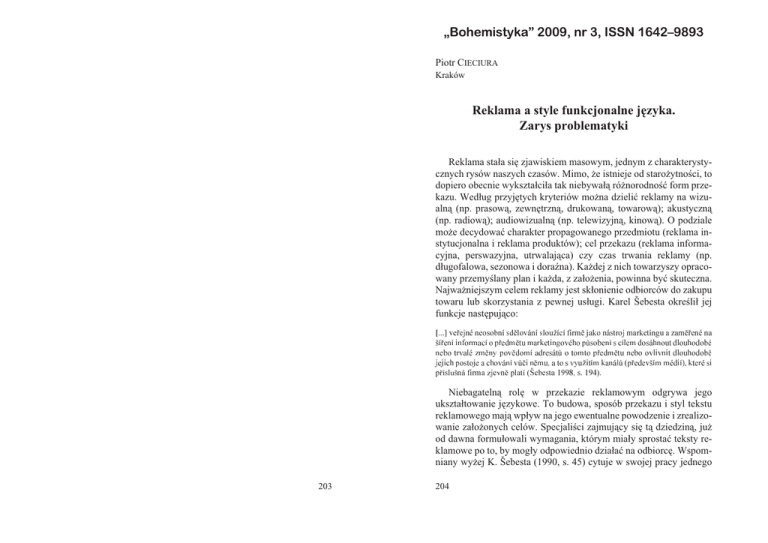 celów. Problem stylu reklamy jest przedmiotem badañ czeskich i polskich lingwistów ju¿ od kilkudziesiêciu lat. Mimo wielu publikacji