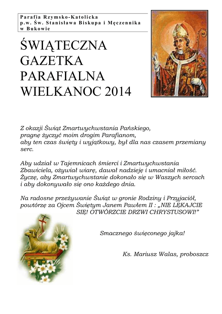 Parafia Rzymsko-Katolicka p.w. Św. Stanisława Biskupa i Męczennika w Bukowie ŚWIĄTECZNA GAZETKA PARAFIALNA WIELKANOC 2014 Z okazji Świąt Zmartwychwstania Pańskiego, pragnę życzyć moim drogim Parafianom, aby ten czas święty i wyjątkowy, był dla nas czasem przemiany serc. Aby udział w Tajemnicach śmierci i Zmartwychwstania Zbawiciela, ożywiał wiarę, dawał nadzieję i umacniał miłość. Życzę, aby Zmartwychwstanie dokonało się w Waszych sercach i aby dokonywało się ono każdego dnia. Na radosne przeżywanie Świąt w gronie Rodziny i Przyjaciół, powtórzę za Ojcem Świętym Janem Pawłem II : „NIE LĘKAJCIE SIĘ! OTWÓRZCIE DRZWI CHRYSTUSOWI!” Smacznego święconego jajka! Ks. Mariusz Walas, proboszcz 2 7 kw i e t n i a 2 0 1 4 r o k u b ę d z i e w i e l k i m d n i e m Najważniejsze fakty z życia Papieża Jana Pawła II 18 maja 1920 (ok. 17 – 18) w Wadow icach 20 czerw ca 1920 15 w rześnia 1926 13 kw ietnia 1929 25 maja 1930 1 w rześnia 1929 5 grudni a 1932 - prz ychodzi na św iat Karol Wojtyła - 14 maja 1938 2 paździ ernika 1938 18 lutego 1941 Paździ ernik 1942 1 listopada 1946 15 listopada 1946 16 grudnia 1948 28 w rześnia 1958 30 grudnia 1963 28 czerw ca 1967 14 października 1978 16 października 1978 o godz. 18.00 - - Karol Wojtyła zostaje ochrzczony rozpoczyna naukę w szkole powszechnej umiera Emilia W ojtyła, matka Karola W ojtyły Karol przystępuje do I Komunii Świętej rozpoczyna naukę w Gimnazjum Męskim umiera na szkarlatynę 26-letni brat Karola, Edmund Karol zdaje maturę z religii, j. polskiego, łacińskiego, greckiego i niemieckiego, otrzymując oceny bardzo dobre Karol rozpoczyna studia polonistyczne na Uniwersytetu Jagiellońskiego; po roku studiów UJ zostaje zamknięty umiera ojciec Karola W ojtyły, Karol Karol Wojtyła w stępuje do Krakow skiego Seminarium Duchow nego, które działa w konspiracji Karol Wojtyłą przyjmuje św ięcenia kapłańskie z rąk arcybiskupa Sapiehy wyjeżdża do Rzymu kontynuować studia teologiczne otrzymuje tytuł doktora teologii; następnie wraca do Krakowa Karol Wojtyła prz yjmuje św ięcenia biskupie papież Paw eł VI mianuje Go Arc ybiskupem Metropolitą Krakowskim Karol Wojtyła otrzymuje z rąk papieża Paw ła VI biret kardynalski rozpoczyna się konklawe po śmierci papieża Jana Pawła I; gdy staje się jasne, że kardynał W ojtyła może zostać papieżem, prymas W yszyński radzi Mu: „Przyjmij! Ten wybór i ten krzyż, który jest z nim związany.” nad Kaplicą Sykstyńską pojawia się biały dym, - a chwilę potem kardynał Felici odnajmuje „HABEMUS PAPAM.” Karol Wojtyła zostaje w ybrany 265 papieżem i prz yjmuje imię Jan Paw eł II 2 22 października 1978 25 st ycznia 1979 2 czerw ca 1979 16 grudnia 1980 13 maja 1981 6 kw ietnia 1982 16 czerw ca 1983 8 czerw ca 1987 17 lipca 1989 1 czerw ca 1991 13 sierpnia 1991 7 grudni a 1992 26 grudnia 1994 31 maja 1997 5 czerw ca 1999 16 sierpnia 2002 31 st ycznia 2005 1 kw ietnia 2005 2 kw ietnia 2005 o godz. 21.37 1 maja 2011r. w Św ięto Miłosierdzia Bożego o godz. 10.37 uroczysta inauguracja pontyfikatu, podczas której - papież Polak wypowiada słynne „NIE LĘKAJCIE SIĘ. OTWÓRZCIE DRZWI CHRYSTUSOWI!” - Jan Paweł II rozpoczyna swoją pierwszą zagraniczną podróż – na Dominikanę i do Meksyku - pierwsza pielgrzymka Papieża do Polski - Papież pisze list do Breżniewa w obronie Polski i „Solidarności” - zamach na Ojca Świętego - Jan Paweł II w liście do gen. Jaruzelskiego zwraca się o poszanowanie praw człowieka i narodu - rozpoczyna się druga pielgrzymka do Ojczyzny - trzecia pielgrzymka Papieża do Polski - Polska nawiązuje oficjalne stosunki dyplomatyczne z W atykanem - czwarta wizyta Jana Pawła II w Ojczyźnie - Ojciec Święty po raz kolejny przylatuje do Polski, tym razem na spotkanie z młodzieżą na Jasnej Górze w ramach Światowych Dni Młodzieży - ogłoszenie pierwszego od ponad 400 lat Katechizmu Kościoła Katolickiego - amerykański tygodnik „TIME” ogłasza Papieża Człowiekiem Roku - Jan Paweł II po raz szósty odwiedza Ojczyznę - początek siódmej wizyty Papieża w Polsce - Ojciec Święty po raz ósmy przyjeżdża do Ojczyzny; następnego dnia podczas Mszy Świętej w Łagiewnikach powierza świat Miłosierdziu Bożemu - pogarsza się stan zdrowia Jana Pawła II - stan Ojca Świętego jest bardzo poważny (trudności z oddychaniem, niestabilne ciśnienie, niewydolność serca, krążenia i nerek) - papież Jan Paw eł II umiera z następującymi słowami na ustach: „SZUKAŁEM W AS, TERAZ PRZYSZLIŚCIE DO MNIE I ZA TO W AM DZIĘKUJĘ.” papież Benedykt XVI wypowiedział po łacinie formułę: „Mocą naszej władzy apostolskiej zezwalamy, aby Czcigodnemu Słudze Bożemu, Janowi Pawłowi II, papieżowi, przysługiwał - tytuł błogosławionego". Po czym dodał, że liturgiczne wspomnienie nowego błogosławionego obchodzone będzie 22 października (w rocznicę inauguracji pontyfikatu). 27 kwietnia 2014 roku Papież Polak zostanie ogłoszony świętym 3 Jaka jest różnica między beatyfikacją a kanonizacją? Zarówno beatyfikacja, jak i kanonizacja oznaczają docenienie zasług wybranych przez Kościół i jego wiernych ludzi. Są również wielkim zaszczytem, gdyż oficjalnie ogłaszają, iż dana osoba godna jest naśladowania i w szczególny sposób spodobała się Bogu. Jeśli dana osoba zostaje beatyfikowana, oznacza to, że możemy traktować ją jako błogosławioną. Natomiast kanonizacja wiąże się z uznaniem świętości danej osoby. Najczęściej proces ten przebiega etapami, a więc – najpierw dokonuje się beatyfikacji, a następnie kanonizacji, jednak czasami albo z woli ludu, albo poprzez dokonywane za pośrednictwem owej osoby cuda proponuje się od razu ogłoszenie jej świętą. Cuda Jana Pawła II Do beatyfikacji, spośród ogromnej liczby sygnałów o doznanych łaskach, wybrany został przypadek niewytłumaczalnego z medycznego 