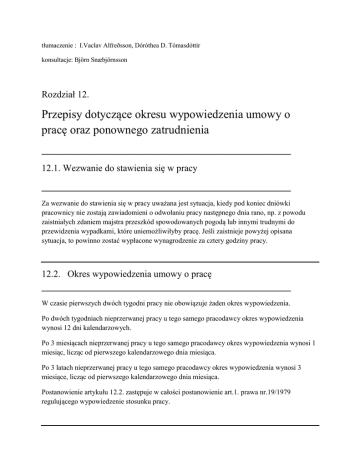 tłumaczenie : I.Vaclav Alfreðsson, Dóróthea D. Tómasdóttir konsultacje: Björn Snæbjörnsson Rozdział 12. Przepisy dotyczące okresu wypowiedzenia umowy o pracę oraz ponownego zatrudnienia _____________________________________________________ 12.1. Wezwanie do stawienia się w pracy _____________________________________________________ Za wezwanie do stawienia się w pracy uważana jest sytuacja, kiedy pod koniec dniówki pracownicy nie zostają zawiadomieni o odwołaniu pracy następnego dnia rano, np. z powodu zaistniałych zdaniem majstra przeszkód spowodowanych pogodą lub innymi trudnymi do przewidzenia wypadkami, które uniemożliwiłyby pracę. Jeśli zaistnieje powyżej opisana sytuacja, to powinno zostać wypłacone wynagrodzenie za cztery godziny pracy. 12.2. Okres wypowiedzenia umowy o pracę _____________________________________________________ W czasie pierwszych dwóch tygodni pracy nie obowiązuje żaden okres wypowiedzenia. Po dwóch tygodniach nieprzerwanej pracy u tego samego pracodawcy okres wypowiedzenia wynosi 12 dni kalendarzowych. Po 3 miesiącach nieprzerwanej pracy u tego samego pracodawcy okres wypowiedzenia wynosi 1 miesiąc, licząc od pierwszego kalendarzowego dnia miesiąca. Po 3 latach nieprzerwanej pracy u tego samego pracodawcy okres wypowiedzenia wynosi 3 miesiące, licząc od pierwszego kalendarzowego dnia miesiąca. Postanowienie artykułu 12.2. zastępuje w całości postanowienie art.1. prawa nr.19/1979 regulującego wypowiedzenie stosunku pracy. 12.3. Procedura postępowania przy wypowiedzeniu 12.3.1. Objaśnienia ogólne dotyczące wypowiedzenia Okres wypowiedzenia obowiązuje obydwie strony. Każde wypowiedzenie powinno być sporządzone pisemnie oraz w tym samym języku, w którym została sporządzona umowa o pracę. 12.3.2. Rozmowa o powodach wypowiedzenia Pracownik ma prawo do rozmowy dotyczącej ustania jego stosunku pracy oraz do rozmowy o powodach wypowiedzenia. Prośba o taką rozmowę powinna być przedłożona w ciągu czterech dni od chwili wręczenia wypowiedzenia i powinna się odbyć w ciągu czterech dni licząc od dnia jej przedłożenia. Pracownik może sobie życzyć zaraz po zakończeniu rozmowy lub w ciągu czterech dni od jej przeprowadzenia otrzymania pisemnego uzasadnienia wypowiedzenia. Jeśli pracodawca przychyli się do powyższego życzenia pracownika, to wręczenie pisemnego uzasadnienia wypowiedzenia pracy powinno nastąpić w ciągu następnych czterech dni od chwili wyrażenia takiego życzenia. Jeśli pracodawca nie przychyli się do wyżej wymienionego życzenia pracownika, to ma on prawo do odbycia drugiej rozmowy z pracodawcą o powodach wypowiedzenia. Rozmowa taka, jeśli pracownik sobie życzy, może odbyć się w obecności męża zaufania lub przedstawiciela związku zawodowego, do którego pracownik należy. 12.3.3. Przepisane prawem ograniczenia dotyczące prawa do wypowiedzenia Podczas wypowiedzeń należy przestrzegać przepisów prawnych, które ograniczają niezawisłe prawo pracodawcy do wypowiedzenia pracy, m.in. w stosunku do mężów zaufania, mężów zaufania do spraw bezpieczeństwa i higieny pracy, kobiet w ciąży, rodziców na urlopach rodzicielskich, pracowników zgłaszających chęć wykorzystania urlopu macierzyńskiego lub urlopu rodzicielskiego, a także pracowników odpowiedzialnych za rodzinę. Należy także stosować się do przepisów zawartych w artykule 4. prawa nr. 80/1938, dotyczącego związków zawodowych i konfliktów w miejscu pracy, prawa o równouprawnieniu mężczyzn i kobiet, prawa dotyczącego pracowników zatrudnionych w niepełnym wymiarze godzin oraz prawa określającego sytuację prawną pracowników w przypadku zmiany strony reprezentującej firmę. Należy również przestrzegać prawa nakazującego odbycie konsultacji w przypadku zwolnień grupowych. Jeśli, zgodnie z prawem, pracownika dotyczy przepis ograniczający zastosowanie wobec niego wypowiedzenia stosunku pracy, to na pracodawcy spoczywa obowiązek pisemnego uzasadnienia wypowiedzenia. 12.3.4. Sankcje Nieprzestrzeganie przepisów zawartych w powyższym rozdziale może stanowić podstawę do wszczęcia sprawy roszczeniowej o odszkodowanie za ewentualnie zaistniałe szkody zgodnie z powszechnie obowiązującymi przepisami prawa Kodeksu Cywilnego. _____________________________________________________ 12.4. Przeniesienie na inne stanowisko pracy _____________________________________________________ Jeśli pracownik, który został zatrudniony do wykonywania określonych obowiązków, lub który przepracował na danym stanowisku bez przerwy przez okres co najmniej jednego roku zostałby przeniesiony na inne stanowisko pracy, gdzie stawka wynagrodzenia jest niższa niż na stanowisku, na którym był zatrudniony poprzednio, to ma on prawo do wynagrodzenia zgodnego z poprzednimi stawkami przez okres równy okresowi wypowiedzenia; chyba, że pracownik został uprzedzony o planowanej zmianie stanowiska pracy z wyprzedzeniem odpowiadającym okresowi wypowiedzenia. Powyższe nie obowiązuje w przypadku wykonywania czynności, za które wypłaca się wynagrodzenie na podstawie różnych stawek, a pracownicy kierowani są na różne stanowiska pracy zgodnie ze zwyczajem oraz charakterem pracy w danym zakładzie. 12.5. Koniec okresu zatrudnienia Jeśli pracownikowi wypowiada się pracę po okresie co najmniej 10 lat nieprzerwanej pracy u tego samego pracodawcy, to okres wypowiedzenia wynosi cztery miesiące jeśli pracownik osiągnął wiek 55 lat; 5 miesięcy jeśli pracownik osiągnął wiek 60 lat i 6 miesięcy po osiągnięciu 63 roku życia. Pracownik może natomiast wypowiedzieć umowę o pracę z trzymiesięcznym wyprzedzeniem. 12.6. Przywileje wynikające ze stażu pracy 12.6.1.Wypracowane przywileje wynikające ze stażu pracy powinny zostać zachowane, kiedy ponowne zatrudnienie nastąpi w przeciągu jednego roku. Jeśli ponowne zatrudnienie nastąpi po upływie jednego roku, ale przed upływem tr