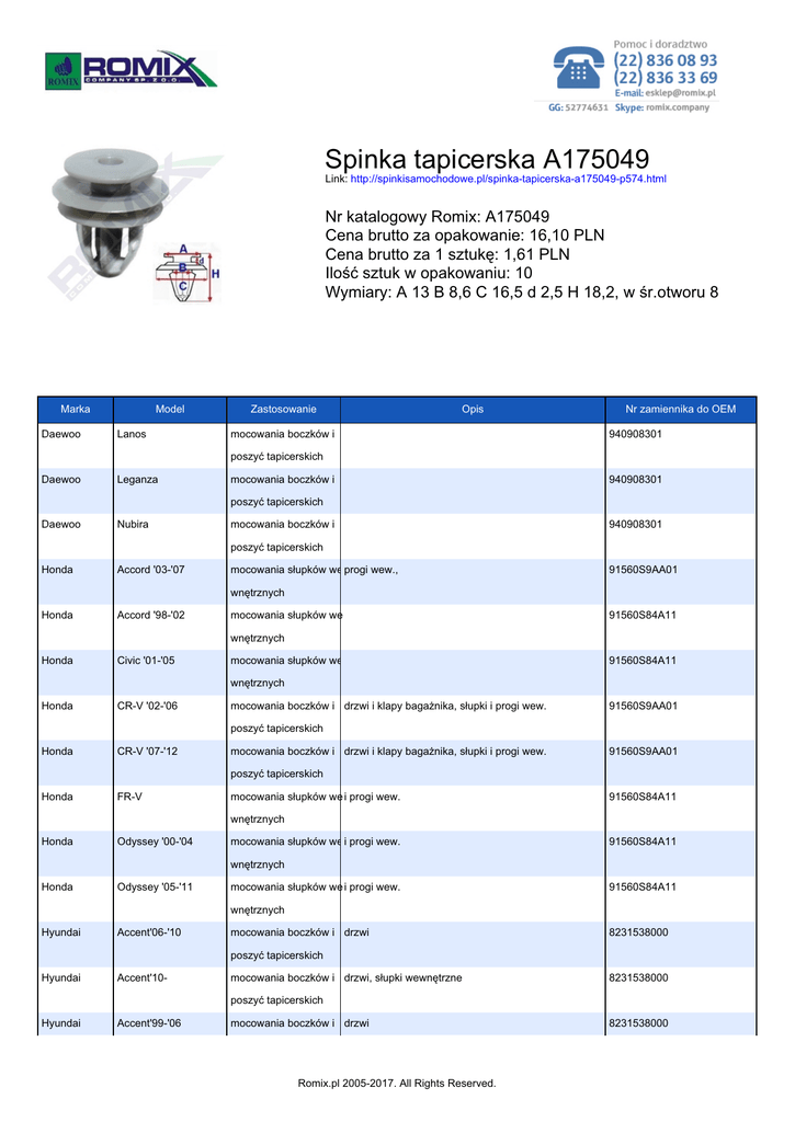 Spinka tapicerska A175049 Link: http://spinkisamochodowe.pl/spinka-tapicerska-a175049-p574.html Nr katalogowy Romix: A175049 Cena brutto za opakowanie: 16,10 PLN Cena brutto za 1 sztukę: 1,61 PLN Ilość sztuk w opakowaniu: 10 Wymiary: A 13 B 8,6 C 16,5 d 2,5 H 18,2, w śr.otworu 8 Marka Daewoo Model Lanos Zastosowanie Opis mocowania boczków i Nr zamiennika do OEM 940908301 poszyć tapicerskich Daewoo Leganza mocowania boczków i 940908301 poszyć tapicerskich Daewoo Nubira mocowania boczków i 940908301 poszyć tapicerskich Honda Accord '03-'07 mocowania słupków we progi wew., 91560S9AA01 wnętrznych Honda Accord '98-'02 mocowania słupków we 91560S84A11 wnętrznych Honda Civic '01-'05 mocowania słupków we 91560S84A11 wnętrznych Honda CR-V '02-'06 mocowania boczków i drzwi i klapy bagażnika, słupki i progi wew. 91560S9AA01 poszyć tapicerskich Honda CR-V '07-'12 mocowania boczków i drzwi i klapy bagażnika, słupki i progi wew. 91560S9AA01 poszyć tapicerskich Honda FR-V mocowania słupków we i progi wew. 91560S84A11 wnętrznych Honda Odyssey '00-'04 mocowania słupków we i progi wew. 91560S84A11 wnętrznych Honda Odyssey '05-'11 mocowania słupków we i progi wew. 91560S84A11 wnętrznych Hyundai Accent'06-'10 mocowania boczków i drzwi 8231538000 poszyć tapicerskich Hyundai Accent'10- mocowania boczków i drzwi, słupki wewnętrzne 8231538000 poszyć tapicerskich Hyundai Accent'99-'06 mocowania boczków i drzwi Romix.pl 2005-2017. All Rights Reserved. 8231538000 poszyć tapicerskich Hyundai Elantra'00-'06 mocowania boczków i drzwi, słupki wewnętrzne 858493B000 poszyć tapicerskich Hyundai Elantra'06-'10 mocowania boczków i drzwi, słupki wewnętrzne 858493B000 poszyć tapicerskich Hyundai Getz mocowania boczków i drzwi, słupki wewnętrzne 823152P000 poszyć tapicerskich Hyundai i10'07-'12 mocowania boczków i drzwi 823152P000 poszyć tapicerskich Hyundai i20 '08'12 mocowania boczków i drzwi, słupki wewnętrzne 823152P000 poszyć tapicerskich Hyundai i30'07-'11 mocowania boczków i drzwi, słupki wewnętrzne 823152P000 poszyć tapicerskich Hyundai ix35/Tuscon'10- mocowania boczków i drzwi, słupki wewnętrzne 823152P000 poszyć tapicerskich Hyundai ix55/Veracruz'06- spinki bagażnika boczki tapicerskie Hyundai Santa Fe '06-'12 mocowania boczków i drzwi 858493B000 8231538000 poszyć tapicerskich Hyundai Santa Fe'00-'06 mocowania boczków i drzwi, słupki wewnętrzne 8231538000 poszyć tapicerskich Hyundai Sonata'05-'10 mocowania boczków i drzwi 8231538000 poszyć tapicerskich Hyundai Sonata'98-'05 mocowania boczków i drzwi 8231538000 poszyć tapicerskich Hyundai Tuscon '04-'10 mocowania boczków i drzwi, słupki wewnętrzne 858493B000 poszyć tapicerskich Kia Carnival '06-'10 mocowania boczków i drzwi 858493B000 poszyć tapicerskich Kia Carnival'99-'06 mocowania boczków i drzwi, słupki wewnętrzne, tapicerka klapy bagażn poszyć tapicerskich Kia Ceed'06-'12 Kia Cerato '03-'08 ika mocowania boczków i drzwi, boczki tapicerskie bagażnika, tapicerka k poszyć tapicerskich 8231538000 858493B000 lapy bagażnika mocowania boczków i drzwi, tapicerka klapy bagażnika 858493B000 poszyć tapicerskich Kia Optima '05-'10 mocowania boczków i drzwi 858493B000 poszyć tapicerskich Kia Picanto '04-'10 spinki bagażnika boczki tapicerskie Kia Rio '00-'05 mocowania boczków i drzwi, boczki tapicerskie bagażnika 858493B000 858493B000 poszyć tapicerskich Kia Rio'05-'11 mocowania boczków i drzwi, słupki wewnętrzne 858493B000 poszyć tapicerskich Kia Sorento '02-'09 mocowania boczków i drzwi, boczki tapicerskie bagażnika, tapicerka k poszyć tapicerskich Kia Sorento'09- 858493B000 lapy bagażnika mocowania boczków i drzwi, słupki wewnętrzne Romix.pl 2005-2017. All Rights Reserved. 858493B000 poszyć tapicerskich Kia Soul'08- mocowania boczków i drzwi, boczki tapicerskie bagażnika 858493B000 poszyć tapicerskich Kia Sportage '04-'10 mocowania boczków i drzwi, słupki wewnętrzne, boczki tapicerskie bag poszyć tapicerskich Kia Sportage'10- 858493B000 ażnika mocowania boczków i drzwi 858493B000 poszyć tapicerskich Mazda 2'03-'07 mocowania boczków i drzwi G35068AB1 poszyć tapicerskich Mazda 2'07- mocowania boczków i drzwi G35068AB1 poszyć tapicerskich Mazda 6 '02-'07 mocowania boczków i drzwi G35068AB1 poszyć tapicerskich Mazda 6 '07-'13 mocowania boczków i drzwi G35068AB1 poszyć tapicerskich Mazda 626 '97-'01 mocowania boczków i drzwi G35068AB1 poszyć tapicerskich Mazda CX-7 mocowania boczków i drzwi G35068AB1 poszyć tapicerskich Mazda CX-9 mocowania boczków i drzwi G35068AB1 poszyć tapicerskich Mazda Xedos-9 mocowania boczków i drzwi G35068AB1 poszyć tapicerskich Mitsubishi Outlander '06-'12 mocowania słupków we + inne spinki 7259A013 wnętrznych Subaru Forester '02-'07 mocowania słupków we 909130034 wnętrznych Subaru Legacy '98-'03 mocowania boczków i drzwi poszyć tapicerskich Romix.pl 2005-2017. All Rights Reserved. 909130034