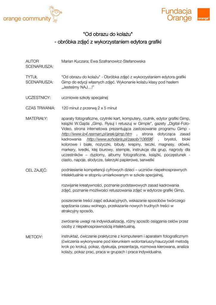 "Od obrazu do kolażu" - obróbka zdjęć z wykorzystaniem edytora grafiki AUTOR SCENARIUSZA: Marian Kuczara; Ewa Szafranowicz-Stefanowska TYTUŁ SCENARIUSZA: "Od obrazu do kolażu" - Obróbka zdjęć z wykorzystaniem edytora grafiki Gimp do edycji własnych zdjęć. Wykonanie kolażu klasy pod hasłem „Jesteśmy NAJ…!” UCZESTNICY: uczniowie szkoły specjalnej CZAS TRWANIA: 120 minut z przerwą 2 x 5 minut MATERIAŁY: aparaty fotograficzne, czytniki kart, komputery, rzutnik, edytor grafiki Gimp, książki W.Gajda „Gimp. Rysuj i retuszuj w Gimpie", gazety „Digital-FotoVideo, strona internetowa prezentująca zastosowanie programu Gimp http://www.lo4.resman.pl/arek/gimp.htm , strona dotycząca zasad kadrowania http://www.scholaris.pl/zasob/106696 , brystol, bloki kolorowe i białe, nożyczki, bibuły, krepiny, teczki, magnesy, ołówki, markery, kredki, klej biurowy, stemple, instrukcje dla grup, nagrody dla uczestników – dyplomy, albumy fotograficzne, książki, poczęstunek ciasto, napoje, słodycze, talerzyki papierowe, serwetki CEL ZAJĘĆ: podniesienie kompetencji cyfrowych dzieci – uczniów niepełnosprawnych intelektualnie w stopniu umiarkowanym w szkole specjalnej, rozwijanie kreatywności, poznanie podstawowych zasad kadrowania zdjęć, poznanie możliwości retuszowania zdjęć w edytorze grafiki Gimp, poszerzenie treści zajęć edukacyjnych, wskazanie sposobów twórczego spędzania czasu wolnego, przekazanie nowych trudnych treści w atrakcyjny sposób, zwrócenie uwagi na indywidualizację, różny sposób osiągania celów przez osoby z niepełnosprawnością intelektualną. METODY: instruktaż, ćwiczenie praktyczne z komputerem i aparatem fotograficznym (ćwiczenia wykonywane pod kierunkiem wolontariuszy/nauczycieli metodą krok po kroku), pokaz, dyskusja, prezentacja, rozmowa kierowana, analiza kolaży, pokaz prac, praca w grupach i praca indywidualna. PRZEBIEG ZAJĘĆ: WSTĘP 1. Powitanie uczestników zajęć i zajęcie miejsc – przedstawienie się nawzajem, przedstawienie nauczycieli, lidera i wolontariuszy „Orange". 2. Wprowadzenie do zajęć. Zapoznanie z jej głównymi celami. /uczestnicy siadają razem przy wspólnym stole/. Nauczyciel przedstawia cele w formie prezentacji multimedialnej. 3. Rozdanie uczniom gazet „Digital-Foto-Video". Przeglądanie, wspólne omawianie fotografii. Rozróżnianie zdjęć portretowych od architektury, martwej natury, panoramy. /Na wykonanie zadań ze wstępu 10 min/. ZAJĘCIA WŁAŚCIWE 1. Podział na grupy – uczniowie losują cukierki z koszyczka. Dobierają się w pary wg koloru wylosowanego cukierka. 2. Wybór liderów poszczególnych grup. 3. Przedstawienie za pomocą strony internetowej http://www.scholaris.pl/zasob/106696 podstawowych zasad kadrowania zdjęć, zasad wykonywania zdjęć portretowych w zależności od typu oświetlenia – z boku, z góry, z dołu. Omówienie przedstawionych efektów. 4. Losowanie instrukcji wykonania zdjęć. Instrukcje zawierają krótkie informacje przedstawienia się na zdjęciach, np. Jesteś właścicielem strasznego zamku – twój autoportret musi wyglądać groźnie, jesteś klownem - twój autoportret musi wyglądać zabawnie, jesteś księżniczką - twój autoportret musi wyglądać romantycznie, itp. 5. Praca w grupach wg wylosowanej instrukcji. Uczniowie ustawiają się pod ścianą, odgrywają scenki i przyjmują wylosowane w instrukcji pozy. Wykonują kilka ujęć portretowych. 6. Uczniowie siadają do komputerów. Przerzucają zdjęcia z aparatu na komputer. Na rzutniku zostaną pokazane krok po kroku czynności do wykonania, korzystając ze źródła http://www.lo4.resman.pl/arek/gimp.htm. Dodatkowym wsparciem i instruktażem służy książka W. Gajda „Gimp. Rysuj i retuszuj w Gimpie", z której uczniowie mogą w każdej chwili korzystać. 7. Uczniowie wybierają najlepsze zdjęcie. 8. Praca z edytorem grafiki Gimp – redukcja ewentualnych czerwonych oczu, dodawanie wyrazistości zdjęciom, zabawa z filtrami (typu Gaussa), dodawanie efektów specjalnych. Na rzutniku będą pokazane krok po kroku czynności do wykonania. 9. Drukowanie prac. /Na wykonanie zadań 1-9 z zajęć właściwych 60 min/. 10. Uczniowie siadają do wspólnego dużego stolika. Otrzymują materiały papiernicze, potrzebne przybory. Pracując w dalszym ciągu w grupach, przystępują do projektowania kolażu z wydrukowanych zdjęć. Wycinają litery, tną papier, układają, kleją, piszą, naklejają wylosowane hasła z instrukcji. Naklejają na karton i powstają kolaże. 11. Przedstawienie przez lidera grupy przygotowanych kolaży./Na wykonanie zadań 10-11 z zajęć właściwych 30 min/. ZAKOŃCZENIE 1. Wyeksponowanie kolaży na korytarzu szkolnym na tablicach ściennych. 2. Podsumowanie pracy. 3. Nagrodzenie pracy uczniów przez zaproszonego Dyrektora Szkoły. Wręczenie okolicznościowych nagród. 4. Podziękowanie i pożegnanie uczestników. Na wykonanie zadania 20 min/