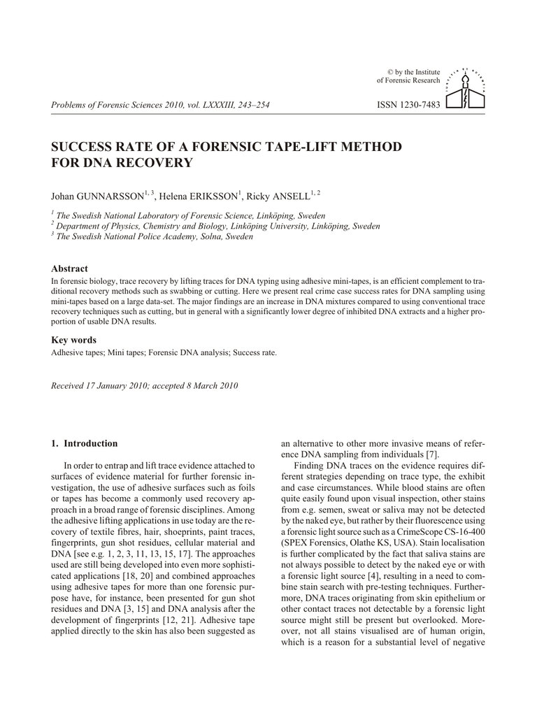 © by the Institute of Forensic Research ISSN 1230-7483 Problems of Forensic Sciences 2010, vol. LXXXIII, 243–254 SUCCESS RATE OF A FORENSIC TAPE-LIFT METHOD FOR DNA RECOVERY Johan GUNNARSSON1, 3, Helena ERIKSSON1, Ricky ANSELL1, 2 1 The Swedish National Laboratory of Forensic Science, Linköping, Sweden Department of Physics, Chemistry and Biology, Linköping University, Linköping, Sweden 3 The Swedish National Police Academy, Solna, Sweden 2 Abstract In forensic biology, trace recovery by lifting traces for DNA typing using adhesive mini-tapes, is an efficient complement to traditional recovery methods such as swabbing or cutting. Here we present real crime case success rates for DNA sampling using mini-tapes based on a large data-set. The major findings are an increase in DNA mixtures compared to using conventional trace recovery techniques such as cutting, but in general with a significantly lower degree of inhibited DNA extracts and a higher proportion of usable DNA results. Key words Adhesive tapes; Mini tapes; Forensic DNA analysis; Success rate. Received 17 January 2010; accepted 8 March 2010 1. Introduction In order to entrap and lift trace evidence attached to surfaces of evidence material for further forensic investigation, the use of adhesive surfaces such as foils or tapes has become a commonly used recovery approach in a broad range of forensic disciplines. Among the adhesive lifting applications in use today are the recovery of textile fibres, hair, shoeprints, paint traces, fingerprints, gun shot residues, cellular material and DNA [see e.g. 1, 2, 3, 11, 13, 15, 17]. The approaches used are still being developed into even more sophisticated applications [18, 20] and combined approaches using adhesive tapes for more than one forensic purpose have, for instance, been presented for gun shot residues and DNA [3, 15] and DNA analysis after the development of fingerprints [12, 21]. Adhesive tape applied directly to the skin has also been suggested as an alternative to other more invasive means of reference DNA sampling from individuals [7]. Finding DNA traces on the evidence requires different strategies depending on trace type, the exhibit and case circumstances. While blood stains are often quite easily found upon visual inspection, other stains from e.g. semen, sweat or saliva may not be detected by the naked eye, but rather by their fluorescence using a forensic light source such as a CrimeScope CS-16-400 (SPEX Forensics, Olathe KS, USA). Stain localisation is further complicated by the fact that saliva stains are not always possible to detect by the naked eye or with a forensic light source [4], resulting in a need to combine stain search with pre-testing techniques. Furthermore, DNA traces originating from skin epithelium or other contact traces not detectable by a forensic light source might still be present but overlooked. Moreover, not all stains visualised are of human origin, which is a reason for a substantial level of negative 244 J. Gunnarsson, H. Eriksson, R. Ansell DNA analysis results. However, DNA is expected to be deposited on specific locations on materials touching the mouth or skin, such as clothing and handled or touched items. Surfaces such as collars and cuffs and the mouth/nose part of a robber’s mask are in our experience good sources for finding a wearer’s DNA, without an explicit need of locating a distinct stain, fluorescent or not, and thus there is no need to use stain pre-localisation or pre-testing techniques. Today, three methods for DNA recovery in forensic casework are most commonly encountered. Traditionally, two of them have been used in practice – recovery by swabbing or cutting. Different swabbing techniques are in use, including the double swab technique, which consists in applying a moistened swab over the surface of interest followed by a dry swab to increase the recovery rate [14]. Secondly, cutting methods where a stain or a suspected DNA bearing section of the evidence is excised. The tube size for the initial phase of DNA extraction can vary according to the size of the excised stain (e.g small volume and high volume samples as described in this study). A more recent approach is the use of adhesive mini-tapes for DNA recovery [3, 7, 21]. These are small thumb-sized adhesive areas (e.g 1.5 ´ 1.5 cm) made out of regular two sided tape, with which cells and DNA are lifted. The sample is either analysed for DNA directly, or first examined microscopically for possible cell material or hair roots, which are then selected and excised for further analysis [3, 7]. The use of mini-tape has rapidly become an important complement or alternative to the traditional methods of biological trace recovery. Minitaping can be performed on a larger surface area instead of on a specific stain and an exact prior localisation of DNA traces is not necessary. By using minitapes, less of the exhibit itself and its potential contaminants are brought into the subsequent DNA extraction. As the sensitivity of DNA STR analysis techniques makes it possible to reliably amplify and interpret the result of only a minute amount of DNA sampled from briefly touched materials [see e.g. 8, 9, 10, 19], the mini-tape method may also be the method of choice for selective retrieval of DNA from surfaces where an offender has just briefly touched an item, such as the victim’s clothing. This is because a tape-lift is expected to recover surface bound traces only, leaving deeper imprinted DNA, which in such cases might not be of interest and the presence of which could complicate interpretation and negatively influence the evidential value. Studies on the use of adhesive mini-tapes report a varying success rate for tape-lifts as a DNA recovery method, probably due to the varying purposes of the studies and the materials examined. For example, Hall and Fairley [3] mention that in more than 150 cases, their mini-tape method reached a success rate of 80%, while Li and H