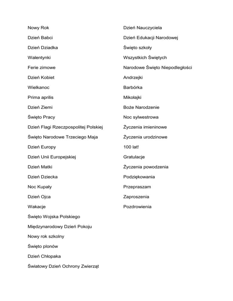 Nowy Rok Dzień Nauczyciela Dzień Babci Dzień Edukacji Narodowej Dzień Dziadka Święto szkoły Walentynki Wszystkich Świętych Ferie zimowe Narodowe Święto Niepodległości Dzień Kobiet Andrzejki Wielkanoc Barbórka Prima aprilis Mikołajki Dzień Ziemi Boże Narodzenie Święto Pracy Noc sylwestrowa Dzień Flagi Rzeczpospolitej Polskiej Życzenia imieninowe Święto Narodowe Trzeciego Maja Życzenia urodzinowe Dzień Europy 100 lat! Dzień Unii Europejskiej Gratulacje Dzień Matki Życzenia powodzenia Dzień Dziecka Podziękowania Noc Kupały Przepraszam Dzień Ojca Zaproszenia Wakacje Pozdrowienia Święto Wojska Polskiego Międzynarodowy Dzień Pokoju Nowy rok szkolny Święto plonów Dzień Chłopaka Światowy Dzień Ochrony Zwierząt