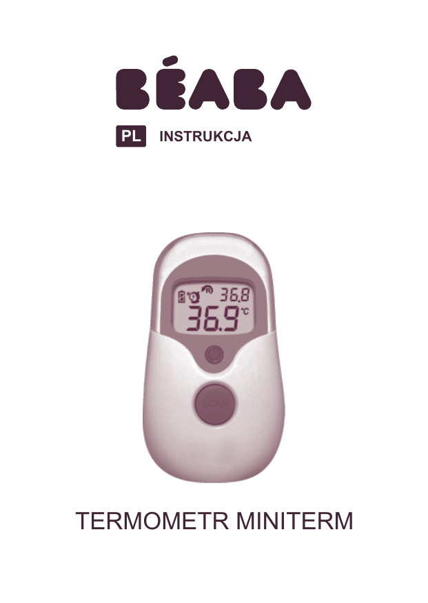 PL INSTRUKCJA TERMOMETR MINITERM PL ZAPOZNAJ SIĘ UWAŻNIE Z TREŚCIĄ PONIŻSZEJ INSTRUKCJI. INSTRUKCJĘ ZACHOWAJ NA PRZYSZŁOŚĆ. Zakupiony termometr medyczny korzysta z najnowszej technologii. Wyłapuje promienie podczerwone emitowane przez ciała i przelicza na temperaturę. Termometr Miniterm momentalnie mierzy temperaturę na odległość, nie wymagając bezpośredniego kontaktu. Dziecko nawet nie zorientuje się, co się dzieje. Prosimy jednak pamiętać, że termometr Miniterm tak łatwy i szybki w obsłudze, zdolny mierzyć temperaturę obiektów i płynów, przede wszystkim przeznaczony jest do celów medycznych. Należy go stosować zgodnie ze szczegółowymi zaleceniami zawartymi w niniejszej ulotce. 1 Wyświetlacz LCD 4 Czujnik dokonujący pomiaru 2 ON/MEM 5 Otwarcie pokrywy baterii 3 Scan 6 Pokrywa baterii FUNKCJE: Pomiar temperatury ciała Termometr jest przeznaczony do praktycznego użycia. Nie zastąpi jednak wizyty u lekarza. Prosimy pamiętać, by porównać wynik pomiaru z regularną temperaturą ciała. Nie należy wykorzystywać odczytów temperatury do samodzielnego diagnozowania. Należy zasięgnąć porady lekarza. Jak mierzyć temperaturę ciała dowiesz się z paragrafu „Sposób użycia termometru”. Pomiar temperatury innych obiektów Temperatura innych obiektów różni się od temperatury ciała. Termometr pomaga ocenić czy temperatura innych obiektów (np. mleka) jest odpowiednia dla dziecka lub chorego. Jak mierzyć temperaturę innych obiektów dowiesz się z paragrafu „Sposób użycia termometru”. Pomiar temperatury otoczenia Odpowiednia temperatura otoczenia jest ważna dla dziecka i chorego. Termometr pomaga prawidłowo określić temperaturę panującą w pomieszczeniu. Po wyłączeniu urządzenia temperatura otoczenia będzie wyświetlana z ikonką Alarm informujący o podwyższonej temperaturze (gorączka) Jeśli termometr w trybie pomiaru temperatury ciała wykryje temperaturę 37,5 stopni Celsjusza lub więcej, powiadomi użytkownika o gorączce: po jednym długim sygnale dźwiękowym nastąpią trzy krótkie. Ostatni pomiar Wynik poprzedniego pomiaru wyświetla się na ekranie (w prawym górnym rogu) z ikonką . Lokalizacja pamięci Termometr przechowuje w pamięci 25 ostatnich wyników pomiaru temperatury ciała. Przy włączonym urządzeniu wciśnij przycisk ON/MEM, by wyświetlić zapisy wyników pomiaru temperatury przy ikonce . Przełączanie między stopniami Celsjusza i Fahrenheita Po wyłączeniu urządzenia naciśnij i przytrzymaj przycisk SCAN. Następnie przyciśnij ON/MEM na trzy sekundy. Ikonka wyświetlania w stopniach Celsjusza zmieni się w ikonkę wyświetlania w stopniach Fahrenheita. W ten sam sposób zmienisz system pomiarowy ze stopni Fahrenheita na stopnie Celsjusza. SPOSÓB UŻYCIA TERMOMETRU Zawsze sprawdzaj czy czujnik dokonujący pomiaru jest czysty i nie uległ uszkodzeniu oraz czy czoło jest czyste. Włączenie Przed pierwszym użyciem termometru usuń przezroczysty pasek zabezpieczający baterię. Usuń pokrywkę zabezpieczającą (nie ciągnij i nie ściskaj boków pokrywki). Wciśnij ON/MEM. Pomiar temperatury ciała Wciśnij ON/MEM. Tryb pomiaru temperatury ciała jest ustawiony domyślnie. Na wyświetlaczu pojawi się ikonka i usłyszysz dwa sygnały dźwiękowe. W tym trybie przyłóż termometr na odległość 1-3 centymetrów od środka czoła dziecka. Wciśnij SCAN, by dokonać pomiaru temperatury ciała. Pomiar trwa 1 sekundę. UWAGA! - Temperatura mierzona na czole przeliczana jest na wartość odpowiadającą temperaturze w odbycie dziecka. Temperatura mierzona w odbycie jest najdokładniejszym pomiarem, z najmniejszym marginesem błędu (rekomendowana przez lekarzy). - Przed przystąpieniem do pomiaru przebywaj w stabilnym otoczeniu przez 5 minut. Nie uprawiaj ćwiczeń fizycznych i nie bierz kąpieli przez 30 minut przed pomiarem. - Podczas dokonywania pomiaru temperatury czoło powinno być czyste, bez zadrapań, śladów potu ani kosmetyków. Pomiar temperatury innych obiektów - Po włączeniu urządzenia wciśnij i przytrzymaj ON/MEM. Jednokrotnie wciśnij SCAN, by uzyskać „termometr w podczerwieni”. Na wyświetlaczu pojawi się ikonka TU IKONKA. W tym trybie dokonasz pomiaru temperatury obiektu. - Wciskając SKAN dokonasz momentalnie pomiaru rzeczywistej temperatury. Jeśli wciskasz i przytrzymujesz SKAN, odczyt temperatury jest na bieżąco aktualizowany. - Termometr dokonuje pomiaru temperatury wody, mleka, ubrań, skóry i innych obiektów. Uwaga dodatkowa: Tryb ten dokonuje pomiaru temperatury obiektów, która różni się od temperatury ciała. Wyłączenie urządzenia - Urządzenie nieużywane przez dłużej niż jedną minutę wyłącza się automatycznie. W ten sposób wydłuża żywotność baterii. - Wciskając ON/MEM wyłączysz urządzenie ręcznie. WAŻNE Czyszczenie i przechowywanie Sprawdź czy czujnik dokonujący pomiaru jest czysty, by mieć pewność, że odczyt temperatury będzie prawidłowy. UWAGA! Czujnik dokonujący pomiaru jest najdelikatniejszą częścią termometru. Unikniesz uszkodzenia czyszcząc go ze szczególną uwagą. - Do czyszczenia czujnika dokonującego pomiaru użyj szmatki lub bawełnianej tkaniny nasączonej alkoholem 70 procentowym. - Pozostaw czujnik na przynajmniej 1 minutę aż całkiem wyschnie. - Przechowuj w suchym miejscu z dala od wody i nie narażonym na bezpośrednie działanie promieni słonecznych. - Przechowuj produkt w temperaturze od -20 do +50 stopni Celsjusza. - Nie zanurzaj czujnika dokonującego pomiaru w żadnej cieczy. UWAGA! Pomiar może być niewłaściwy, jeśli termometr był zbyt długo trzymany w dłoni. Wymiana baterii Urządzenie jest wyposażone w jedną baterię CR2032. 1. 2. 3. - Otwórz pokrywę baterii: włóż cienki ostry przedmiot w otwarcie pokrywy baterii. Jednocześnie wypchnij kciukiem pokrywę baterii. - Trzymając urządzenie wypchnij baterię przy pomocy małego śrubokrętu. - Włóż nową baterię