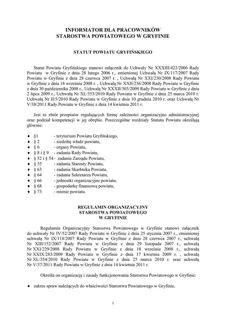 INFORMATOR DLA PRACOWNIKÓW STAROSTWA POWIATOWEGO W GRYFINIE STATUT POWIATU GRYFIŃSKIEGO Statut Powiatu Gryfińskiego stanowi załącznik do Uchwały Nr XXXIII/422/2006 Rady Powiatu w Gryfinie z dnia 28 lutego 2006 r., zmienionej Uchwałą Nr IX/117/2007 Rady Powiatu w Gryfinie z dnia 28 czerwca 2007 r. , Uchwałą Nr XXI/230/2008 Rady Powiatu w Gryfinie z dnia 18 września 2008 r. , Uchwałą Nr XXII/236/2008 Rady Powiatu w Gryfinie z dnia 30 października 2008 r., Uchwałą Nr XXXII/303/2009 Rady Powiatu w Gryfinie z dnia 2 lipca 2009 r., Uchwałą Nr XL/353/2010 Rady Powiatu w Gryfinie z dnia 25 marca 2010 r. Uchwałą Nr II/5/2010 Rady Powiatu w Gryfinie z dnia 10 grudnia 2010 r. oraz Uchwałą Nr V/38/2011 Rady Powiatu w Gryfinie z dnia 14 kwietnia 2011 r. Jest to zbiór przepisów regulujących formę zależności organizacyjno administracyjnej oraz podział kompetencji w jej obrębie. Poszczególne rozdziały Statutu Powiatu określają głównie: ♦ ♦ ♦ ♦ ♦ ♦ ♦ ♦ ♦ ♦ ♦ §1 - terytorium Powiatu Gryfińskiego, §2 - siedzibę władz powiatu, §6 - organy Powiatu, § 8 i § 9 - zadania Rady Powiatu, § 52 i § 54 - zadania Zarządu Powiatu, § 55 - zadania Starosty Powiatu, § 63 - zadania Skarbnika Powiatu, § 64 - zadania Sekretarza Powiatu, § 66 - jednostki organizacyjne powiatu, § 68 - gospodarkę finansową powiatu, § 73 - mienie powiatu. REGULAMIN ORGANIZACYJNY STAROSTWA POWIATOWEGO W GRYFINIE Regulamin Organizacyjny Starostwa Powiatowego w Gryfinie stanowi załącznik do uchwały Nr IV/52/2007 Rady Powiatu w Gryfinie z dnia 25 stycznia 2007 r., zmienionej uchwałą Nr IX/118/2007 Rady Powiatu w Gryfinie z dnia 28 czerwca 2007 r., uchwałą Nr XIII/152/2007 Rady Powiatu w Gryfinie z dnia 29 listopada 2007 r., uchwałą Nr XXI/229/2008 Rady Powiatu w Gryfinie z dnia 18 września 2008 r., uchwałą Nr XXIX/283/2009 Rady Powiatu w Gryfinie z dnia 17 kwietnia 2009 r. , uchwałą Nr XL/354/2010 Rady Powiatu w Gryfinie z dnia 25 marca 2010 r. oraz uchwałą Nr V/37/2011 Rady Powiatu w Gryfinie z dnia 14 kwietnia 2011 r. Określa on organizację i zasady funkcjonowania Starostwa Powiatowego w Gryfinie: ♦ zakres spraw należących do właściwości Starostwa Powiatowego w Gryfinie, 1 ♦ strukturę organizacyjną Starostwa, ♦ zakres działania i kompetencje Kierownictwa Starostwa, ♦ obowiązki i odpowiedzialność kierowników komórek organizacyjnych Starostwa oraz pozostałych pracowników Starostwa, ♦ zasady współpracy między komórkami organizacyjnymi Starostwa, ♦ szczegółowe zadania i zakres działania komórek organizacyjnych Starostwa, ♦ zasady rozpatrywania skarg i wniosków obywateli, ♦ organizowanie działalności kontrolnej, ♦ zasady podpisywania pism, zasady opracowywania i wydawania aktów prawnych Zarządu i Starostwa. STRUKTURA STAROSTWA POWIATOWEGO W GRYFINIE 1. Starosta: (ul. Sprzymierzonych 4, tel. 91-415-31-82) ♦ ♦ ♦ ♦ ♦ ♦ ♦ organizuje pracę zarządu powiatu i starostwa powiatowego, kieruje bieżącymi sprawami powiatu, reprezentuje powiat na zewnątrz, jest zwierzchnikiem służbowym pracowników starostwa, jest zwierzchnikiem służbowym kierowników jednostek organizacyjnych, jest zwierzchnikiem powiatowych służb, inspekcji i straży, reprezentuje Skarbu Państwa w zakresie i na zasadach określonych w odrębnych ustawach, ♦ sprawuje bezpośredni nadzór nad pracą: Wydziału Gospodarki Nieruchomościami i Nadzoru Właścielskiego, Wydziału Remontów, Inwestycji i Zamówień Publicznych, Wydziału Zarządzania Drogami, Wydziału Geodezji, Kartografii i Katastru, Wydziału Zarządzania Kryzysowego, Pełnomocnika ds. Ochrony Informacji Niejawnych Audytora Wewnętrznego, Samodzielnego stanowiska ds. kontroli, Powiatowego Rzecznika Praw Konsumentów, Służby bezpieczeństwa i higieny pracy, Pełnomocnikiem ds. systemu zarządzania jakością, ♦ sprawuje nadzór merytoryczny nad działalnością Powiatowego Urzędu Pracy w Gryfinie, w tym filia w Chojnie, ♦ Sekretariat Starosty (tel.91-415-31-82 wew. 62, fax 91-416- 30-02) 2. Wicestarosta: (ul. Sprzymierzonych 4, tel. 91-415-31-82 wew. 36) ♦ wykonuje zadania określone w Statucie Powiatu zapewniając kompleksowe rozwiązywanie problemów powiatu, 2 ♦ w czasie nieobecności Starosty lub niemożności wykonywania swej funkcji zadania i kompetencje w zakresie kierowania starostwem wykonuje Wicestarosta, ♦ sprawuje bezpośredni nadzór nad pracą: Wydziału Architektury i Budownictwa, Wydziału Komunikacji i Transportu, w tym filia, Wydziału Edukacji, Kultury, Sportu i Turystyki, Wydziału Ochrony Środowiska, Rolnictwa i Leśnictwa, ♦ sprawuje nadzór merytoryczny nad działalnością niżej wymienionych jednostek organizacyjnych powiatu: Powiatowego Centrum Pomocy Rodzinie w Gryfinie, Domu Pomocy Społecznej w Nowym Czarnowie, Wielofunkcyjną Placówką Opiekuńczo – Wychowawczą w Chojnie, Zespołu Szkół Ponadgimnazjalnych Nr 2 w Gryfinie, Zespołu Szkół Ponadgimnazjalnych Nr 1 im. Bohaterów spod Siekierek w Chojnie, Specjalnego Ośrodka Szkolno – Wychowawczego im. Mieszka I w Chojnie, Zespołu Szkół Specjalnych w Gryfinie, Poradni Psychologiczno-Pedagogicznej w Gryfinie, w tym filia w Chojnie;; 3. Sekretarz Powiatu: (ul. 11 Listopada 16 d tel. 091-404-50-00) ♦ Sekretarz wykonując wyznaczone przez Starostę kompetencje i zadania zapewnia w powierzonym mu zakresie kompleksowe rozwiązywanie spraw. ♦ Do Sekretarza należy w szczególności: koordynacja i nadzór nad działaniami komórek organizacyjnych Starostwa; czuwanie nad tokiem i terminowością wykonywania zadań w Starostwie; koordynowanie prac związanych z opracowywaniem projektów aktów regulujących struktury i zasady działania Starostwa i jego komórek organizacyjnych; nadzorowanie toku przygotowywania projektów uchwał Zarządu oraz prac związanych z organizacją posiedzeń Zarządu; koordynowanie prac dotyczących przygotowywania i wnoszenie pod obrady Rady,