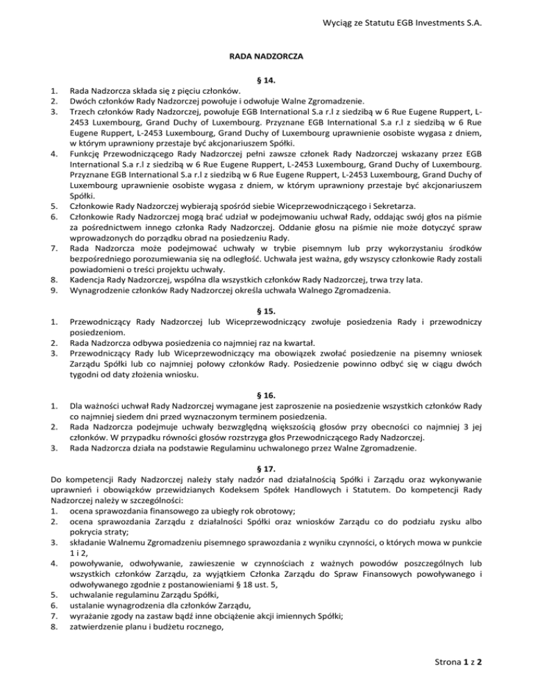 Wyciąg ze Statutu EGB Investments S.A. RADA NADZORCZA 1. 2. 3. 4. 5. 6. 7. 8. 9. 1. 2. 3. 1. 2. 3. § 14. Rada Nadzorcza składa się z pięciu członków. Dwóch członków Rady Nadzorczej powołuje i odwołuje Walne Zgromadzenie. Trzech członków Rady Nadzorczej, powołuje EGB International S.a r.l z siedzibą w 6 Rue Eugene Ruppert, L2453 Luxembourg, Grand Duchy of Luxembourg. Przyznane EGB International S.a r.l z siedzibą w 6 Rue Eugene Ruppert, L-2453 Luxembourg, Grand Duchy of Luxembourg uprawnienie osobiste wygasa z dniem, w którym uprawniony przestaje byd akcjonariuszem Spółki. Funkcję Przewodniczącego Rady Nadzorczej pełni zawsze członek Rady Nadzorczej wskazany przez EGB International S.a r.l z siedzibą w 6 Rue Eugene Ruppert, L-2453 Luxembourg, Grand Duchy of Luxembourg. Przyznane EGB International S.a r.l z siedzibą w 6 Rue Eugene Ruppert, L-2453 Luxembourg, Grand Duchy of Luxembourg uprawnienie osobiste wygasa z dniem, w którym uprawniony przestaje byd akcjonariuszem Spółki. Członkowie Rady Nadzorczej wybierają spośród siebie Wiceprzewodniczącego i Sekretarza. Członkowie Rady Nadzorczej mogą brad udział w podejmowaniu uchwał Rady, oddając swój głos na piśmie za pośrednictwem innego członka Rady Nadzorczej. Oddanie głosu na piśmie nie może dotyczyd spraw wprowadzonych do porządku obrad na posiedzeniu Rady. Rada Nadzorcza może podejmowad uchwały w trybie pisemnym lub przy wykorzystaniu środków bezpośredniego porozumiewania się na odległośd. Uchwała jest ważna, gdy wszyscy członkowie Rady zostali powiadomieni o treści projektu uchwały. Kadencja Rady Nadzorczej, wspólna dla wszystkich członków Rady Nadzorczej, trwa trzy lata. Wynagrodzenie członków Rady Nadzorczej określa uchwała Walnego Zgromadzenia. § 15. Przewodniczący Rady Nadzorczej lub Wiceprzewodniczący zwołuje posiedzenia Rady i przewodniczy posiedzeniom. Rada Nadzorcza odbywa posiedzenia co najmniej raz na kwartał. Przewodniczący Rady lub Wiceprzewodniczący ma obowiązek zwoład posiedzenie na pisemny wniosek Zarządu Spółki lub co najmniej połowy członków Rady. Posiedzenie powinno odbyd się w ciągu dwóch tygodni od daty złożenia wniosku. § 16. Dla ważności uchwał Rady Nadzorczej wymagane jest zaproszenie na posiedzenie wszystkich członków Rady co najmniej siedem dni przed wyznaczonym terminem posiedzenia. Rada Nadzorcza podejmuje uchwały bezwzględną większością głosów przy obecności co najmniej 3 jej członków. W przypadku równości głosów rozstrzyga głos Przewodniczącego Rady Nadzorczej. Rada Nadzorcza działa na podstawie Regulaminu uchwalonego przez Walne Zgromadzenie. § 17. Do kompetencji Rady Nadzorczej należy stały nadzór nad działalnością Spółki i Zarządu oraz wykonywanie uprawnieo i obowiązków przewidzianych Kodeksem Spółek Handlowych i Statutem. Do kompetencji Rady Nadzorczej należy w szczególności: 1. ocena sprawozdania finansowego za ubiegły rok obrotowy; 2. ocena sprawozdania Zarządu z działalności Spółki oraz wniosków Zarządu co do podziału zysku albo pokrycia straty; 3. składanie Walnemu Zgromadzeniu pisemnego sprawozdania z wyniku czynności, o których mowa w punkcie 1 i 2, 4. powoływanie, odwoływanie, zawieszenie w czynnościach z ważnych powodów poszczególnych lub wszystkich członków Zarządu, za wyjątkiem Członka Zarządu do Spraw Finansowych powoływanego i odwoływanego zgodnie z postanowieniami § 18 ust. 5, 5. uchwalanie regulaminu Zarządu Spółki, 6. ustalanie wynagrodzenia dla członków Zarządu, 7. wyrażanie zgody na zastaw bądź inne obciążenie akcji imiennych Spółki; 8. zatwierdzenie planu i budżetu rocznego, Strona 1 z 2 Wyciąg ze Statutu EGB Investments S.A. 9. 10. 11. 12. 13. 14. 15. 16. 17. wyrażanie zgody na zaciąganie przez Spółkę nowych zobowiązao (pożyczek, kredytów, zobowiązao leasingowych, tj. leasing operacyjny i finansowy), wystawienie weksli, przekraczających łącznie z jednego tytułu wartośd ponad 1 000.000,00 zł, a nieprzewidzianych w zatwierdzonym przez Radę Nadzorczą planie lub budżecie rocznym Spółki, zatwierdzenie transakcji z podmiotami powiązanymi z członkami Zarządu, przy czym „podmiot powiązany” oznacza osobę, spółkę lub inny podmiot mający związki gospodarcze, rodzinne z członkami Zarządu, w tym w szczególności (i) jego małżonka, lub (ii) jego dzieci, lub (iii) wnuków, lub (iv) rodziców, lub (v) dziadków, lub (vi) rodzeostwo, lub każdą spółkę lub każdy inny podmiot kontrolowany pośrednio lub bezpośrednio przez osoby określone powyżej, lub w których osoby określone powyżej uzyskują znaczące korzyści gospodarcze; wyrażanie zgody na udzielanie przez Spółkę darowizn nieprzewidzianych w zatwierdzonym przez Radę Nadzorczą planie i budżecie rocznym Spółki. wyrażanie zgody na udzielanie przez Spółkę wszelkich poręczeo, gwarancji lub ustanawianie zastawów, gdy wartośd przedmiotu czynności prawnej przekracza kwotę 1 000. 000,00 złotych; postanowienie to nie narusza art. 15 Kodeksu Spółek Handlowych. wybór podmiotu uprawnionego do badania sprawozdao finansowych Spółki, zatwierdzanie zmian do umów zawartych pomiędzy Spółką i Kancelarią Radcy Prawnego Jolanty Małgorzaty Niewiarowskiej oraz spółką partnerską Niewiarowska i Partnerzy, wyrażanie zgody na zbycie udziałów w EGB Finanse sp. z o.o. i papierów wartościowych, delegowanie członków Rady Nadzorczej, na okres nie dłuższy niż 3 miesiące, do czasowego wykonywania czynności członków Zarządu, którzy, złożyli rezygnację albo z innych przyczyn nie mogą sprawowad swoich czynności, wyrażanie opinii dla Walnego Zgromadzenia w następujących sprawach: a) rozwiązania, likwidacji, łączenia i podziału lub przekształcania Spółki, b) podwyższenia i obniżenia kapitału zakładowego Spółki bądź umarzania akcji przez Spółkę, c) emisji obligacji zamiennych lub z prawem pierwszeos