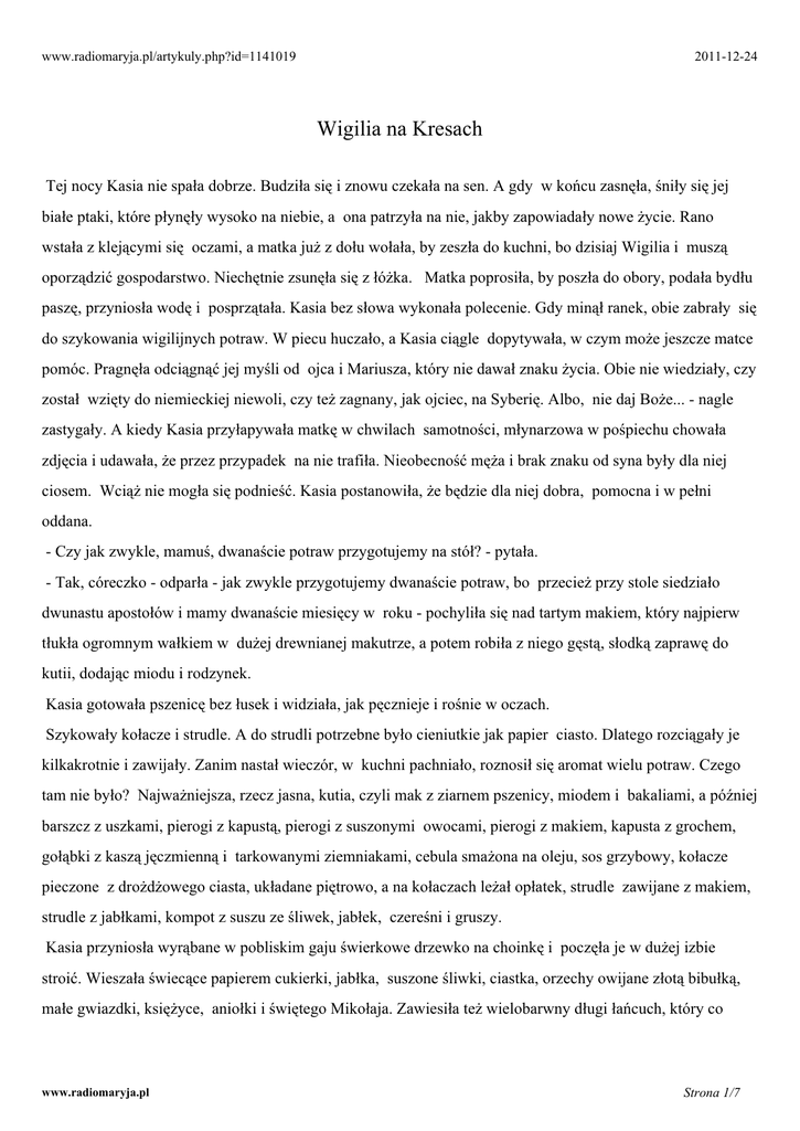 www.radiomaryja.pl/artykuly.php?id=1141019 2011-12-24 Wigilia na Kresach Tej nocy Kasia nie spała dobrze. Budziła się i znowu czekała na sen. A gdy w końcu zasnęła, śniły się jej białe ptaki, które płynęły wysoko na niebie, a ona patrzyła na nie, jakby zapowiadały nowe życie. Rano wstała z klejącymi się oczami, a matka już z dołu wołała, by zeszła do kuchni, bo dzisiaj Wigilia i muszą oporządzić gospodarstwo. Niechętnie zsunęła się z łóżka. Matka poprosiła, by poszła do obory, podała bydłu paszę, przyniosła wodę i posprzątała. Kasia bez słowa wykonała polecenie. Gdy minął ranek, obie zabrały się do szykowania wigilijnych potraw. W piecu huczało, a Kasia ciągle dopytywała, w czym może jeszcze matce pomóc. Pragnęła odciągnąć jej myśli od ojca i Mariusza, który nie dawał znaku życia. Obie nie wiedziały, czy został wzięty do niemieckiej niewoli, czy też zagnany, jak ojciec, na Syberię. Albo, nie daj Boże... - nagle zastygały. A kiedy Kasia przyłapywała matkę w chwilach samotności, młynarzowa w pośpiechu chowała zdjęcia i udawała, że przez przypadek na nie trafiła. Nieobecność męża i brak znaku od syna były dla niej ciosem. Wciąż nie mogła się podnieść. Kasia postanowiła, że będzie dla niej dobra, pomocna i w pełni oddana. - Czy jak zwykle, mamuś, dwanaście potraw przygotujemy na stół? - pytała. - Tak, córeczko - odparła - jak zwykle przygotujemy dwanaście potraw, bo przecież przy stole siedziało dwunastu apostołów i mamy dwanaście miesięcy w roku - pochyliła się nad tartym makiem, który najpierw tłukła ogromnym wałkiem w dużej drewnianej makutrze, a potem robiła z niego gęstą, słodką zaprawę do kutii, dodając miodu i rodzynek. Kasia gotowała pszenicę bez łusek i widziała, jak pęcznieje i rośnie w oczach. Szykowały kołacze i strudle. A do strudli potrzebne było cieniutkie jak papier ciasto. Dlatego rozciągały je kilkakrotnie i zawijały. Zanim nastał wieczór, w kuchni pachniało, roznosił się aromat wielu potraw. Czego tam nie było? Najważniejsza, rzecz jasna, kutia, czyli mak z ziarnem pszenicy, miodem i bakaliami, a później barszcz z uszkami, pierogi z kapustą, pierogi z suszonymi owocami, pierogi z makiem, kapusta z grochem, gołąbki z kaszą jęczmienną i tarkowanymi ziemniakami, cebula smażona na oleju, sos grzybowy, kołacze pieczone z drożdżowego ciasta, układane piętrowo, a na kołaczach leżał opłatek, strudle zawijane z makiem, strudle z jabłkami, kompot z suszu ze śliwek, jabłek, czereśni i gruszy. Kasia przyniosła wyrąbane w pobliskim gaju świerkowe drzewko na choinkę i poczęła je w dużej izbie stroić. Wieszała świecące papierem cukierki, jabłka, suszone śliwki, ciastka, orzechy owijane złotą bibułką, małe gwiazdki, księżyce, aniołki i świętego Mikołaja. Zawiesiła też wielobarwny długi łańcuch, który co www.radiomaryja.pl Strona 1/7 roku odnawiała, dopinając wciąż nowe ogniwa. I drugi ze słomek. Obsypała drzewko bielusieńką jak śnieg watą i srebrnymi anielskimi włosami, zapaliła świeczki, a na szczyt wbiła ogromną, świecącą gwiazdę i choinka była gotowa. Powiesiła na ścianie drugą naftową lampę, w domu się rozjaśniło i smutek na twarzy matki powoli topniał. Patrzyła na Kasię wielkimi wilgotnymi oczami i dyskretnie się uśmiechała. Kasia także odpowiadała jej ciepłym uśmiechem i poczęły rozmawiać o dawnych świętach. Kasia dopytywała, czy zawsze i wszędzie święta wyglądały tak samo. A matka tłumaczyła, że na Kresach w zależności od krainy nieco inaczej przebiegały. - Jak? - wpatrywała się w nią Kasia. - Och - wzdychała matka. - Kresy to wielkie terytorium, wiele nacji, religii, kultur. Gdy byliśmy młodzi, dużo podróżowaliśmy z ojcem, byliśmy zamożni, mieliśmy, jak wiesz, nowy duży młyn, a teraz, gdy ta czerwona hołota nas obsiadła, marniejemy, córeczko... - Nie mów tak, mamuś, nie jest źle - pocieszała ją Kasia, bo bała się, że matka się znowu rozpłacze. Zawsze tak było, gdy wspominała ten straszny dzień, gdy Sowieci wkroczyli do domu, zabrali ojca, ograbili majątek, zabrali srebrne naczynia, sztućce, pierścionki... - Dzikusy! - syknęła matka, ale szybko odwróciła się do Kasi i szepnęła: - Przepraszam, nie powinnam w takim dniu... Kasia przytuliła się do niej, a matka dyskretnie wytarła łzę i zaczęła mówić. - Wiesz, Kasiu, to były szczęśliwe lata. Jeździliśmy z ojcem do Wilna, Lwowa, Tarnopola, Krzemieńca, Nowogródka, Stanisławowa, Stryja, Drohobycza, na Polesie i Wołyń. To nasze ziemie, wolne... - I wszędzie tam święta inaczej wyglądały niż u nas, tutaj, na wsi? - Nie, córeczko, niezupełnie inaczej, nastrój był taki sam albo podobny, wesoły, radosny, wszakże to święta rodzinne, zbierały się całe rody, stoły obficie zastawione... - A jedzenie, potrawy? - Jadaliśmy różne potrawy. Pamiętam zupy migdałowe z ryżem i rodzynkami, zupy rybne z farszem lub grzybowe z łazankami, szczupaka w sosie z cytryną albo okonia oblanego masłem... - A dlaczego u nas nie jada się ryb? - spytała Kasia. - Pewnie dlatego, że ich tutaj nie ma - uśmiechnęła się młynarzowa. - Ale mamy za to choinkę... - Jak to? A gdzie indziej choinek nie ma? - Pewnie, że nie ma. Nie wszędzie rosną świerki. My mamy szczęście... - I co jeszcze podawano? - We dworach jadało się szczupaka z szafranem i rodzynkami, lina w galarecie, karpia w rumianym sosie z dodatkami. Na Podlasiu smakowałam łamańce z makowym mleczkiem. Nawet pamiętam recepturę: mąka, www.radiomaryja.pl Strona 2/7 masło, cukier puder, żółtko, mleko, miód, orzechy mielone... co jeszcze... - zastanowiła się - aha... rodzynki, migdały i ma się rozumieć rum, w odpowiednich proporcjach, ale już nie pamiętam w jakich. Zaś w okolicach Wilna częstowali nas rolmopsami śledziowymi... - Czym? Co za dziwna nazwa?!