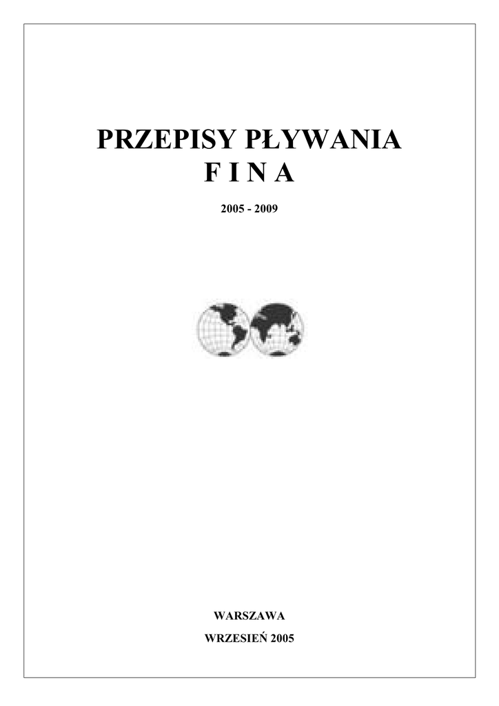 PRZEPISY PŁYWANIA FINA 2005 - 2009 WARSZAWA WRZESIEŃ 2005 Niniejsze przepisy pływania są tłumaczeniem z języka angielskiego przepisów FINA 2005 - 2009. Tłumaczył: Konsultacja: Jerzy Kowalski Eugeniusz Waraksa Uwaga: W przepisach pozostały ujęcia z przepisów 2002-2005, które zostały wycofane – są przekreślone, a nowe są podkreślone. Polski Związek Pływacki - Przepisy FINA 2005 – 2009 PRZEPISY PŁYWANIA F I N A 1. 2. 3. 4. 5. 6. 7. 8. 9. 10. 11. 12. 13. SW 1 Kierownictwo zawodów SW 2 Sędziowie SW 3 Rozstawienie wyścigów eliminacyjnych i finałowych SW 4 Start SW 5 Styl dowolny SW 6 Styl grzbietowy SW 7 Styl klasyczny SW 8 Styl motylkowy SW 9 Styl zmienny SW 10 Wyścig SW 11 Pomiar czasu SW 12 Rekordy świata i rekordy Polski SW 13 Procedura postępowania przy automatycznym sędziowaniu Str. 4 Str. 5 Str. 12 Str. 15 Str. 15 Str. 16 Str. 17 Str. 18 Str. 18 Str. 19 Str. 20 Str. 22 Str. 26 PRZEPISY F I N A DOTYCZĄCE OBIEKTÓW 14. 15. 16. 17. FR 1 Uwagi Generalne FR 2 Pływalnia FR 3 Pływalnie przeznaczone do organizowania igrzysk olimpijskich i mistrzostw świata FR 4 Automatyczna aparatura do sędziowania 3 Str. 27 Str. 27 Str. 31 Str. 32 Polski Związek Pływacki - Przepisy FINA 2005 – 2009 SW 1 Kierownictwo zawodów. SW 1.1 Kierownictwo zawodów powołane przez właściwe władze posiada prawo rozstrzygania wszystkich spraw nie podlegających w myśl przepisów sędziemu głównemu, sędziom lub innym osobom i jest w mocy wstrzymać odbywanie się konkurencji i dać wskazówki zgodne z przepisami co do sposobu przeprowadzenia kaŜdej konkurencji. SW 1.2 Na igrzyskach olimpijskich, mistrzostwach świata i zawodach o puchar świata, Biuro FINA wyznacza następujące minimalne ilości sędziów dla kierowania zawodami: sędzia główny (1) kierownik pomieszczenia kontrolnego sędziowie stylu (4) starterzy (2) kierownicy inspektorów nawrotów (2, 1 na kaŜdym końcu pływalni) inspektorzy nawrotów (1 na kaŜdym końcu pływalni) kierownik sekretariatu (1) sekretarz (1) kierownicy wyścigów (2) obsługa linki przedwczesnego startu (1) informator (1) SW 1.2.2 Na wszystkich innych zawodach międzynarodowych właściwe władze wyznaczają taką samą lub mniejszą ilość sędziów, co podlega, tam gdzie jest to stosowne, zatwierdzeniu przez odpowiednie regionalne lub międzynarodowe władze. SW 1.2.3 Gdy automatyczna aparatura do sędziowania jest niedostępna to musi ona być zastąpiona przez kierownika sędziów mierzących czas, 3 sędziów mierzących czas na kaŜdym torze i 2 sędziów mierzących czas dodatkowo. SW 1.2.4 Gdy nie jest stosowany automatyczny pomiar czasu i/lub czasu nie mierzy się trzema (3) czasomierzami cyfrowymi na kaŜdym torze, 4 Polski Związek Pływacki - Przepisy FINA 2005 – 2009 wymagany jest sędzia - kierownik sędziów celowniczych i sędziowie celowniczy. Uwaga: Na wszystkich zawodach pływackich w kraju obowiązują niŜej wymienione minimalne ilości sędziów: na pływalni 25 m - 20 sędziów + sekretariat na pływalni 50 m - 24 sędziów + sekretariat SW 1.3 Pływalnia i wyposaŜenie techniczne na igrzyska olimpijskie i mistrzostwa świata muszą być poddane inspekcji i zostać zatwierdzone we właściwym czasie przed zawodami pływackimi przez delegata FINA oraz członka Komitetu Technicznego Pływania FINA. SW 1.4 Gdy telewizja uŜywa podwodnego sprzętu do filmowania, musi on być zdalnie sterowany i nie powinien ograniczać widzenia lub toru zawodników i nie moŜe zmienić konfiguracji pływalni ani zasłaniać wymaganych oznaczeń FINA. SW 2 Sędziowie. SW 2.1 Sędzia główny. SW 2.1.1 Sędzia główny sprawuje pełną kontrolę i władzę nad wszystkimi sędziami, zatwierdza przydzielone im stanowiska i instruuje ich w zakresie specjalnych wymagań lub przepisów związanych z tymi zawodami. Egzekwuje wszystkie przepisy i decyzje FINA oraz rozstrzyga wszystkie kwestie związane z aktualnym prowadzeniem mitingu, konkurencji, czy zawodów, których rozstrzygnięcie nie jest określone przepisami. SW 2.1.2 Sędzia główny moŜe interweniować w zawodach, w kaŜdej ich fazie, dla zapewnienia aby były przestrzegane przepisy FINA, rozpatruje wszystkie protesty dotyczące trwających zawodów. 5 Polski Związek Pływacki - Przepisy FINA 2005 – 2009 SW 2.1.3 Gdy korzysta się z sędziów celowniczych bez stosowania trzech (3) czasomierzy cyfrowych i jest to konieczne, o kolejności decyduje sędzia główny. Jeśli jest dostępna automatyczna aparatura do pomiaru czasu i funkcjonuje, wyniki z niej muszą być wzięte pod uwagę jak to przedstawiono w p. SW 13. SW 2.1.4 Sędzia główny powinien zapewnić, aby wszyscy niezbędni sędziowie znajdowali się na przydzielonych im stanowiskach dla prowadzenia zawodów. MoŜe wyznaczyć zastępców za jakichkolwiek nieobecnych, niezdolnych do pełnienia funkcji lub uznanych za nieefektywnych. MoŜe wyznaczyć dodatkowych sędziów o ile uzna to za konieczne. SW 2.1.5 Przy rozpoczęciu kaŜdego wyścigu sędzia główny daje sygnał pływakom poprzez serie krótkich gwizdków, zapraszających do zdjęcia ubrania z wyjątkiem stroju pływackiego, po których następuje długi gwizdek sygnalizujący, Ŝe powinni oni zająć swoje miejsca na platformie startowej (lub dla stylu grzbietowego i sztafet zmiennych, sygnalizujący, Ŝe powinni bezzwłocznie wejść do wody). Drugi długi gwizdek jest sygnałem dla grzbiecisty lub pływaka sztafety zmiennej do bezzwłocznego zajęcia pozycji startowej. Gdy pływacy i sędziowie są przygotowani do startu, sędzia główny poprzez wyciągnięcie ręki, daje znak starterowi, Ŝe pływacy są pod kontrolą startera. Wyciągnięta ręka powinna pozostawać w tej pozycji do wydania komendy startowej. Uwaga: Sędzia główny wyciągniętą rękę w kierunku startera trzyma tak długo, aŜ starter da sygnał do startu. JeŜeli sędzia główny w międzyczasie opuści rękę jest to znak dla startera, Ŝe ma on wstrzymać start. SW 2.1.6 Sęd