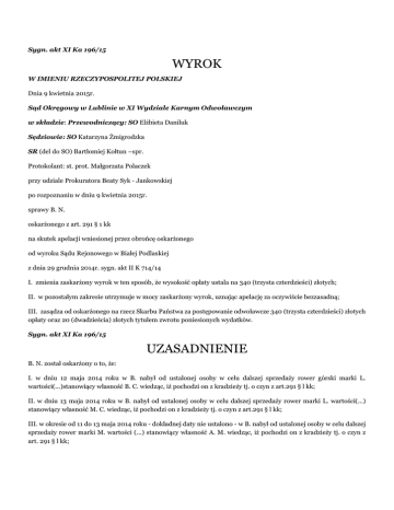 Sygn. akt XI Ka 196/15 WYROK W IMIENIU RZECZYPOSPOLITEJ POLSKIEJ Dnia 9 kwietnia 2015r. Sąd Okręgowy w Lublinie w XI Wydziale Karnym Odwoławczym w składzie: Przewodniczący: SO Elżbieta Daniluk Sędziowie: SO Katarzyna Żmigrodzka SR (del do SO) Bartłomiej Kołtun –spr. Protokolant: st. prot. Małgorzata Polaczek przy udziale Prokuratora Beaty Syk - Jankowskiej po rozpoznaniu w dniu 9 kwietnia 2015r. sprawy B. N. oskarżonego z art. 291 § 1 kk na skutek apelacji wniesionej przez obrońcę oskarżonego od wyroku Sądu Rejonowego w Białej Podlaskiej z dnia 29 grudnia 2014r. sygn. akt II K 714/14 I. zmienia zaskarżony wyrok w ten sposób, że wysokość opłaty ustala na 340 (trzysta czterdzieści) złotych; II. w pozostałym zakresie utrzymuje w mocy zaskarżony wyrok, uznając apelację za oczywiście bezzasadną; III. zasądza od oskarżonego na rzecz Skarbu Państwa za postępowanie odwoławcze 340 (trzysta czterdzieści) złotych opłaty oraz 20 (dwadzieścia) złotych tytułem zwrotu poniesionych wydatków. Sygn. akt XI Ka 196/15 UZASADNIENIE B. N. został oskarżony o to, że: I. w dniu 12 maja 2014 roku w B. nabył od ustalonej osoby w celu dalszej sprzedaży rower górski marki L. wartości(...)stanowiący własność B. C. wiedząc, iż pochodzi on z kradzieży tj. o czyn z art.291 § l kk; II. w dniu 13 maja 2014 roku w B. nabył od ustalonej osoby w celu dalszej sprzedaży rower marki L. wartości(...) stanowiący własność M. C. wiedząc, iż pochodzi on z kradzieży tj. o czyn z art.291 § l kk; III. w okresie od 11 do 13 maja 2014 roku - dokładnej daty nie ustalono - w B. nabył od ustalonej osoby w celu dalszej sprzedaży rower marki M. wartości (...) stanowiący własność A. M. wiedząc, iż pochodzi on z kradzieży tj. o czyn z art. 291 § l kk; Sąd Rejonowy w Białej Podlaskiej wyrokiem z dnia 29 grudnia 2014r. w sprawie II K 714/14 uznał oskarżonego za winnego popełnienia zarzucanych mu czynów, z których każdy wyczerpuje dyspozycję art. 291 § 1 k.k. przy czym ustalił, że tworzą one ciąg przestępstw z art. 91 § 1 k.k. i na podstawie art. 291 § 1 k.k. w zw. z art. 91 § 1 k.k. skazał go na karę 10 miesięcy pozbawienia wolności, a nadto na mocy art. 33 § 2 k.k. w zw. z art. 91 § 1 k.k. wymierzył grzywnę 80 stawek dziennych ustalając w oparciu o treść art. 33 § 3 k.k. wysokość jednej stawki dziennej. Na zasadzie art. 69 § 1 k.k., art. 70 § 2 k.k. wykonanie kary pozbawienia warunkowo zawieszono na okres 3 lat oraz na mocy art. 73 § 2 k.k. Sąd oddał oskarżonego pod dozór kuratora na czas trwania okresu próby. Ponadto zasądzono od oskarżonego na rzecz Skarbu Państwa kwotę 360 złotych tytułem opłaty oraz kwotę 70 złotych tytułem zwrotu wydatków. Apelację od tego wyroku złożył obrońca oskarżonego. Na podstawie art. 444 k.p.k. zaskarżył powyższy wyrok w całości i na zasadzie art 427 par.2 k.p.k. i art.438 pkt l k.p.k. wyrokowi temu zarzucił: -obrazę prawa materialnego a mianowicie art. 291 par.2 k.k. poprzez jego niezastosowanie w stosunku do oskarżonego B. N. w sytuacji, gdy oskarżony wyraził skruchę, przyznał się do zarzucanego mu czynu, jest osobą młodą -18 letnią, nie karaną, uczy się w klasie trzeciej Technikum nr.l w B., ponadto udziela się od 03.09.2012r. do chwili obecnej w Caritasie pomagając osobom niepełnosprawnym. Podnosząc powyższe zarzuty na podstawie art.427 par.l i 2 k.p.k., art 437 par. l k.p.k. obrońca oskarżonego wniósł o : - zmianę wyroku Sądu Rejonowego, przez przyjęcie w stosunku do oskarżonego przypadku mniejszej wagi i warunkowe umorzenie postępowania na okres l roku oraz zasądzenie od oskarżonego świadczenia na cele społeczne w kwocie 450 zł., ewentualnie -wymierzenie mu samoistnej kary grzywny. Apelacja wniesiona przez obrońcę oskarżonego, jako oczywiście bezzasadna, nie zasługiwała na uwzględnienie. Wobec nie złożenia przez strony wniosku o uzasadnienie wyroku Sąd Okręgowy odstąpił od sporządzenia uzasadnienia orzeczenia wyjaśniającego przyczyny, z powodu których apelacja została uznana za oczywiście bezzasadną ( art. 457 § 2 k.p.k.). Uzasadnienie wyroku sądu odwoławczego zostanie sporządzone jedynie w zakresie korekty orzeczenia sądu I instancji dokonanej przez Sąd Okręgowy z urzędu. Wyrok Sądu Rejonowego dotknięty jest bowiem uchybieniem w zakresie wysokości opłaty zasądzonej od oskarżonego na rzecz Skarbu Państwa. Sąd Rejonowy wymierzył oskarżonemu za przypisane mu przestępstwo karę 10 miesięcy pozbawienia wolności oraz na podstawie art. 33 § 2 k.k., obok kary pozbawienia wolności, karę grzywny 80 stawek dziennych, ustalając wysokość jednej stawki na kwotę 10 złotych. Zgodnie z treścią art. 2 ust 1 pkt 3 ustawy z dnia 23 czerwca 1973 r. o opłatach w sprawach karnych ( tj. Dz. U. z 1983r., nr 49, poz. 223 z późn. zm. ) skazany w pierwszej instancji obowiązany jest uiścić opłatę w wysokości 180 złotych w razie skazania na karę pozbawienia wolności do roku. Z kolei, stosownie do unormowania art. 3 ust. 1 w/w ustawy, w razie orzeczenia grzywny obok kary pozbawienia wolności, skazany jest obowiązany uiścić opłatę w wysokości 20 % od kwoty wymierzonej grzywny. Mając zatem na uwadze powyższe wysokość opłaty należnej od oskarżonego należało ustalić w łącznej wysokości 340 złotych, a nie zaś w wysokości 360 złotych jak błędnie w tym zakresie orzekł Sąd Rejonowy w treści zaskarżonego wyroku. W związku z powyższym Sąd Okręgowy dokonał zmiany zaskarżonego wyroku w sposób wskazany w części dyspozytywnej swego orzeczenia. Nie stwierdzając zaś innych uchybień w postępowaniu przed Sądem I instancji, które uzasadniałyby potrzebę dalszej zmiany wyroku lub jego uchylenie i przekazanie sprawy do ponownego rozpoznania, w tym z przyczyn wskazanych w treści art. 439 k.p.k. oraz art. 440 k.p.k., Sąd Okręgowy w pozostałej części zaskarżony wyrok utrzym