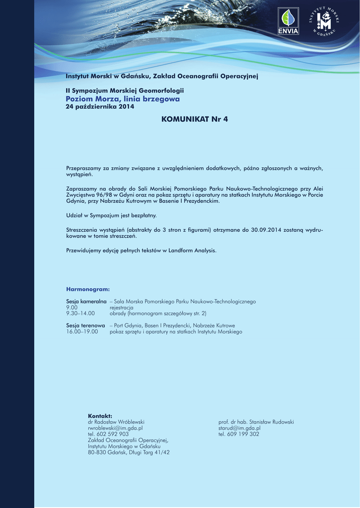 Instytut Morski w Gdańsku, Zakład Oceanografii Operacyjnej II Sympozjum Morskiej Geomorfologii Poziom Morza, linia brzegowa 24 października 2014 KOMUNIKAT Nr 4 Przepraszamy za zmiany związane z uwzględnieniem dodatkowych, późno zgłoszonych a ważnych, wystąpień. Zapraszamy na obrady do Sali Morskiej Pomorskiego Parku Naukowo-Technologicznego przy Alei Zwycięstwa 96/98 w Gdyni oraz na pokaz sprzętu i aparatury na statkach Instytutu Morskiego w Porcie Gdynia, przy Nabrzeżu Kutrowym w Basenie I Prezydenckim. Udział w Sympozjum jest bezpłatny. Streszczenia wystąpień (abstrakty do 3 stron z figurami) otrzymane do 30.09.2014 zostaną wydrukowane w tomie streszczeń. Przewidujemy edycję pełnych tekstów w Landform Analysis. Harmonogram: Sesja kameralna – Sala Morska Pomorskiego Parku Naukowo-Technologicznego 9.00 rejestracja 9.30–14.00 obrady (harmonogram szczegółowy str. 2) Sesja terenowa – Port Gdynia, Basen I Prezydencki, Nabrzeże Kutrowe 16.00–19.00 pokaz sprzętu i aparatury na statkach Instytutu Morskiego Kontakt: dr Radosław Wróblewski [email protected] tel. 602 592 903 Zakład Oceanografii Operacyjnej, Instytutu Morskiego w Gdańsku 80-830 Gdańsk, Długi Targ 41/42 prof. dr hab. Stanisław Rudowski [email protected] tel. 609 199 302 Szczegółowy harmonogram Sympozjum Sala Morska Pomorskiego Parku Naukowo-Technologicznego przy Alei Zwycięstwa 96/98 w Gdyni 09.00 Rejestracja Sesje referatowe 09.30-10.40 Sesja I. Poziom morza 09.30-09.50 Poziom Morza Bałtyckiego i jego geodezyjne ujednolicenie jako baza dla badań strefy brzegowej i dna morskiego Tomasz Wolski, Bernard Wiśniewski, Stanisław Musielak 09.50-10. 10Linia brzegowa fiordu Bellsund Piotr Zagórski 10.10-10.30 Systemy precyzyjnego pozycjonowania pomiarów batymetrycznych Jarosław Nowak, Łukasz Gajewski, Maciej Kałas 10.30-10.40 Dyskusja 10.40-11.00 przerwa na kawę 11.00-12.20Sesja II. Linia brzegowa 11.00-11.20 Zmiany położenia linii brzegowej na km 0,0 - 428,0, na podstawie wyników monitoringu brzegowego z lat 2004-2013 Helena Boniecka 11.20-11.35 Zmienność położenia linii brzegowej południowego Bałtyku na podstawie danych teledetekcyjnych Joanna Dudzińska-Nowak 11.35-11.50 Zmienność położenia linii brzegowych na wybranym odcinku wybrzeża Zatoki Pomorskiej Stanisław Musielak, Paweł Osóch 11.50-12.00 Problem wyznaczenia linii brzegowej na plaży o przebiegu undulowanym Tycjan Wodzinowski 12.00-12.20 Dyskusja 12.20-12.40 przerwa na kawę 12.40-14.00Sesja III. Metody 12.40-13.00 Wieloźródłowa analiza danych w rozważaniach o zmianach linii brzegowej Regina Kramarska, Grzegorz Uścinowicz 13.00-13.20 Ruchome wydmy Słowińskiego Parku Narodowego – studium przypadku monitoringu teledetekcyjnego Łukasz Sławik, Agnieszka Ptak, Radosław Wróblewski, Stanisław Rudowski 13.20-13.40 Elementy morfologiczne polskiej linii brzegowej na cyfrowych mapach geomorfologicznych Zbigniew Zwoliński 13.40-14.00 Dyskusja 14.00-14.30 Lunch 14.30-14.50 Sesja posterowa Joanna Dudzińska-Nowak, P. Wężyk Using multi-temporal air borne laser scanning and the GIS spatial analyses for the study of the Baltic coast (Wolin Island, Baltic Sea, Poland) Łukasz Gajewski, Benedykt Hac, Maciej Kałas, Jarosław Nowak, Stanisław Rudowski, Radosław Wróblewski, Paweł Wysocki Pomiar linii brzegowej. Zarys metodyki Patryk Sitkiewicz, Stanisław Rudowski, Radosław Wróblewski Linia brzegowa – pomiar linii a wyznaczanie granic pól (uwagi metodyczne) Patryk Sitkiewicz Brzeg wydmowy Ustka – Jarosławiec, stan przed budową betonowych umocnień Radosław Wróblewski, Aliaksandr Lisimenka, Stanisław Rudowski, Patryk Sitkiewicz Szczegółowa mapa geomorfologiczna fragmentu dna południowego Bałtyku. Studium przypadku: Stożek ujściowy Wisły Radosław Wróblewski, Maria Rucińska-Zjadacz, Jarosław Nowak Szczegółowa mapa geomorfologiczna fragmentu dna południowego Bałtyku. Studium przypadku: Podwodny stok Cypla Helskiego Radosław Wróblewski, Stanisław Rudowski, Benedykt Hac, Jarosław Nowak Szczegółowa mapa geomorfologiczna fragmentu dna południowego Bałtyku. Studium przypadku: Rejon Oksywia Radosław Wróblewski, Stanisław Rudowski, Łukasz Gajewski Szczegółowa mapa geomorfologiczna fragmentu dna południowego Bałtyku. Studium przypadku: Rejon Jarosławca Rafał Zapłata, Agnieszka Ptak, Łukasz Sławik Przykłady specjalistycznych przetworzeń danych LiDARowych w badaniach i ochronie dóbr kultury i środowiska 14.50-15.00 Podsumowanie i wnioski Sesja terenowa Port Gdynia, Basen I Prezydenta, Nabrzeże Kutrowe 16.00-19.00 Pokaz sprzętu i aparatury na statkach Instytutu Morskiego ZAPRASZAMY