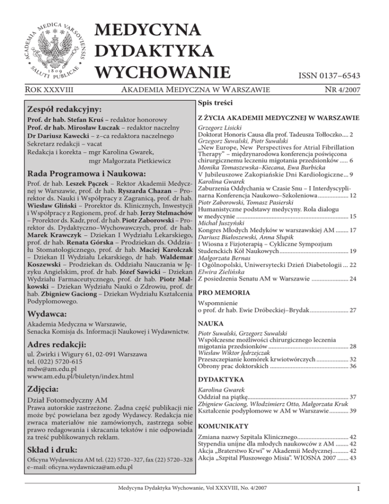 MEDYCYNA DYDAKTYKA WYCHOWANIE ROK XXXVIII ISSN 0137–6543 AKADEMIA MEDYCZNA W WARSZAWIE NR 4/2007 Spis treści Zespół redakcyjny: Prof. dr hab. Stefan Kruś – redaktor honorowy Prof. dr hab. Mirosław Łuczak – redaktor naczelny Dr Dariusz Kawecki – z–ca redaktora naczelnego Sekretarz redakcji – vacat Redakcja i korekta – mgr Karolina Gwarek, mgr Małgorzata Pietkiewicz Rada Programowa i Naukowa: Z ŻYCIA AKADEMII MEDYCZNEJ W WARSZAWIE Grzegorz Lisicki Doktorat Honoris Causa dla prof. Tadeusza Tołłoczko..... 2 Grzegorz Suwalski, Piotr Suwalski „New Europe, New Perspectives for Atrial Fibrillation Therapy” – międzynarodowa konferencja poświęcona chirurgicznemu leczeniu migotania przedsionków...... 6 Monika Tomaszewska–Kiecana, Ewa Burbicka V Jubileuszowe Zakopiańskie Dni Kardiologiczne.... 9 Karolina Gwarek Zaburzenia Oddychania w Czasie Snu – I Interdyscyplinarna Konferencja Naukowo–Szkoleniowa.................... 12 Piotr Zaborowski, Tomasz Pasierski Humanistyczne podstawy medycyny. Rola dialogu w medycynie....................................................................... 15 Michał Juszyński Kongres Młodych Medyków w warszawskiej AM......... 17 Dariusz Białoszewski, Anna Słupik I Wiosna z Fizjoterapią – Cykliczne Sympozjum Studenckich Kół Naukowych............................................ 19 Małgorzata Bernas I Ogólnopolski, Uniwersytecki Dzień Diabetologii.... 22 Elwira Zielińska Z posiedzenia Senatu AM w Warszawie ....................... 24 Prof. dr hab. Leszek Pączek – Rektor Akademii Medycznej w Warszawie, prof. dr hab. Ryszarda Chazan – Prorektor ds. Nauki i Współpracy z Zagranicą, prof. dr hab. Wiesław Gliński – Prorektor ds. Klinicznych, Inwestycji i Współpracy z Regionem, prof. dr hab. Jerzy Stelmachów – Prorektor ds. Kadr, prof. dr hab. Piotr Zaborowski – Prorektor ds. Dydaktyczno–Wychowawczych, prof. dr hab. Marek Krawczyk – Dziekan I Wydziału Lekarskiego, prof. dr hab. Renata Górska – Prodziekan ds. Oddziału Stomatologicznego, prof. dr hab. Maciej Karolczak – Dziekan II Wydziału Lekarskiego, dr hab. Waldemar Koszewski – Prodziekan ds. Oddziału Nauczania w Języku Angielskim, prof. dr hab. Józef Sawicki – Dziekan Wydziału Farmaceutycznego, prof. dr hab. Piotr Małkowski – Dziekan Wydziału Nauki o Zdrowiu, prof. dr hab. Zbigniew Gaciong – Dziekan Wydziału Kształcenia Pro Memoria Podyplomowego. Wspomnienie o prof. dr hab. Ewie Dróbeckiej–Brydak......................... 27 Wydawca: Akademia Medyczna w Warszawie, Senacka Komisja ds. Informacji Naukowej i Wydawnictw. Adres redakcji: ul. Żwirki i Wigury 61, 02-091 Warszawa tel. (022) 5720-615 [email protected] www.am.edu.pl/biuletyn/index.html Zdjęcia: Nauka Piotr Suwalski, Grzegorz Suwalski Współczesne możliwości chirurgicznego leczenia migotania przedsionków................................................... 28 Wiesław Wiktor Jędrzejczak Przeszczepianie komórek krwiotwórczych..................... 32 Obrony prac doktorskich.................................................. 36 Dydaktyka Karolina Gwarek Oddział na piątkę............................................................... 37 Dział Fotomedyczny AM Zbigniew Gaciong, Włodzimierz Otto, Małgorzata Kruk Prawa autorskie zastrzeżone. Żadna część publikacji nie Kształcenie podyplomowe w AM w Warszawie............. 39 może być powielana bez zgody Wydawcy. Redakcja nie zwraca materiałów nie zamówionych, zastrzega sobie prawo redagowania i skracania tekstów i nie odpowiada Komunikaty Zmiana nazwy Szpitala Klinicznego................................. 42 za treść publikowanych reklam. Stypendia unijne dla młodych naukowców z AM......... 42 Skład i druk: Akcja „Braterstwo Krwi” w Akademii Medycznej........... 42 Oficyna Wydawnicza AM tel. (22) 5720–327, fax (22) 5720–328 Akcja „Szpital Pluszowego Misia”. WIOSNA 2007........ 43 e–mail: [email protected] Medycyna Dydaktyka Wychowanie, Vol XXXVIII, No. 4/2007 1 Z życia Akademii Medycznej w Warszawie Doktorat Honoris Causa dla Profesora Tadeusza Tołłoczko – motywacja do dalszego działania Grzegorz Lisicki Prof. Tadeusz Tołłoczko: Myślę, że jest to podchwytliwe pytaRzecznik prasowy Akademii Me- nie, ponieważ „być spełnionym” oznacza dojście do kresu swoich dycznej możliwości oraz brak dalszych Prof. dr hab. Tadeusz Tołłoczko życiowych planów, a ja mimo (ur. 1929). W latach 1990–1996 wszystko nadal dostrzegam szan– Rektor AM w Warszawie. sę samorealizacji. Uczestnik Powstania Warszawskiego, studia ukończył w 1952 r., doktorat obronił w 1963 r., habilitację w 1964 r., profesor zwyczajny od 1991 r., chirurg endokrynolog. Do 2000 r. wykonał największą liczbę operacji nadnerczy, przytarczyc i wyspiaków trzustki w Polsce. Autor ponad 260 prac naukowych i pierwszego w Polsce podręcznika „Podstawy Chirurgii Endokrynologicznej”. Zasłużony nauczyciel akademicki, prowadził 10 rozpraw doktorskich, 14 habilitacyjnych i aż 9 przewodów profesorskich. Kawaler ponad 30 odznaczeń państwowych i uczelnianych, członek licznych organizacji międzynarodowych. Prof. Tadeusz Tołłoczko podczas uroGrzegorz Lisicki: Panie Profesorze, w pierwszych słowach składam gratulacje w związku z tak zaszczytnym wyróżnieniem. Spotykamy się kilka dni po uroczystości nadania Panu Doktoratu Honoris Causa Uniwersytetu Medycznego w Łodzi. Chciałbym zapytać, w kontekście Pana dotychczasowych osiągnięć, czy ten tytuł traktuje Pan jako zawodowe spełnienie, ukoronowanie wielu lat pracy? I czy nie doznaje Pan tego, co nazwałbym „syndromem sportowca, który wygrał dwie olimpiady” – poczucia, że już trudno osiągnąć więcej oraz płynącej z tego demotywacji? 2 bycia lepszym od siebie, i to niezależnie od wieku. Na tym właśnie polega samorealizacja. W młodości byłem przekonany, że życie jest przyjemnością, potem – że jest obowiązkiem, następnie że