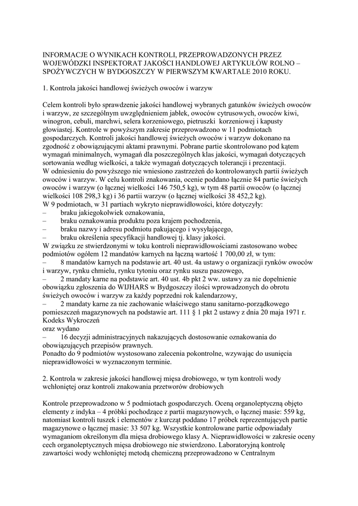 INFORMACJE O WYNIKACH KONTROLI, PRZEPROWADZONYCH PRZEZ WOJEWÓDZKI INSPEKTORAT JAKOŚCI HANDLOWEJ ARTYKUŁÓW ROLNO – SPOŻYWCZYCH W BYDGOSZCZY W PIERWSZYM KWARTALE 2010 ROKU. 1. Kontrola jakości handlowej świeżych owoców i warzyw Celem kontroli było sprawdzenie jakości handlowej wybranych gatunków świeżych owoców i warzyw, ze szczególnym uwzględnieniem jabłek, owoców cytrusowych, owoców kiwi, winogron, cebuli, marchwi, selera korzeniowego, pietruszki korzeniowej i kapusty głowiastej. Kontrole w powyższym zakresie przeprowadzono w 11 podmiotach gospodarczych. Kontroli jakości handlowej świeżych owoców i warzyw dokonano na zgodność z obowiązującymi aktami prawnymi. Pobrane partie skontrolowano pod kątem wymagań minimalnych, wymagań dla poszczególnych klas jakości, wymagań dotyczących sortowania według wielkości, a także wymagań dotyczących tolerancji i prezentacji. W odniesieniu do powyższego nie wniesiono zastrzeżeń do kontrolowanych partii świeżych owoców i warzyw. W celu kontroli znakowania, ocenie poddano łącznie 84 partie świeżych owoców i warzyw (o łącznej wielkości 146 750,5 kg), w tym 48 partii owoców (o łącznej wielkości 108 298,3 kg) i 36 partii warzyw (o łącznej wielkości 38 452,2 kg). W 9 podmiotach, w 31 partiach wykryto nieprawidłowości, które dotyczyły: – braku jakiegokolwiek oznakowania, – braku oznakowania produktu poza krajem pochodzenia, – braku nazwy i adresu podmiotu pakującego i wysyłającego, – braku określenia specyfikacji handlowej tj. klasy jakości. W związku ze stwierdzonymi w toku kontroli nieprawidłowościami zastosowano wobec podmiotów ogółem 12 mandatów karnych na łączną wartość 1 700,00 zł, w tym: – 8 mandatów karnych na podstawie art. 40 ust. 4a ustawy o organizacji rynków owoców i warzyw, rynku chmielu, rynku tytoniu oraz rynku suszu paszowego, – 2 mandaty karne na podstawie art. 40 ust. 4b pkt 2 ww. ustawy za nie dopełnienie obowiązku zgłoszenia do WIJHARS w Bydgoszczy ilości wprowadzonych do obrotu świeżych owoców i warzyw za każdy poprzedni rok kalendarzowy, – 2 mandaty karne za nie zachowanie właściwego stanu sanitarno-porządkowego pomieszczeń magazynowych na podstawie art. 111 § 1 pkt 2 ustawy z dnia 20 maja 1971 r. Kodeks Wykroczeń oraz wydano – 16 decyzji administracyjnych nakazujących dostosowanie oznakowania do obowiązujących przepisów prawnych. Ponadto do 9 podmiotów wystosowano zalecenia pokontrolne, wzywając do usunięcia nieprawidłowości w wyznaczonym terminie. 2. Kontrola w zakresie jakości handlowej mięsa drobiowego, w tym kontroli wody wchłoniętej oraz kontroli znakowania przetworów drobiowych Kontrole przeprowadzono w 5 podmiotach gospodarczych. Oceną organoleptyczną objęto elementy z indyka – 4 próbki pochodzące z partii magazynowych, o łącznej masie: 559 kg, natomiast kontroli tuszek i elementów z kurcząt poddano 17 próbek reprezentujących partie magazynowe o łącznej masie: 33 507 kg. Wszystkie kontrolowane partie odpowiadały wymaganiom określonym dla mięsa drobiowego klasy A. Nieprawidłowości w zakresie oceny cech organoleptycznych mięsa drobiowego nie stwierdzono. Laboratoryjną kontrolę zawartości wody wchłoniętej metodą chemiczną przeprowadzono w Centralnym Laboratorium GIJHARS w Poznaniu. Wyniki analiz laboratoryjnych nie wykazały zawyżonej ilości wody wchłoniętej w mięsie drobiowym. W celu przeprowadzenia kontroli w zakresie znakowania pobrano 21 próbek mięsa oraz 7 próbek przetworów mięsnych. Nie stwierdzono nieprawidłowości w żadnym z zakładów, nie stwierdzono także by produkty konwencjonalne były znakowane jako ekologiczne. Kontrolowane podmioty oznakowanych wyrobów nie stosują nazw produktów posiadających chronione nazwy pochodzenia, chronione oznaczenie geograficzne, będące gwarantowanymi tradycyjnymi specjalnościami. W trakcie kontroli nie zastosowano sankcji karnych. 3. Kontrola jakości handlowej przetworów rybnych Kontrole w ww. zakresie przeprowadzono w 3 podmiotach gospodarczych wytypowanych analizy ryzyka oraz w związku z informacjami o niewłaściwej jakości handlowej przetworów rybnych nadesłanymi z innych instytucji. W trakcie kontroli w 3 podmiotach pobrano ogółem 15 próbek przetworów rybnych. W wyniku badań laboratoryjnych nieprawidłowości stwierdzono w trzech próbkach, których producentami były 2 z 3 kontrolowanych podmiotów. Nieprawidłowości dotyczyły przede wszystkim: · zawyżonej zawartości składników w stosunku do deklaracji producenta – wydano 1 decyzją administracyjną, zgodnie z art. 40a ust.1 pkt 3 ustawy z dnia 21 grudnia 2000 r. o jakości handlowej artykułów rolno-spożywczych, wymierzającą karę pieniężną w wysokości 800 zł; · zawyżonej zawartości glazury i zaniżonej zawartości mięsa ryby w stosunku do deklaracji producenta – wobec podmiotu wszczęto postępowanie administracyjne, na skutek zrealizowanych na wniosek strony ponownych badań, które nie potwierdziły zawyżonej zawartości glazury, wydano decyzję umarzającą postępowanie administracyjne. Kontrolą prawidłowości znakowania objęto ogółem 21 partii przetworów rybnych. W trakcie kontroli potwierdzono, iż kontrolowane partie były oznakowane zgodnie z obowiązującymi przepisami, produkty konwencjonalne nie posiadały elementów znakowania sugerujących pochodzenie z rolnictwa ekologicznego. Ponadto potwierdzono, że kontrolowane podmioty nie stosowały nazw produktów posiadających chronione nazwy pochodzenia, chronione oznaczenia geograficzne i będących gwarantowanymi tradycyjnymi specjalnościami. 4. Kontrola w zakresie prawidłowości znakowania wybranych artykułów rolno-spożywczych z uwzględnieniem artykułów pochodzących z przetwórni ekologicznych Celem kontroli było sprawdzenie prawidłowości znakowania wybranych artykułów rolno-spożywczych, tj. napojów bezalkoholowych oraz fermentowanych nap