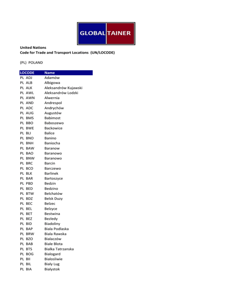 United Nations Code for Trade and Transport Locations (UN/LOCODE) (PL) POLAND LOCODE PL ADJ PL ALB PL ALK PL AWL PL AWN PL AND PL ADC PL AUG PL BMS PL BBO PL BWE PL BLI PL BNO PL BNH PL BAW PL BAO PL BNW PL BRC PL BCO PL BLK PL BAR PL PBD PL BED PL BTW PL BDZ PL BEC PL BEL PL BET PL BEZ PL BID PL BAP PL BRW PL BZO PL BAB PL BTS PL BOG PL BII PL BIL PL BIA Name Adamów Albigowa Aleksandrów Kujawski Aleksandrów Lodzki Alwernia Andrespol Andrychów Augustów Babimost Baboszewo Backowice Balice Banino Baniocha Baranow Baranowo Baranowo Barcin Barczewo Barlinek Bartoszyce Bedzin Bedzino Belchatów Belsk Duzy Belzec Belzyce Bestwina Bezledy Biadoliny Biala Podlaska Biala Rawska Bialaczów Biale Blota Bialka Tatrzanska Bialogard Bialosliwie Bialy Lug Bialystok PL PL PL PL PL PL PL PL PL PL PL PL PL PL PL PL PL PL PL PL PL PL PL PL PL PL PL PL PL PL PL PL PL PL PL PL PL PL PL PL PL PL PL PL PL PL PL PL PL PL BZY BYW BLW BSK BLS BIB BIE BST BRT BOJ BKW BKP BIK BHW BLA BLE BLO BLC BOB BWO BCA BGZ BGY BGW BGA BWG BJW BSW BOL BOW BOO BSZ BON BSH BOK BSU BOR BZK OZH BOZ BLN BRN BNS BNA BRA BRL BRS BRI BRY BRG Bidziny Bielany Wroclawskie Bielawa Bielsk Bielsk Podlaski Bielsko-Biala Bierun Bierun Stary Bierutów Bilgoraj Biskupice Biskupice Podgórne Biskupiec Blachownia Blaszki Bledów Blonie Bobolice Bobrowniki Bobrowo Bochnia Bogaczewo Bogatynia BoguchwaBa Boguchwala Boguszów-Gorce Bojanowo Boleslaw Boleslawiec Bolimów Bolków Bolszewo Bonikowo Borek Szlachecki Borek Wielkopolski Borne Borów Borzeciczki Borzytuchom Bozepole Wielkie Bralin Braniewo Bransk Brodnica Brodnica Brójce Bronisze Brwinów Brynica Brzeg PL PL PL PL PL PL PL PL PL PL PL PL PL PL PL PL PL PL PL PL PL PL PL PL PL PL PL PL PL PL PL PL PL PL PL PL PL PL PL PL PL PL PL PL PL PL PL PL PL PL BZD BKI BRZ BZC BRE OZA BNC BRO BRK BZR BZZ BWC BZN BUK BUO BUW BZI BUS BYC BZG BYK BYT BYO CEK CEL CHA CHL CLK CMK CHO CLM CHM CHI CHZ CWL CDL CHD CHE CJO CRS CRL CZL CRZ CRW CHS CH3 CNW CZO CHY HCL Brzeg Dolny Brzesc Kujawski Brzesko Brzeszcze Brzezie Brzeziny Brzeznica Brzeznio Brzostek Policzko Brzoza Brzozów Buczkowice Budzyn Buk Bukowiec Bukowno Burzenin Busko-Zdrój Byczyna Bydgoszcz Bystrzyca Klodzka Bytom Bytow Cekcyn Celestynow Chabowka Chalupy Chelm Chelmek Chelmno Chelmza Chmielnik Chmielów Chocianów Chociwel Chodel Chodziez Chojnice Chojnów Choroszcz Chorula Chorzel Chorzele Chorzow Choszczno Chróscice Chrzanow Chwaszczyno Chybie Chyliczki PL PL PL PL PL PL PL PL PL PL PL PL PL PL PL PL PL PL PL PL PL PL PL PL PL PL PL PL PL PL PL PL PL PL PL PL PL PL PL PL PL PL PL PL PL PL PL PL PL PL CNO CIS CAZ CIC CIE CIK CWY CPC CZY CGA CLA GUB CYM CZK ZAA CBA CAR CZA CYB CHW CZD CLZ CSM CZE CZI OZK CZR CWA CKL CWO CZB CZW OZJ CLH CSN CZU CZZ CWC DBE DBA DAB DBW DAT DBK DBN DAL DMC DAR DAS DEB Chynow Ciasna Ciazen Ciche Ciechanów Ciechocinek Cieplowody Cierpice Cieszyn Cigacice Cmolas Cybinka Cybulice Male Czaplinek Czarna Czarna Bialostocka Czarna Woda Czarnków Czarny Bor Czchow Czechowice-Dziedzice Czeladz Czermin Czernica Czernichow Czerniewice Czersk Pomorski Czerwiénsk Czerwionka Czerwonak Czestkow B Czestochowa Czlopa Czluchow Czosnów Czudec Czyzew Czyzowice Dabie Dabrowa Bialostocka Dabrowa Górnicza Dabrowa Rusiecka Dabrowa Tarnowska Dabrówka Dabrowno Daleszyce Damnica Darlowo Daszyna Debica PL PL PL PL PL PL PL PL PL PL PL PL PL PL PL PL PL PL PL PL PL PL PL PL PL PL PL PL PL PL PL PL PL PL PL PL PL PL PL PL PL PL PL PL PL PL PL PL PL PL DBL DKA DDN DCE DBG DZC DOM DBZ DOB DBR OZL DZE DNW DOK DSK DLN DOL DPW DOR DRP DZK DRY DRZ DUB OZN DUK DKC DUS DWK DYW DZI DZD DZA ZIC DZL DZZ DZO ELB QKD FBI FAB FJC FAL FBK FRY GAB GDK NOG GAL GLE Deblin Debnica Kaszubska Debno Dobczyce Dobiegniew Dobieszowice Dobre Miasto Dobrodzien Dobron Dobroszyce Dobrzyca Dobrzykowice Wroclawskie Dobrzyn nad Wisla Dobrzyniewo Koscielne Dolsk Doluje Doluje Mierzyn Dopiewo Dorohusk Drawsko Pomorskie Drezdenko-Chyze Drygaly Drzewica Dubiecko Duchnice Dukla Dulga Koscielna Duszniki Zdrój Dwikozy Dywity Dzialdowo Dzialoszyce Dzialoszyn Dziecmierowo Dziekanów Lesny Dzierzazno Dzierzoniów Elblag Elk Fabianki Fabianów Fajslawice Falkowo Frombork Frysztak Gabin Gadki Gajecice nowe Galewice Garbatka-Letnisko PL PL PL PL PL PL PL PL PL PL PL PL PL PL PL PL PL PL PL PL PL PL PL PL PL PL PL PL PL PL PL PL PL PL PL PL PL PL PL PL PL PL PL PL PL PL PL PL PL PL GAR GWI GDN GDW GDY GIE GRC GTW GIZ GNK GKI GNN GWC GGO GLW GWM GLS GWO GLU GLO GZA GW2 GZ9 MZG GRW GNI GNW GNZ GCW GOC GOZ GOM GKW GOG GLZ GDP GLN GOL GOE GNA GLK GOD GUW GOU GON GRA GOK GRP GSL GZD Garbów Garwolin Gdansk Gdów Gdynia Gielniów Gieralcice Gieraltowiec Gizycko Glinianka Glinki Glinnik Gliwice Glogoczów Glogow Glogów Malopolski Gloskow Glowno Glucholazy Gluchowo Gluszyca Gmina Potegowo Gmina Zabia Wola Gnatowice Gniew Gniewino Gniewkowo Gniezno Goclaw Goczalków Goczalkowice Zdrój Godziesze Male Godzikowice Gogolin Golczewo Goldap Goledzinów Goleniów Goleszów Golina Golków Golub-Dobrzyn Goluchów Gomunice Goniadz Gora Góra Kalwaria Góra Pulawska Gora Slaska Górazdze PL PL PL PL PL PL PL PL PL PL PL PL PL PL PL PL PL PL PL PL PL PL PL PL PL PL PL PL PL PL PL PL PL PL PL PL PL PL PL PL PL PL PL PL PL PL PL PL PL PL GLC GRI GZO GZW GOW GOR GZE GOO GCO LDG GTY GYN GOS GZZ GIC GBW GNP GKK GJW GBN ZIN GPS GRK GZK GRO GRD GRU GRY GRN GSK GRZ GRB GZM GUZ HJK HAL HLM HKW HEL HRE HBZ ILA LWM ILW OZP ILZ INO OYI IST IWA Gorlice Gornica Gorzno Gorzow Gorzów Wielkopolski Gorzuchowo Gorzyce (Tarnobrzeg) Goscicino Goscino Gostków Gostyn Gostynin Goswinowice Goszczyn Grabica Grabow Grabów nad Prosna Grabowo Koscierskie Grajewo Grebocin Grodziczno Grodzisk Grodzisk Mazowiecki Grodzisk Wielkopolski Grojec Gromadka Grudziadz Gryfice Gryfino Gryfow Slaski Grzybow Swietokrzyskie Grzybowo Grzymiszew Guzów Hajnówka Halinów Halinow Minsk Harklowa Hel Hrebenne Hrubieszów Ilawa Ilów Ilowa Ilowo Ilza Inowroclaw Insko Istebna Iwaniska PL PL PL PL PL PL PL PL PL PL PL PL PL PL PL PL PL PL PL PL