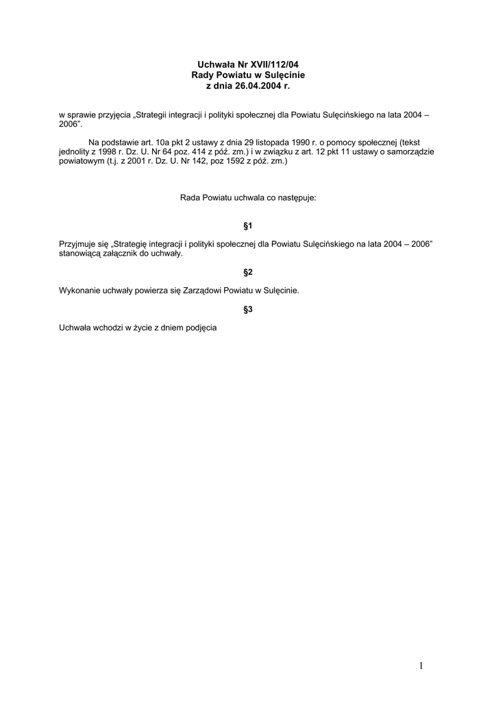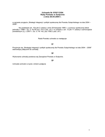 Uchwała Nr XVII/112/04 Rady Powiatu w Sulęcinie z dnia 26.04.2004 r. w sprawie przyjęcia „Strategii integracji i polityki społecznej dla Powiatu Sulęcińskiego na lata 2004 – 2006”. Na podstawie art. 10a pkt 2 ustawy z dnia 29 listopada 1990 r. o pomocy społecznej (tekst jednolity z 1998 r. Dz. U. Nr 64 poz. 414 z póź. zm.) i w związku z art. 12 pkt 11 ustawy o samorządzie powiatowym (t.j. z 2001 r. Dz. U. Nr 142, poz 1592 z póź. zm.) Rada Powiatu uchwala co następuje: §1 Przyjmuje się „Strategię integracji i polityki społecznej dla Powiatu Sulęcińskiego na lata 2004 – 2006” stanowiącą załącznik do uchwały. §2 Wykonanie uchwały powierza się Zarządowi Powiatu w Sulęcinie. §3 Uchwała wchodzi w życie z dniem podjęcia 1 Załącznik do Uchwały nr XVII/112/04 Rady Powiatu w Sulęcinie z dnia 26.04.2004 r. POWIATOWA STRATEGIA INTEGRACJI I POLITYKI SPOŁECZNEJ NA LATA 2004 - 2006 SULĘCIN 2004 2 3 WSTĘP Nowa ustawa o pomocy społecznej kładzie nacisk na aktywizację osób, które znalazły się w trudnej sytuacji, a jednocześnie wprowadza nowe kryteria dochodowe uprawniające do otrzymania pomocy i daje gwarancję minimalnego świadczenia. Celem pomocy społecznej, będącej instytucją polityki społecznej państwa, jest: w miarę możliwości doprowadzenie do życiowego usamodzielnienia osób i rodzin oraz ich integracji ze środowiskiem. integracja ze środowiskiem osób wykluczonych społecznie. umożliwienie osobom i rodzinom przezwyciężanie trudnych sytuacji życiowych, których nie są one w stanie pokonać wykorzystując własne środki, możliwości i uprawnienia. zaspokajanie niezbędnych potrzeb życiowych osób i rodzin oraz umożliwianie im bytowania w warunkach odpowiadających godności człowieka zapobieganie powstawaniu trudnych sytuacji życiowych osób i rodzin. udzielenie profesjonalnej pomocy rodzinom dotkniętym skutkami patologii społecznych, w tym przemocą w rodzinie. Sformułowane w ustawie cele nawiązują do wartości uniwersalnych, które wyznaczają kształt i kierunki pomocy społecznej, takie jak: sprawiedliwość społeczna rozumiana jako stwarzanie równych szans; godność jednostki i godne życie rodziny; rodzina jako silna podstawowa jednostka społeczna; samostanowienie o sobie przy równoczesnym prawie do pomocy i ochronie przed uzależnieniem sięgania do pomocy; subsydiarność rozumiana jako zasada, zgodnie z którą najpierw należy wymagać od siebie i liczyć na najbliższy krąg, a dopiero potem zwracać się po pomoc na zewnątrz; solidarność społeczna, samopomoc, integracja społeczna na poziomie lokalnym. Powiatowa strategia integracji i polityki społecznej ma stanowić dokument na podstawie, którego można będzie racjonalnie organizować przyszłe działania w zakresie polityki społecznej. Strategia jako dokument otwarty, powinna być na bieżąco być aktualizowana zarówno wtedy gdy następują zmiany prawne jak i w momencie gdy zostaną zdiagnozowane kolejne problemy i określone sposoby ich rozwiązania. 1. CHARAKTERYSTYKA POWIATU SULĘCIŃSKIEGO Historia Powiatu Sulęcińskiego, jako jednostki administracyjnej, sięga początków XIX wieku. W 1810 roku zlokalizowana została w Sulęcinie siedziba starostwa powiatowego. Z małymi przerwami funkcjonowała ona do 1975 roku. Przed II Wojną Światową powiat obejmował 81 ówczesnych gmin i 341 miejscowości. Obecnie w jego skład wchodzi pięć jednostek terytorialnych: Sulęcin, Lubniewice, Torzym, Krzeszyce i Słońsk. Powiat, zajmujący obszar 1 177 km2, zamieszkuje niespełna 37 tys. osób i należy on do najmniej zaludnionych regionów województwa lubuskiego. Mimo małej gęstości zaludnienia, (31 osób na km2 w porównaniu z 52 osobami w powiecie gorzowskim) powiat ten jest prężnie rozwijającą się jednostką administracyjną. Liczba ludności Powiatu Sulęcińskiego – stan na III kwartał 2003 r. Kobiety Mężczyźni 17 811 17 663 Ogółem 35 474 Tabela 1. Liczba ludności Powiatu Sulęcińskiego 2. ZADANIA I ORGANIZACJA POMOCY SPOŁECZNEJ Podstawowe zadania pomocy społecznej wynikają z zapisów ustawy o pomocy społecznej z dnia 29 listopada 1990 r. Dz. U. nr 64 poz. 414 z 1998 r. z póź. zm. Obowiązek wykonywania zadań pomocy społecznej spoczywa na organach jednostki samorządu terytorialnego oraz na administracji rządowej w zakresie ustalonym ustawami. Organy administracji samorządowej organizują pomoc społeczną współpracując w tym zakresie z organizacjami społecznymi, Kościołem Katolickim, innymi kościołami, związkami wyznaniowymi, fundacjami, stowarzyszeniami, pracodawcami oraz osobami fizycznymi i prawnymi. Zakres zadań pomocy społecznej obejmuje w szczególności: 4 1) tworzenie warunków organizacyjnych funkcjonowania pomocy społecznej, w tym rozbudowy infrastruktury socjalnej, 2) analizę i ocenę zjawisk rodzących zapotrzebowanie na świadczenia pomocy społecznej, 3) przyznawanie i wypłacanie przewidzianych ustawą świadczeń, 4) pobudzanie społecznej aktywności w zaspokajaniu niezbędnych potrzeb życiowych osób i rodzin, 5) pracę socjalną, rozumianą jako działalność zawodową, skierowaną na pomoc osobom i rodzinom we wznowieniu lub odzyskaniu zdolności do funkcjonowania w społeczeństwie oraz na tworzenie warunków sprzyjających takim celom. Zadania pomocy społecznej na poziomie gminy realizują ośrodki pomocy społecznej, na poziomie powiatu – centrum pomocy rodzinie. Na terenie powiatu funkcjonuje pięć ośrodków pomocy społecznej (OPS): OPS w Krzeszycach OPS w Lubniewicach OPS w Słońsku OPS w Sulęcinie OPS w Torzymiu ul. Skwierzyńska 16 ul. Boh. Stalingradu 16 a ul. Sikorskiego 15 ul. E. Plater 14 ul. Woj. Polskiego 32 Zatrudnienie w poszczególnych ośrodkach pomocy społecznej przedstawia poniższa tabela: Ośrodek Pomocy Społecznej Liczba zatrudnionych osób Kierownik 4 pracowników socjalnych OPS w Torzymiu 5 opiekunek 30 osób (w tym 8 osób zatrudnio