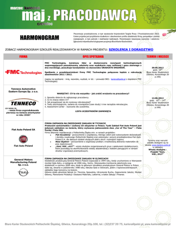 ZOBACZ HARMONOGRAM SZKOLEŃ REALIZOWANYCH W RAMACH PROJEKTU: SZKOLENIA I DORADZTWO FIRMA OPIS SPOTKANIA FMC Technologies, światowy lider w dostarczaniu rozwiązań technologicznych wspomagających poszukiwania, odwierty oraz wydobycie ropy naftowej i gazu ziemnego z dna morskiego, poszukuje kandydatów na stanowisko GRADUATE ENGINEER. Spotkanie z przedstawicielami firmy FMC Technologies połączone będzie z rekrutacją absolwentów 2011 i 2012. (zapisy na spotkanie - imię, nazwisko, wydział, nr tel. – prowadzi BKS: [email protected] z dopiskiem FMC Technologies) Tenneco Automotive Eastern Europe Sp. z o.o. CZY WIESZ, ŻE: - nasza firma wyprodukowała pierwszy na świecie amortyzator w roku 1926? Fiat Auto Poland SA General Motors Manufacturing Poland Sp. z o.o. TERMIN I MIEJSCE 30.05.2012 godz. 1000 Biuro Karier Studenckich (Gliwice, Konarskiego 20 p.106) WARSZTAT: CV to nie wszystko - jak zrobić wrażenie na pracodawcy? 1. 2. 3. 4. 5. Sposoby dotarcia do najlepszego pracodawcy. Co to znaczy dobre CV? Jak przygotować się do rozmowy rekrutacyjnej? Testy psychologiczne, zadania do rozwiązania (case study) i inne narzędzia rekrutacyjne. Assessment Center - wyzwanie dla uczestnika. 12.06.2012 godz. 1000 – 1400 Biuro Karier Studenckich (Gliwice, Konarskiego 20 p.106) LISTA UCZESTNIKÓW ZAMKNIĘTA FIRMA ZAPRASZA NA ZWIEDZANIE ZAKŁADU W TYCHACH! Producent samochodów i czołowy ich eksporter w Polsce. Tyski Zakład Fiat Auto Poland jest jedynym zakładem na świecie, który wytwarza jednocześnie dwa „Car of The Year” – Fiata Pandę i Fiata 500. Firma aktywnie współpracuje z Politechniką Śląska min. w ramach projektów: Fiat Accademy - porozumienie o współpracy, którego celem jest wykorzystanie doświadczeń i dorobku naukowego Politechniki Śląskiej oraz potencjału i pozycji przedsiębiorstwa Fiat Auto Poland S.A. dla dalszych działań służących dobru stron i rozwojowi regionu. Nasz Dyplom – porozumienie o organizacji praktyk z możliwością zbierania materiałów do prac dyplomowych „Veni, Vidi…vici?” - wizyty studyjne zorganizowanych grup z opiekunami dydaktycznymi, które pozwalają na skonfrontowanie wiedzy akademickiej z realiami panującymi w ramach struktur organizacji przemysłowych; FIRMA ZAPRASZA NA ZWIEDZANIE ZAKŁADU W GLIWICACH! Działalność produkcyjną General Motors Poland rozpoczęła w 1994 roku, kiedy uruchomiono w Warszawie montaż Opla Astry, a następnie od 1998 roku, Vectry. Warszawska montownia zakończyła swą działalność w czerwcu 2000 roku, kiedy to głównym ośrodkiem produkcyjnym General Motors w Polsce stała się, otwarta w październiku 1998 roku, fabryka Opla w Gliwicach, jeden z najnowocześniejszych zakładów tego koncernu na świecie. Główne działy gliwickiej fabryki to: Tłocznia, Spawalnia, Utrzymanie Ruchu, Zapewnienie Jakości, Montaż Główny, Planowanie Produkcji i Dostawa Materiału, Lakiernia, a także Zakupy i Finanse. Terminy oraz warunki udziału dostępne są na stronie www.kariera.polsl.pl w zakładce Wizyty studyjne Projekt "Veni, Vidi...Vici?"