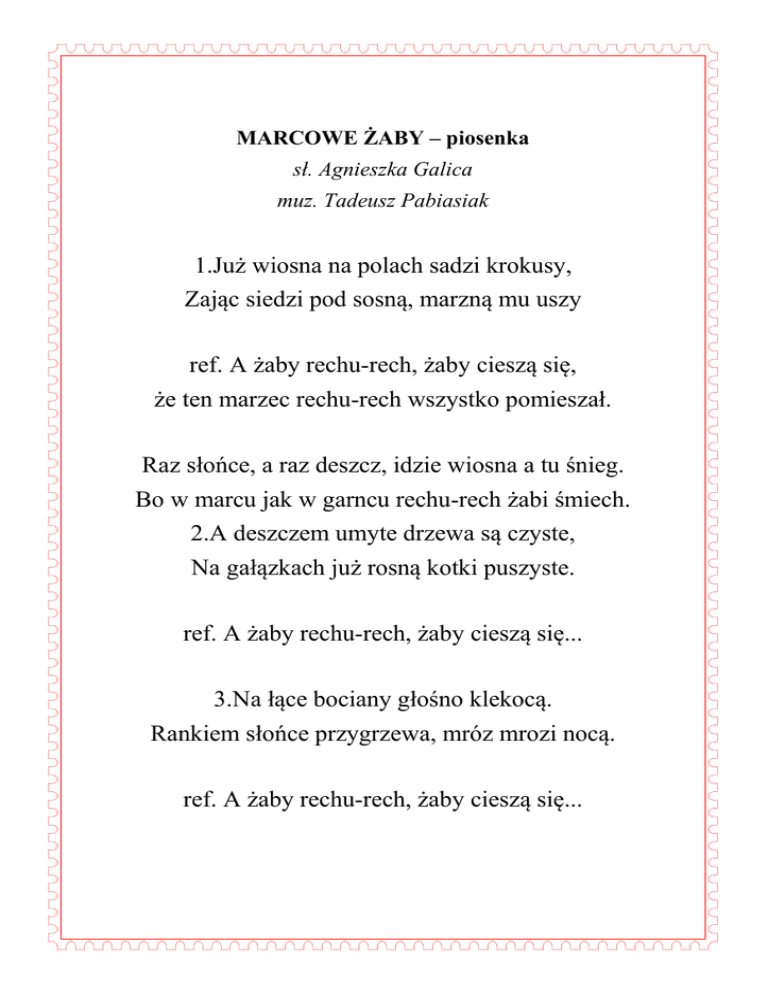 MARCOWE ŻABY – piosenka sł. Agnieszka Galica muz. Tadeusz Pabiasiak 1.Już wiosna na polach sadzi krokusy, Zając siedzi pod sosną, marzną mu uszy ref. A żaby rechu-rech, żaby cieszą się, że ten marzec rechu-rech wszystko pomieszał. Raz słońce, a raz deszcz, idzie wiosna a tu śnieg. Bo w marcu jak w garncu rechu-rech żabi śmiech. 2.A deszczem umyte drzewa są czyste, Na gałązkach już rosną kotki puszyste. ref. A żaby rechu-rech, żaby cieszą się... 3.Na łące bociany głośno klekocą. Rankiem słońce przygrzewa, mróz mrozi nocą. ref. A żaby rechu-rech, żaby cieszą się...