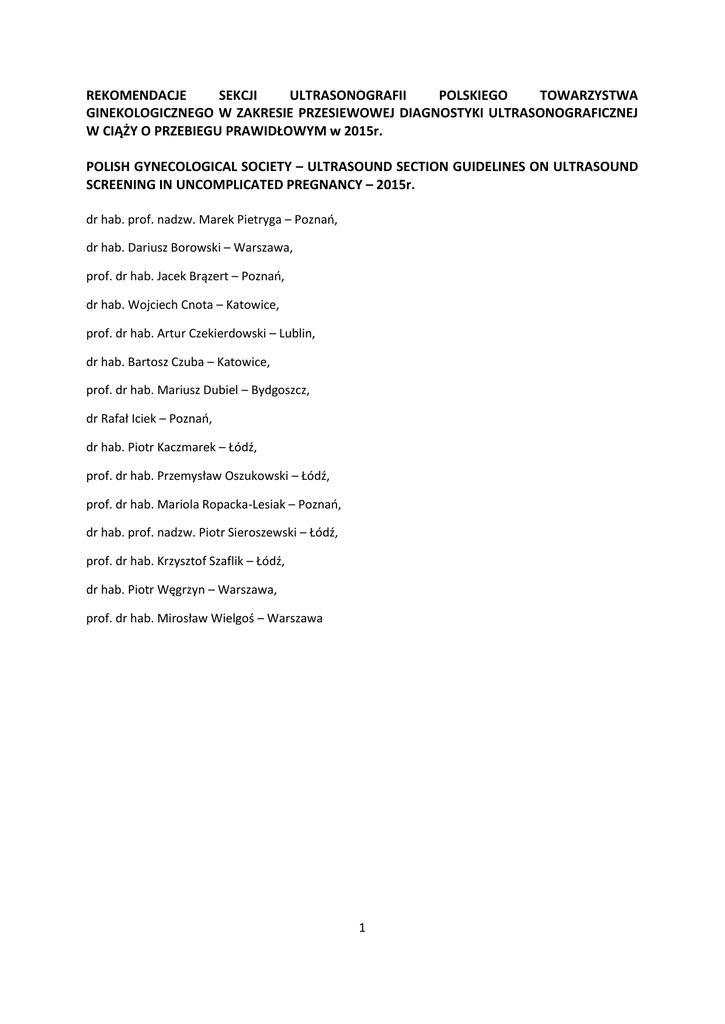 REKOMENDACJE SEKCJI ULTRASONOGRAFII POLSKIEGO TOWARZYSTWA GINEKOLOGICZNEGO W ZAKRESIE PRZESIEWOWEJ DIAGNOSTYKI ULTRASONOGRAFICZNEJ W CIĄŻY O PRZEBIEGU PRAWIDŁOWYM w 2015r. POLISH GYNECOLOGICAL SOCIETY – ULTRASOUND SECTION GUIDELINES ON ULTRASOUND SCREENING IN UNCOMPLICATED PREGNANCY – 2015r. dr hab. prof. nadzw. Marek Pietryga – Poznań, dr hab. Dariusz Borowski – Warszawa, prof. dr hab. Jacek Brązert – Poznań, dr hab. Wojciech Cnota – Katowice, prof. dr hab. Artur Czekierdowski – Lublin, dr hab. Bartosz Czuba – Katowice, prof. dr hab. Mariusz Dubiel – Bydgoszcz, dr Rafał Iciek – Poznań, dr hab. Piotr Kaczmarek – Łódź, prof. dr hab. Przemysław Oszukowski – Łódź, prof. dr hab. Mariola Ropacka-Lesiak – Poznań, dr hab. prof. nadzw. Piotr Sieroszewski – Łódź, prof. dr hab. Krzysztof Szaflik – Łódź, dr hab. Piotr Węgrzyn – Warszawa, prof. dr hab. Mirosław Wielgoś – Warszawa 1 I. WPROWADZENIE. Sekcja Ultrasonografii Polskiego Towarzystwa Ginekologicznego jest organizacją promującą rozwój badań obrazowych w diagnostyce położniczo-ginekologicznej, wspomagającą proces edukacyjny, w aspekcie klinicznym wykonywania ww. badań. Aktualizacja dotychczasowych Rekomendacji ma na celu uporządkowanie oraz wskazanie optymalnego schematu wykonywania badań ultrasonograficznych w ciąży o przebiegu prawidłowym. W związku z pojawieniem się nowych algorytmów oraz wdrożeniem do praktyki klinicznej nowych metod diagnostyki przesiewowej, zaistniała potrzeba umiejscowienia ich w codziennej praktyce. Niniejsza aktualizacja Rekomendacji pozostaje w pełnej zgodności ze Standardami organizacji międzynarodowych m. in. Międzynarodowego Towarzystwa Ultrasonografii w Ginekologii i Położnictwie (ISUOG 2010, 2013), Amerykańskiego Kolegium Ginekologów i Położników (ACOG) oraz Fundacji Medycyny Płodu (FMF 2013). Badanie ultrasonograficzne jest podstawowym narzędziem diagnostycznym w przebiegu ciąży. Zgodnie z Standardami Polskiego Towarzystwa Ginekologicznego w zakresie prowadzenia ciąży o przebiegu prawidłowym, badanie to powinno być oferowane wszystkim ciężarnym, co najmniej 3 razy w trakcie trwania ciąży. W zależności od tygodnia ciąży, w którym badanie jest wykonywane, jego cel jest także inny. 1. Jaki jest cel wykonywania badań ultrasonograficznych w ciąży? Podstawowym celem badań ultrasonograficznych w ciąży jest zminimalizowanie wystąpienia niekorzystnych wyników położniczych, mogących wystąpić na skutek nierozpoznania wady u płodu, niedojrzałości płodu lub innych zaburzeń wewnątrzmacicznych. Zadaniem lekarza wykonującego badanie przesiewowe jest skierowanie ciężarnej do ośrodka referencyjnego w każdym przypadku wątpliwości diagnostycznych lub podejrzenia nieprawidłowego rozwoju płodu. Na każdym etapie rozwoju ciąży, badanie ultrasonograficzne ma inną specyfikę. Inny jest cel badania w I trymetrze ciąży w odróżnieniu od II i III trymestru. Niezależnie od okresu ciąży w którym badanie jest wykonywane, ciężarna poddawana badaniu powinna otrzymać od lekarza przystępną informację o uzyskanym wyniku. 2. U kogo powinno być wykonane badanie ultrasonograficzne? Przesiewowe badanie ultrasonograficzne powinno być oferowane wszystkim ciężarnym. 3. Czy badanie ultrasonograficzne jest bezpieczne? W chwili obecnej nie istnieją badania, których wyniki sugerowałyby, że badanie ultrasonograficzne wpływa niekorzystnie na rozwój płodu. Wykonując to badanie należy kierować się zasadą minimalnej ekspozycji i czasu badania pozwalającego na kompletne wykonanie procedury – zasada ALARA (As Low As Reasonably Achievable. W szczególności wartości wskaźników termicznego (TI) oraz mechanicznego (MI) powinny być poniżej 1, w trakcie całego badania (TI<1, MI<1). Zasady bezpieczeństwa badań ultrasonograficznych zostały szczegółowo opisane w odrębnych publikacjach [1]. 4. Jakie wymagania powinien spełniać sprzęt ultrasonograficzny? Aparat ultrasonograficzny w diagnostyce położniczo-ginekologicznej powinien posiadać: prezentację 2D w czasie rzeczywistym, co najmniej 128-stopniową skalę szarości, powinien 2 mieć możliwość pomiaru odległości (co najmniej dwóch pomiarów), obwodu i pola powierzchni oraz program położniczy. Ponadto powinien być wyposażony w głowice przezbrzuszną i przezpochwową z możliwością dokumentacji fotograficznej i elektronicznej. Cennym uzupełnieniem funkcji aparatu ultrasonograficznego jest opcja kolorowego Dopplera. 5. Co powinien zawierać wynik badania ultrasonograficznego? Wynik badania ultrasonograficznego powinien zawierać następujące dane: a. imię, nazwisko, datę urodzenia i PESEL pacjentki, b. miejsce i datę badania, imię i nazwisko wykonującego badanie, c. informację dotyczącą nazwy aparatu ultrasonograficznego oraz rodzaju i częstotliwości głowic, którymi badanie zostało wykonane, d. rozpoznanie wstępne lekarza kierującego, e. data ostatniej miesiączki (OM) i tydzień ciąży według OM, f. zaawansowanie ciąży według ewentualnych poprzednich badań USG, g. Należy wyraźnie podkreślić, że zarówno wszelkie odstępstwa od stanu prawidłowego w budowie płodu, narządów płciowych ciężarnej oraz wszelkie inne niepokojące objawy zdiagnozowane podczas badania, powinny zostać uwzględnione w opisie badania. Niedopuszczalne jest ustne przekazywanie tego rodzaju informacji, bez umieszczenia stosownej notatki w wyniku. h. W razie niemożności wykonania kompletnego badania (np. z powodu otyłości ciężarnej, niekorzystnego ułożenia płodu czy innych trudności technicznych) – należy odnotować ten fakt w wyniku badania, zamieścić wskazówki odnośnie dalszego postępowania, kolejnego badania. i. Informując ciężarną/rodziców o wyniku badania ultrasonograficznego, należy zwrócić uwagę na ograniczenia tej metody, nie pozwalające na 100% określenie prawidłowego rozwoju płodu