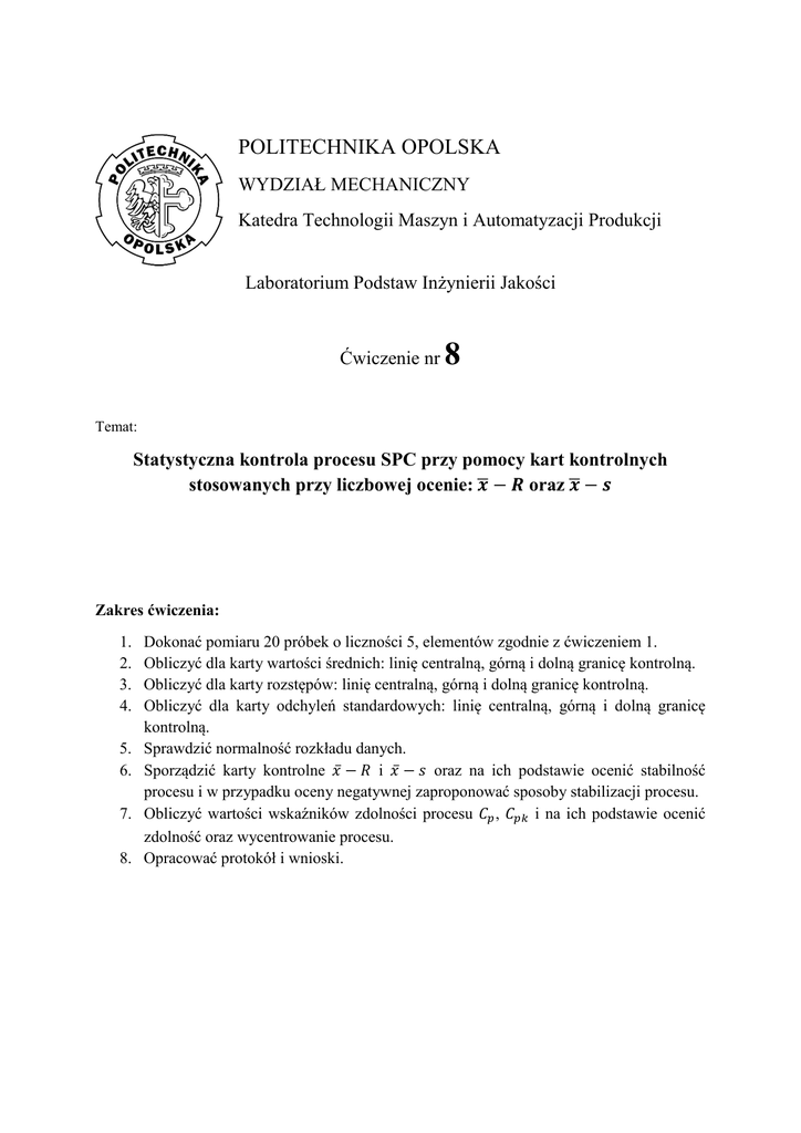 POLITECHNIKA OPOLSKA WYDZIAŁ MECHANICZNY Katedra Technologii Maszyn i Automatyzacji Produkcji Laboratorium Podstaw Inżynierii Jakości Ćwiczenie nr 8 Temat: Statystyczna kontrola procesu SPC przy pomocy kart kontrolnych stosowanych przy liczbowej ocenie: oraz Zakres ćwiczenia: 1. 2. 3. 4. 5. 6. 7. 8. Dokonać pomiaru 20 próbek o liczności 5, elementów zgodnie z ćwiczeniem 1. Obliczyć dla karty wartości średnich: linię centralną, górną i dolną granicę kontrolną. Obliczyć dla karty rozstępów: linię centralną, górną i dolną granicę kontrolną. Obliczyć dla karty odchyleń standardowych: linię centralną, górną i dolną granicę kontrolną. Sprawdzić normalność rozkładu danych. Sporządzić karty kontrolne ̅ i ̅ oraz na ich podstawie ocenić stabilność procesu i w przypadku oceny negatywnej zaproponować sposoby stabilizacji procesu. Obliczyć wartości wskaźników zdolności procesu , i na ich podstawie ocenić zdolność oraz wycentrowanie procesu. Opracować protokół i wnioski. STATYSTYCZNA KONTROLA PROCESU Statystyczne sterowanie procesem (ang. SPC - Statistical Process Control) – jest to bieżąca kontrola procesu, służąca do wykrywania jego ewentualnych rozregulowań i w konsekwencji służąca stałej poprawie jego jakości [1]. W zakresie SPC bada się z jaką naturalną zmiennością, czyli z jakim rozproszeniem wyników pomiaru wykonywany jest proces produkcyjny i w jakim stopniu jest on „zdolny” do spełnienia wymagań określonych specyfikacjami. SPC to technika prowadzenia procesów lub badania zdolności maszyn i procesów metodami statystycznymi [2]. Najczęściej stosowanymi narzędziami do analizy stabilności procesu są wskaźniki zdolności oraz karty kontrolne. W SPC za podstawę oceny przebiegu procesu przyjmuje się wartości będące wynikiem uśrednienia w próbce kilkuelementowej (zazwyczaj 4 ÷ 5 sztuk) pobranej w ustalonych odstępach czasu. SPC pozwala zatem wydzielić z ogólnego błędu obróbki błędy przypadkowe i systematyczne oraz odpowiednio wysterować proces tak, aby zmienność danej cechy jakości sprowadzona była jak najbliżej naturalnej zmienności procesu obróbki. Karta kontrolna (regulacyjna), zwana także kartą statystycznego sterowania procesem lub kartą Shewharta jest narzędziem SPC, która pozwala skutecznie nadzorować proces, obserwować na niej trendy zmian, prognozować dalsze zmiany i odpowiednio wcześnie podjąć działania korygujące, nie dopuszczające do wyjścia kontrolowanego parametru poza dopuszczalne granice [3]. Twórcą koncepcji kart kontrolnych jest Walter A. Shewhart, który zastosował je w 1924 r. w Bell Laboratories [4]. Z kart kontrolnych korzysta się, aby potwierdzić wiarygodność hipotez dotyczących stabilności badanego procesu stawianych na podstawie wykorzystania innych narzędzi, np. w przypadku badania zdolności jakościowej procesu oraz pozyskania danych (parametry statystyczne) niezbędnych dla dalszych analiz. Głównymi ocenianymi charakterystykami procesu jest wyśrodkowanie (miary położenia) i rozrzut (rozproszenie) wartości cech wyrobu. Ocena tych cech wymaga analizy przebiegów czasowych wskaźników statystycznych (np. średnie, mediany, odchylenia standardowe, rozstępy) i porównania ich z liniami granicznymi lub liniami kontrolnymi Podstawowym dokumentem normatywnym opisującym zasady projektowania oraz wykorzystania kart kontrolnych jest norma PN-ISO 8258+AC1 „Karty kontrolne Shewharta”. Podstawą jakościowej oceny produktu (dla celów kontroli lub innej analizy) jest pojedynczy pomiar analizowanego parametru. W metodach statystycznych pomiar ten powinien być powtórzony na innych wyrobach, tego samego asortymentu, w jednej lub kilku analizowanych seriach wyrobu. Najczęściej stosowane karty kontrolne podzielić można na trzy podstawowe rodzaje [3]: • Dla cech mierzalnych (liczbowa ocena właściwości): o karty ̅ (średniej i rozstępu), o ̅ (średniej i odchylenia standardowego), o mediany i rozstępu ( ), o wartości indywidualnych . • Dla cech ocenianych alternatywnie, do których zaliczają się m.in.: o karty frakcji jednostek niezgodnych (wadliwości) , o liczby jednostek niezgodnych - oparte na rozkładzie dwumianowym, 2 • o karty (oparte na rozkładzie Poissona) służące śledzeniu liczby wad (niezgodności), do monitorowania liczby wad (niezgodności) przypadających na o karty określoną jednostkę (np. m2 powierzchni, sztukę wyrobu, metr bieżący). Karty sum kumulacyjnych dla cech mierzalnych i niemierzalnych. Karty kontrolne przy ocenie liczbowej wykorzystywane są w przypadku, gdy mamy do dyspozycji konkretne liczbowe wyniki pochodzące z pomiarów interesujących nas właściwości produkowanych wyrobów. Podstawowym warunkiem, jaki pozostaje do spełniania przy stosowaniu kart kontrolnych, jest to, że zebrane dane muszą mieć rozkład normalny [4, 5]. Przed przystąpieniem do projektowania i wykreślenia wybranej karty kontrolnej konieczne jest sprawdzenie tego założenia. Przy użyciu karty kontrolnej analizuje się dwie wartości: wartość średnią ̅ oraz rozstęp wyników w poszczególnych próbkach. Jest to jedna z najczęściej stosowanych kart kontrolnych [5]. Na karcie kontrolnej wykreśla się dwa wykresy. Pierwszy z nich prezentuje wartości średnie w poszczególnych próbkach pobranych do badania. Położenie każdego wykreślonego punktu wynika z obliczonej wartości średniej w próbce. Drugi wykres pokazuje rozproszenie w poszczególnych próbkach, wyrażone obliczoną wartością rozstępu. Karta ta uwzględnia więc obie istotne miary położenia rozkładu normalnego danych: miarę położenia i zmienności. Zależności do wyznaczania linii centralnej (CL) i linii kontrolnych (UCL, LCL) zestawione są w tabeli 1. Tor karty kontrolnej ̅ • dla ̅ ̅ k : górna granica kontrolna $ = ̿+ # dolna granica kontrolna = ̿ # linia centralna = ̿= ∑ "̅ Do wykreślenia wykresu wart