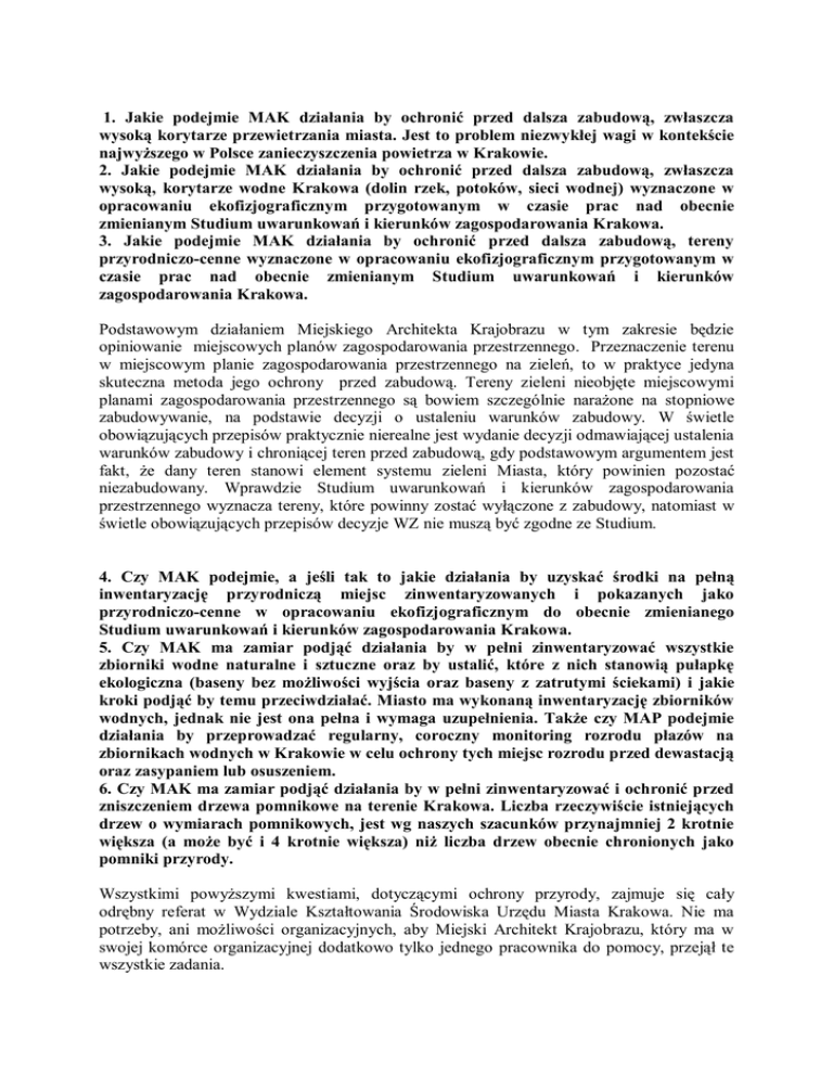 1. Jakie podejmie MAK działania by ochronić przed dalsza zabudową, zwłaszcza wysoką korytarze przewietrzania miasta. Jest to problem niezwykłej wagi w kontekście najwyższego w Polsce zanieczyszczenia powietrza w Krakowie. 2. Jakie podejmie MAK działania by ochronić przed dalsza zabudową, zwłaszcza wysoką, korytarze wodne Krakowa (dolin rzek, potoków, sieci wodnej) wyznaczone w opracowaniu ekofizjograficznym przygotowanym w czasie prac nad obecnie zmienianym Studium uwarunkowań i kierunków zagospodarowania Krakowa. 3. Jakie podejmie MAK działania by ochronić przed dalsza zabudową, tereny przyrodniczo-cenne wyznaczone w opracowaniu ekofizjograficznym przygotowanym w czasie prac nad obecnie zmienianym Studium uwarunkowań i kierunków zagospodarowania Krakowa. Podstawowym działaniem Miejskiego Architekta Krajobrazu w tym zakresie będzie opiniowanie miejscowych planów zagospodarowania przestrzennego. Przeznaczenie terenu w miejscowym planie zagospodarowania przestrzennego na zieleń, to w praktyce jedyna skuteczna metoda jego ochrony przed zabudową. Tereny zieleni nieobjęte miejscowymi planami zagospodarowania przestrzennego są bowiem szczególnie narażone na stopniowe zabudowywanie, na podstawie decyzji o ustaleniu warunków zabudowy. W świetle obowiązujących przepisów praktycznie nierealne jest wydanie decyzji odmawiającej ustalenia warunków zabudowy i chroniącej teren przed zabudową, gdy podstawowym argumentem jest fakt, że dany teren stanowi element systemu zieleni Miasta, który powinien pozostać niezabudowany. Wprawdzie Studium uwarunkowań i kierunków zagospodarowania przestrzennego wyznacza tereny, które powinny zostać wyłączone z zabudowy, natomiast w świetle obowiązujących przepisów decyzje WZ nie muszą być zgodne ze Studium. 4. Czy MAK podejmie, a jeśli tak to jakie działania by uzyskać środki na pełną inwentaryzację przyrodniczą miejsc zinwentaryzowanych i pokazanych jako przyrodniczo-cenne w opracowaniu ekofizjograficznym do obecnie zmienianego Studium uwarunkowań i kierunków zagospodarowania Krakowa. 5. Czy MAK ma zamiar podjąć działania by w pełni zinwentaryzować wszystkie zbiorniki wodne naturalne i sztuczne oraz by ustalić, które z nich stanowią pułapkę ekologiczna (baseny bez możliwości wyjścia oraz baseny z zatrutymi ściekami) i jakie kroki podjąć by temu przeciwdziałać. Miasto ma wykonaną inwentaryzację zbiorników wodnych, jednak nie jest ona pełna i wymaga uzupełnienia. Także czy MAP podejmie działania by przeprowadzać regularny, coroczny monitoring rozrodu płazów na zbiornikach wodnych w Krakowie w celu ochrony tych miejsc rozrodu przed dewastacją oraz zasypaniem lub osuszeniem. 6. Czy MAK ma zamiar podjąć działania by w pełni zinwentaryzować i ochronić przed zniszczeniem drzewa pomnikowe na terenie Krakowa. Liczba rzeczywiście istniejących drzew o wymiarach pomnikowych, jest wg naszych szacunków przynajmniej 2 krotnie większa (a może być i 4 krotnie większa) niż liczba drzew obecnie chronionych jako pomniki przyrody. Wszystkimi powyższymi kwestiami, dotyczącymi ochrony przyrody, zajmuje się cały odrębny referat w Wydziale Kształtowania Środowiska Urzędu Miasta Krakowa. Nie ma potrzeby, ani możliwości organizacyjnych, aby Miejski Architekt Krajobrazu, który ma w swojej komórce organizacyjnej dodatkowo tylko jednego pracownika do pomocy, przejął te wszystkie zadania. Natomiast kwestii związanych z zielenią i krajobrazem Miasta nie można rozpatrywać w oderwaniu od ochrony wartości przyrodniczych, dlatego Miejski Architekt Krajobrazu ściśle współpracuje z referatem zajmującym się ochroną przyrody. 7. Czy MAK podejmie działania w obronie trenów zielonych, które w zmienianym Studium planiści chcą przeznaczyć pod zabudowę. Dotyczy to także działek miejskich. Problem jest szczególnie wyraźnie widoczny w materiałach Studium, gdzie dla wyróżnionych jednostek urbanistycznych podano w bilansie terenu procent terenów zielnych w każdej jednostce urbanistycznej. Szereg jednostek urbanistycznych ma niski procent terenów zielonych, a pomimo to przeznacza się w nich dalsze tereny zielone pod zabudowę. Ten sposób traktowania terenów niezabudowanych trzeba stanowczo powstrzymać, dla dobra mieszkańców Krakowa. Wniosłam liczne uwagi do projektu zmiany Studium uwarunkowań i kierunków zagospodarowania przestrzennego Miasta Krakowa, m.in.: - zaproponowałam uzupełnienie wytycznych dotyczących centrum miasta i śródmieścia o zdanie: Planowane inwestycje nie powinny się również odbywać kosztem istniejącej zieleni, która w Centrum Miasta ma szczególne znaczenie, z uwagi na niewielką ilość publicznie dostępnych terenów zieleni i zadrzewień. - projekt zmiany Studium opisuje, na czym ma polegać ochrona systemu przyrodniczego Miasta przed naporem inwestycyjnym, zaproponowałam, aby odbywało się to również z uwzględnieniem istniejących i odtwarzanych korytarzy ekologicznych oraz terenów stanowiących zielony łącznik pomiędzy rozproszonymi terenami zieleni, integrujący strukturę zieleni w ciągły system - zaproponowałam, aby do kryteriów zakwalifikowania obszarów Miasta do obszarów priorytetowych, dla których Miasto zamierza sporządzić plany miejscowe w pierwszej kolejności, dodać: konieczność zabezpieczenia gruntów, które powinny zostać włączone w strukturę zieleni miejskiej w celu zintegrowania jej w ciągły system, w tym strefy zagospodarowania i strefy ochrony parków rzecznych - Nie zgodziłam się z zasadą opisaną w projekcie zmiany Studium, dotyczącą nieustalania wskaźnika powierzchni biologicznie czynnej dla terenu cmentarzy (ZC). Moim zdaniem należy ustalić minimalny wskaźnik powierzchni biologicznie czynnej dla terenu cmentarzy (ZC) w poszczególnych strukturalnych jednostkach urbanistycznych z uwagi na fakt, że tereny te są ważnym elementem systemu zieleni Miasta. - W projekcie zmia