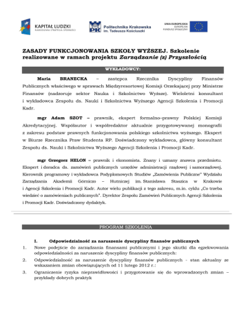 ZASADY FUNKCJONOWANIA SZKOŁY WYŻSZEJ. Szkolenie realizowane w ramach projektu Zarządzanie (z) Przyszłością WYKŁADOWCY: Maria BRANECKA – zastępca Rzecznika Dyscypliny Finansów Publicznych właściwego w sprawach Międzyresortowej Komisji Orzekającej przy Ministrze Finansów (nadzoruje sektor Nauka i Szkolnictwo Wyższe). Wieloletni konsultant i wykładowca Zespołu ds. Nauki i Szkolnictwa Wyższego Agencji Szkolenia i Promocji Kadr. mgr Adam SZOT – prawnik, ekspert formalno–prawny Polskiej Komisji Akredytacyjnej. Współautor i współredaktor aktualnie przygotowywanej monografii z zakresu podstaw prawnych funkcjonowania polskiego szkolnictwa wyższego. Ekspert w Biurze Rzecznika Praw Studenta RP. Doświadczony wykładowca, główny konsultant Zespołu ds. Nauki i Szkolnictwa Wyższego Agencji Szkolenia i Promocji Kadr. mgr Grzegorz HELON – prawnik i ekonomista. Znany i uznany znawca przedmiotu. Ekspert i doradca ds. zamówień publicznych urzędów administracji rządowej i samorządowej. Kierownik programowy i wykładowca Podyplomowych Studiów „Zamówienia Publiczne” Wydziału Zarządzania Akademii Górniczo – Hutniczej im. Stanisława Staszica w Krakowie i Agencji Szkolenia i Promocji Kadr. Autor wielu publikacji z tego zakresu, m.in. cyklu „Co trzeba wiedzieć o zamówieniach publicznych”. Dyrektor Zespołu Zamówień Publicznych Agencji Szkolenia i Promocji Kadr. Doświadczony dydaktyk. PROGRAM SZKOLENIA I. Odpowiedzialność za naruszenie dyscypliny finansów publicznych 1. Nowe podejście do zarządzania finansami publicznymi i jego skutki dla egzekwowania odpowiedzialności za naruszenie dyscypliny finansów publicznych: 2. Odpowiedzialność za naruszenie dyscypliny finansów publicznych - stan aktualny ze wskazaniem zmian obowiązujących od 11 lutego 2012 r.: 3. Ograniczenie ryzyka nieprawidłowości i przygotowanie się do wprowadzonych zmian – przykłady dobrych praktyk II. Zasady funkcjonowania szkoły wyższej 1. Proces kształcenia a. tworzenie kierunku studiów b. ogólnoakademicki a praktyczny profil kształcenia c. efekty kształcenia a program studiów d. joint programs e. studia doktoranckie f. studia podyplomowe 2. Finansowanie działalności uczelni a. przychody uczelni b. dotacje z budżetu państwa na działalności uczelni i ich przeznaczenie c. dotacja projakościowa d. środki finansowe na naukę przyznawane przez Ministra e. finansowanie badań przez NCN i NCBiR 3. Sprawy pracownicze a. Stosunek pracy z nauczycielem akademickim i. nawiązanie (mianowanie i umowa o pracę, tryb konkursowy, ograniczenia zatrudnienia, okresy zatrudnienia) ii. rozwiązanie iii. wygaśniecie b. minimum kadrowe (warunki zaliczenia do minimum kadrowego) c. podejmowanie dodatkowego zatrudnienia d. określenie obowiązków nauczyciela akademickiego e. okresowa ocena nauczycieli akademickich 4. Studenci i doktoranci a. przyjęcie na studia i studia doktoranckie b. opłaty za usługi edukacyjne c. zasady pobierania opłat za drugi i kolejny kierunek studiów stacjonarnych d. opłaty za dodatkowe punkty ECTS e. decyzje w indywidualnych sprawach studentów i doktorantów f. pomoc materialna dla studentów i doktorantów – zasady i przebieg postępowania g. dodatkowe wsparcie finansowe doktorantów h. ukończenie studiów i studiów doktoranckich III. 1. Prawo zamówień publicznych Prawo Zamówień Publicznych – podstawowe pojęcia i definicje, nowe pojęcie robót budowlanych. 2. Zakres stosowania ustawy Prawo Zamówień Publicznych. 3. Zasady udzielania zamówień publicznych. Progi kwotowe. 4. Warunki podmiotowe i przedmiotowe. Możliwość badania i oceny rzetelności i efektywności wykonawców w kontekście całokształtu wcześniej realizowanych zamówień. 5. Zmiany w procedurach udzielania zamówień publicznych. Dialog techniczny. INFORMACJE ORGANIZACYJNE TERMIN SZKOLENIA: 13-14 marca 2013 roku MIEJSCE SZKOLENIA: Grand Hotel Stamary **** w Zakopanem ¯ 1 nocleg w pokojach jednoosobowych 13/14.03.2013 r. ¯ 13 marca 2013 r. – obiad i kolacja, ¯ 14 marca 2013 r. – śniadanie i obiad. ¯ 13 marzec 2013r. 9.30 wyjazd PK 13.00 przyjazd 13.10- rozpoczęcie szkolenia Po kolacji spotkanie z JM Rektorem 14 marzec 2013r. 7.30-8.00 śniadanie 8.30- rozpoczęcie szkolenia Powrót ok. godz. 15.00 Organizator szkolenia: AGENCJA SZKOLENIA I PROMOCJI KADR CENTRUM SZKOLENIA ZESPÓŁ DS. NAUKI I SZKOLNICTWA WYŻSZEGO ul. Nowy Świat 52/7, 00-363 Warszawa tel./fax: /0-22/ 826-97-97, 826-73-44, 828-24-43 e-mail: [email protected], [email protected]: www.asipk.com.pl CZŁOWIEK - NAJLEPSZA INWESTYCJA Projekt pn. „ZARZĄDZANIE (z) PRZYSZŁOŚCIĄ” nr POKL.04.01.01-00-034/11 współfinansowany ze środków Unii Europejskiej w ramach Europejskiego Funduszu Społecznego