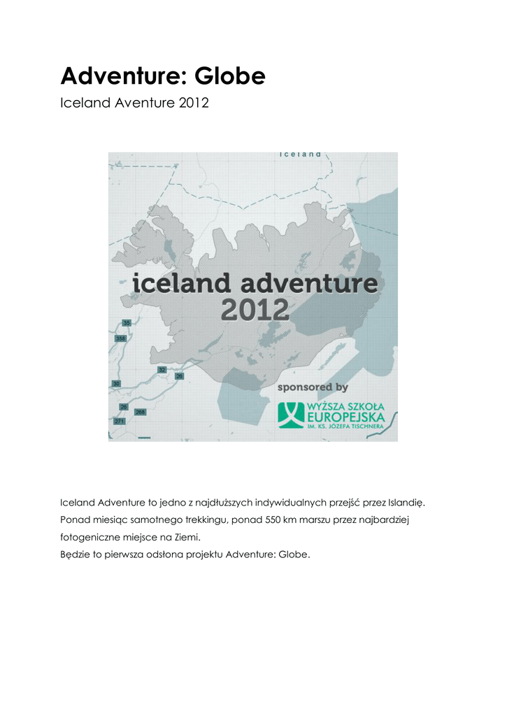 Adventure: Globe Iceland Aventure 2012 Iceland Adventure to jedno z najdłuższych indywidualnych przejść przez Islandię. Ponad miesiąc samotnego trekkingu, ponad 550 km marszu przez najbardziej fotogeniczne miejsce na Ziemi. Będzie to pierwsza odsłona projektu Adventure: Globe. O Iceland Adventure 2012 Co planuję? Ponad miesięczny indywidualny trekking przez Islandię. Kiedy? Na Islandii wyląduję 27. lipca i zostanę do 30. sierpnia. Którędy? Trasa połączy dwa brzegi wyspy. Miejsce startu to południowo-zachodni brzeg latarnia Reykjanesta. Punkt docelowy znajduje się ponad 550km dalej na północnym-wschodzie, przy latarni na półwyspie Langanes. Będzie to jedno z najdłuższych indywidualnych przejść przez Islandię oraz pierwsze tą trasą. Dlaczego właśnie Islandia? Bo to taka nasza europejska Nowa Zelandia. Odwiedzenie obu miejsc od zawsze jest moim marzeniem. Zaczynam od Islandii. Ta wyspa i jej mieszkańcy po prostu przyciągają. Wulkany kreatywności, gejzery pozytywnej energii - w tych metaforach jest mnóstwo prawdy :) A jednocześnie sama wyspa i jej niesamowite krajobrazy. Soczysta zieleń wzgórz i nieskończona czerń wulkanicznych pustyń. Błękit lodowców i biel spiętrzonych rzek niesamowite połączenia których próżno szukać gdziekolwiek indziej na świecie. To właśnie dlatego uważam, że to jedno z najbardziej fotogenicznych miejsc Globu :] Dlaczego trekking? Bo na rowerze nie jeżdżę aż tak dobrze (jeszcze). Bo nie da się biegać z takim dużym plecakiem (a szkoda). Bo z samochodu niczego się nie da na prawdę zobaczyć. Bo uwielbiam trekking ;] Więcej o Iceland Adventure 2012 dowiesz się TUTAJ O Adventure: Globe Adventure: Globe to projekt podróżniczy oparty na wyzwaniach. Każdy z nas ich potrzebuje. Wyzwanie zawsze jest przygodą a to właśnie dzięki nim nasze życie nie jest nudne. Niezależnie czy wyzwaniem będzie ukończenie maratonu, wejście na szczyt Kilimandżaro, opanowanie mandaryńskiego, awans w pracy czy zrobienie idealnej kanapki ;) Wyzwaniem może być nawet najbardziej prozaiczna czynność wszystko zależy od tego jak do niej podejdziemy. Jak to działa? Każda wyprawa będzie przygodą, wyzwaniem. Jeśli trekking to długi, jeśli rower to pod górkę, jeśli jazda konna to przez Mongolię ;) Po co? “Jeśli nie podoba Ci się to gdzie jesteś - rusz się. Nie jesteś drzewem.” - Nieznany Adventure: Globe jest po to żeby wyrwać mnie i innych z życiowej rutyny. Żeby przypomnieć, że gdy wyznaczamy sobie w życiu ambitne cele, wszystko w końcu zaczyna nabierać prawdziwego sensu. Na pozór nie jest łatwiej ale w ostatecznym rozliczeniu zyskujemy dużo dużo więcej :) Dla kogo? Dla siebie - bo zawsze chciałem być poszukiwaczem przygód ;) Ale i dla wszystkich innych bo wyzwaniem może być zarówno wejście na Mont Blanc jak i uśmiech do kierowcy autobusu. Przebiegnięcie maratonu ale i wstanie z łóżka. Jeśli masz coś co Ci się nie podoba w Twoim życiu - zmień to i nie mów, że “to nie takie proste” :] Więcej o Adventure: Globe dowiesz się TUTAJ Kim jestem? Kuba Sarata Pochodzę ze Szczawnicy a aktualnie mieszkam i pracuję w Krakowie. Jestem fotografem, góralem, biegaczem, podróżnikiem i poszukiwaczem przygód. Od ponad roku razem z Adamem Pliszyło tworzę PhotShot - Fotografia . Od lat odwiedzam najróżniejsze miejsca na świecie. Od Hiszpanii przez Norwegię i Bałkany aż po Gruzję i Armenię. Więcej na mój temat przeczytasz TUTAJ Mój Facebook: www.facebook.com/kuba.sarata Zapraszam również na: www.about.me/kubasarata Iceland Adventure 2012 wspierają: Partnerzy strategiczni: Wyższa Szkoła Europejska Partnerem projektu jest Województwo Małopolskie Uzdrowisko Szczawnica Owls Department LYO FOOD Reporter strap Patroni: Explorers Festival Łódź PhotShot KULTURAtka.pl Travel Channel Globtroter.pl wPieniny.pl Szczawniczanin.pl Klub podróżników Atlantyda Nurkujący podróżnicy Manko Klub Podróżników Śródziemie Mountain Touch Challende Wierchy PTTK Kontakt Kuba Sarata tel: +48 501 105 689 e-mail: [email protected] Napisz sms na Islandię: +xx xxx xxx xxx Kontakt organizacyjny: Jasiek Sarata Tel: e-mail: [email protected] Blog Iceland Adventure 2012 – www.icelandadventure.tumblr.com/ Fanpage Adventure: Globe – www.facebook.com/AdventureGlobe Strona Adventure: Globe – http://www.AdventureGlobe.pl (w przygotowaniu)