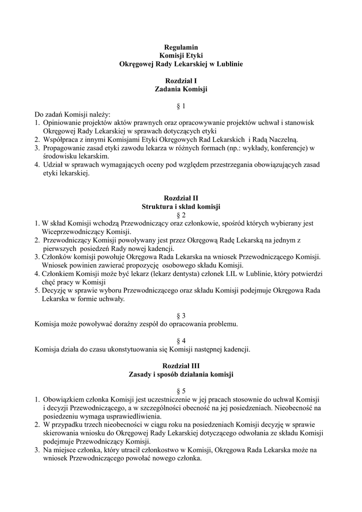 Regulamin Komisji Etyki Okręgowej Rady Lekarskiej w Lublinie Rozdział I Zadania Komisji §1 Do zadań Komisji należy: 1. Opiniowanie projektów aktów prawnych oraz opracowywanie projektów uchwał i stanowisk Okręgowej Rady Lekarskiej w sprawach dotyczących etyki 2. Współpraca z innymi Komisjami Etyki Okręgowych Rad Lekarskich i Radą Naczelną. 3. Propagowanie zasad etyki zawodu lekarza w różnych formach (np.: wykłady, konferencje) w środowisku lekarskim. 4. Udział w sprawach wymagających oceny pod względem przestrzegania obowiązujących zasad etyki lekarskiej. Rozdział II Struktura i skład komisji §2 1. W skład Komisji wchodzą Przewodniczący oraz członkowie, spośród których wybierany jest Wiceprzewodniczący Komisji. 2. Przewodniczący Komisji powoływany jest przez Okręgową Radę Lekarską na jednym z pierwszych posiedzeń Rady nowej kadencji. 3. Członków komisji powołuje Okręgowa Rada Lekarska na wniosek Przewodniczącego Komisji. Wniosek powinien zawierać propozycję osobowego składu Komisji. 4. Członkiem Komisji może być lekarz (lekarz dentysta) członek LIL w Lublinie, który potwierdzi chęć pracy w Komisji 5. Decyzję w sprawie wyboru Przewodniczącego oraz składu Komisji podejmuje Okręgowa Rada Lekarska w formie uchwały. §3 Komisja może powoływać doraźny zespół do opracowania problemu. §4 Komisja działa do czasu ukonstytuowania się Komisji następnej kadencji. Rozdział III Zasady i sposób działania komisji §5 1. Obowiązkiem członka Komisji jest uczestniczenie w jej pracach stosownie do uchwał Komisji i decyzji Przewodniczącego, a w szczególności obecność na jej posiedzeniach. Nieobecność na posiedzeniu wymaga usprawiedliwienia. 2. W przypadku trzech nieobecności w ciągu roku na posiedzeniach Komisji decyzję w sprawie skierowania wniosku do Okręgowej Rady Lekarskiej dotyczącego odwołania ze składu Komisji podejmuje Przewodniczący Komisji. 3. Na miejsce członka, który utracił członkostwo w Komisji, Okręgowa Rada Lekarska może na wniosek Przewodniczącego powołać nowego członka. §6 1. Zebrania komisji odbywają się w miarę potrzeby, w terminach wyznaczonych przez Przewodniczącego komisji. 2. Działalność Komisji jest jawna dla członków samorządu. 3. W posiedzeniach komisji mogą brać udział z głosem doradczym osoby zaproszone przez Przewodniczącego komisji oraz członkowie Okręgowej Rady Lekarskiej. 4. Komisja może uchwalić tajność posiedzenia. 5. Z posiedzeń Komisji oraz zespołu sporządzany jest protokół, który podpisuje osoba przewodnicząca posiedzeniu. §7 1. Komisja podejmuje decyzje w drodze głosowania zwykła większością głosów. W razie równości głosów decyduje głos Przewodniczącego. 2. W sprawach bieżących decyzje podejmuje Przewodniczący Komisji. §8 Do występowania w imieniu komisji upoważniony jest Przewodniczący Komisji lub wyznaczony przez niego zastępca. §9 Przewodniczącemu komisji przysługuje prawo wnioskowania do Przewodniczącego Okręgowej Rady Lekarskiej o przyznanie w ramach uchwalonego przez Okręgowy Zjazd Lekarzy rocznego budżetu komisji odpowiednich środków pieniężnych dla celów związanych z bieżącą działalnością komisji, w szczególności przeznaczonych na rozliczenie delegacji. § 10 W razie nieobecności Przewodniczącego Komisji jego funkcje pełni wyznaczonych przez niego zastępca. § 11 Komisja współpracuje z innymi komisjami problemowymi. § 12 Członkowie Komisji są dostępni dla zainteresowanych w dniach i godzinach uzgodnionych z Przewodniczącym Komisji i Dyrektorem Biura LIL. § 13 Obsługę administracyjną Komisji zapewnia biuro Okręgowej Izby Lekarskiej.