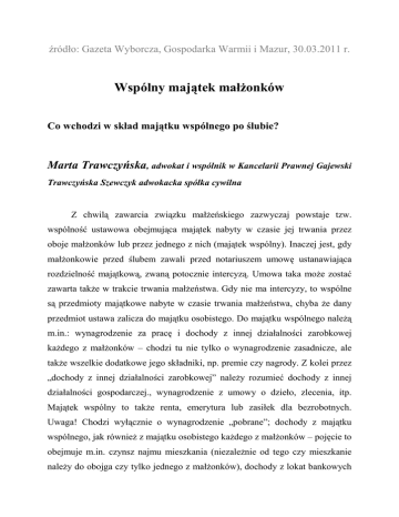 źródło: Gazeta Wyborcza, Gospodarka Warmii i Mazur, 30.03.2011 r. Wspólny majątek małżonków Co wchodzi w skład majątku wspólnego po ślubie? Marta Trawczyńska, adwokat i wspólnik w Kancelarii Prawnej Gajewski Trawczyńska Szewczyk adwokacka spółka cywilna Z chwilą zawarcia związku małżeńskiego zazwyczaj powstaje tzw. wspólność ustawowa obejmująca majątek nabyty w czasie jej trwania przez oboje małżonków lub przez jednego z nich (majątek wspólny). Inaczej jest, gdy małżonkowie przed ślubem zawali przed notariuszem umowę ustanawiająca rozdzielność majątkową, zwaną potocznie intercyzą. Umowa taka może zostać zawarta także w trakcie trwania małżeństwa. Gdy nie ma intercyzy, to wspólne są przedmioty majątkowe nabyte w czasie trwania małżeństwa, chyba że dany przedmiot ustawa zalicza do majątku osobistego. Do majątku wspólnego należą m.in.: wynagrodzenie za pracę i dochody z innej działalności zarobkowej każdego z małżonków – chodzi tu nie tylko o wynagrodzenie zasadnicze, ale także wszelkie dodatkowe jego składniki, np. premie czy nagrody. Z kolei przez „dochody z innej działalności zarobkowej” należy rozumieć dochody z innej działalności gospodarczej., wynagrodzenie z umowy o dzieło, zlecenia, itp. Majątek wspólny to także renta, emerytura lub zasiłek dla bezrobotnych. Uwaga! Chodzi wyłącznie o wynagrodzenie „pobrane”; dochody z majątku wspólnego, jak również z majątku osobistego każdego z małżonków – pojęcie to obejmuje m.in. czynsz najmu mieszkania (niezależnie od tego czy mieszkanie należy do obojga czy tylko jednego z małżonków), dochody z lokat bankowych (nawet jeśli przedmiotem lokaty są środki stanowiące majątek osobisty jednego z małżonków, np. oszczędności zgromadzone przez niego jeszcze przed ślubem; środki zgromadzone na rachunku otwartego lub pracowniczego funduszu emerytalnego każdego z małżonków. To jedynie przykładowe wyliczenie, bo w skład majątku wspólnego wchodzić mogą także inne przedmioty i prawa, m.in. biżuteria żony, pod warunkiem jednak, że stanowi lokatę kapitału ( w przeciwnym razie wchodzi do majątku osobistego) czy wygrane z loterii i innych gier losowych (odmienna zasada dotyczy wygranych z gier, wymagających szczególnych umiejętności lub wiedzy, np. „1 z 10” – te wejdą do majątku wygrywającego małżonka”. Ponadto do majątku wspólnego wchodzą przedmioty zwykłego urządzenia domowego służące do użytku obojgu małżonków, np. pralka, telewizor, zestaw wypoczynkowy, chyba, że spadkodawca lub darczyńca zaznaczył, że mają one stanowić własność wyłącznie jednego z małżonków.