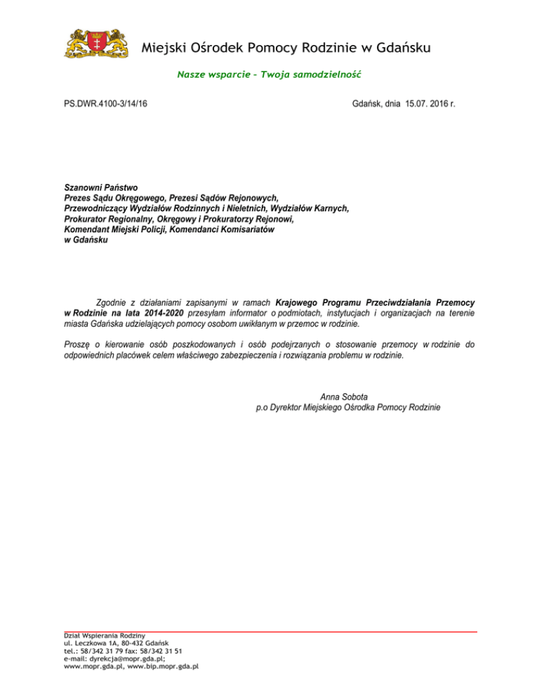 Miejski Ośrodek Pomocy Rodzinie w Gdańsku Nasze wsparcie – Twoja samodzielność PS.DWR.4100-3/14/16 Gdańsk, dnia 15.07. 2016 r. Szanowni Państwo Prezes Sądu Okręgowego, Prezesi Sądów Rejonowych, Przewodniczący Wydziałów Rodzinnych i Nieletnich, Wydziałów Karnych, Prokurator Regionalny, Okręgowy i Prokuratorzy Rejonowi, Komendant Miejski Policji, Komendanci Komisariatów w Gdańsku Zgodnie z działaniami zapisanymi w ramach Krajowego Programu Przeciwdziałania Przemocy w Rodzinie na lata 2014-2020 przesyłam informator o podmiotach, instytucjach i organizacjach na terenie miasta Gdańska udzielających pomocy osobom uwikłanym w przemoc w rodzinie. Proszę o kierowanie osób poszkodowanych i osób podejrzanych o stosowanie przemocy w rodzinie do odpowiednich placówek celem właściwego zabezpieczenia i rozwiązania problemu w rodzinie. Anna Sobota p.o Dyrektor Miejskiego Ośrodka Pomocy Rodzinie Dział Wspierania Rodziny ul. Leczkowa 1A, 80-432 Gdańsk tel.: 58/342 31 79 fax: 58/342 31 51 e-mail: [email protected]; www.mopr.gda.pl, www.bip.mopr.gda.pl Miejski Ośrodek Pomocy Rodzinie w Gdańsku Informator teleadresowy – dane podmiotów udzielających pomocy osobom uwikłanym w przemoc w rodzinie 2016 rok Ważne telefony: 1. Telefon interwencyjny Niebieska i Pomarańczowa Linia w Gdańsku: 58/ 320 44 04 (pon.-piąt.8.00-15.00) 2. Centrum Interwencji Kryzysowej z 10 miejscami hostelowymi w Gdańsku ul. Gustkowicza 13: całodobowo: 58-511-01-21, 801-011-843 3. Dyżur interwencyjny pracownika socjalnego Miejskiego Ośrodka Pomocy Rodzinie - po godz. 1530 w dni powszednie i w dni wolne od pracy: 797 909 111; 797 909 112 - dotyczący współpracy w ramach interwencji - do dyspozycji służb i instytucji miejskich . 4. Pogotowie Opiekuńcze w Gdańsku: 58/341 10 42 (placówka interwencyjna dla dzieci w sytuacjach bezpośredniego zagrożenia życia lub zdrowia dziecka, również w sytuacjach doświadczania przemocy w rodzinie). 5. Miejskie Centrum Zarządzania Kryzysowego ul. Wyspiańskiego 9A: 58/778 60 00 (01 lub 29) 6. Oficer dyżurny Komendy Miejskiej Policji w Gdańsku, ul. Nowe Ogrody 27: 58/321 62 22 lub 997 lub 112 Miejski Ośrodek Pomocy Rodzinie w Gdańsku, ul. Leczkowa 1a: 58/342 31 50 fax: 58/342 31 51; [email protected] Komórki MOPR Dział Wspierania Rodziny - stanowisko ds. interwencji kryzysowej - koordynator Procedury Niebieska Karta Dział Pieczy Rodzinnej Adres ul. Leczkowa 1a ul. Leczkowa 1a Kontakt tel. 58/ 342 31 79, 58/ 347 82 85, e-mail: [email protected] [email protected] tel. 58/ 347 82 76 (77, 72) Dział Pieczy Instytucjonalnej ul. Leczkowa 1a tel. 58/ 347 82 78 Centrum Pracy Socjalnej 1 ul. Modrzewskiego 2a tel. 58/347 86 00 fax. 58/347 86 10 e-mail: [email protected] Centrum Pracy Socjalnej 2 Pl. Ks. Gustkowicza 13 tel. 58/522 01 80 fax. 58/522 01 82 e-mail:[email protected] Centrum Pracy Socjalnej 3 ul. Dyrekcyjna 5 tel.58/691 94 18 fax. 58/691 94 11 e-mail: [email protected] Centrum Pracy Socjalnej 4 ul. Lecha 1 tel. 58/511 46 00 fax.58/511 46 01 e-mail: [email protected] Centrum Pracy Socjalnej 5 ul. Spadzista 5 tel. 58/320 53 00 (10) e-mail: [email protected] Centrum Pracy Socjalnej 6 ul. Powstańców Warszawskich 25 tel. 58/326 50 00 fax.58/326 50 49 mail: [email protected] Centrum Pracy Socjalnej 7 ul. Marynarki Polskiej 134a tel. 58/520 70 09 fax.58/520 70 06 e-mail: [email protected] Centrum Pracy Socjalnej 8 ul. Elbląska 66d tel. 58/304 58 10 fax.58/304 58 27 e-mail: [email protected] W każdym Centrum jest Koordynator Grupy Roboczej ds.realizacji Procedury Niebieska Karta - wg rejonu zamieszkania osoby doznającej przemocy w rodzinie Strona 2 z 10 Miejski Ośrodek Pomocy Rodzinie w Gdańsku Zespół Interdyscyplinarny ds. przeciwdziałania przemocy w rodzinie w Gdańsku ul. Leczkowa 1a Zespół Interdyscyplinarny ds. przeciwdziałania przemocy w rodzinie Centrum Niebieskich Kart przy MOPR i Zespole Interdyscyplinarnym ul. Leczkowa 1a (kancelaria i pok.116 a) tel. 58/ 342 31 79 e-mail:[email protected] e-mail: [email protected] [email protected] Zakres: między innymi: - przyjmowanie wszczętych Procedur „Niebieska Karta”, - powoływanie i współpraca z Grupami Roboczymi ds.rozwiązania problemu przemocy w rodzinie (spotkania interdyscyplinarne służb, instytucji i podmiotów); - współorganizacja stałych spotkań merytorycznych Koordynatorów Policji i MOPR; - inne zadania wynikające z ustawy o przeciwdziałaniu przemocy w rodzinie; tel. 58/ 304 58 28 Zakres: - konsultacje indywidualne dla mieszkańców pod kątem występowania problem przemocy w rodzinie; - konsultacje dla gdańskich specjalistów z różnych instytucji, podmiotów i placówek związanych z rozwiązaniem problemu przemocy (również w trakcie realizacji Procedury Niebieska Karta); - organizacja mini szkoleń tematycznych; ul. Leczkowa 1a pok.222 II piętro Dyżury w poniedziałki w godz.12.00-15.00 Wsparcie specjalistyczne świadczące interwencje kryzysową Placówka Adres i kontakt Centrum Interwencji Kryzysowej Pl. Ks. Gustkowicza 13 tel. 58/511 01 21 (22) Fundacji Dajemy Dzieciom Siłę w Warszawie e-mail: [email protected] Zakres wsparcia - całodobowe poradnictwo psychologiczne w sytuacjach kryzysowych i doświadczania przemocy w rodzinie; - nieodpłatne udzielanie czasowego schronienia dla osób/rodzin w kryzysie m.in. dla ofiar przemocy w hotelu (10 miejsc); - interwencyjne działania ratownicze w miejscu pobytu osoby szczególnie w kryzysie suicydalnym; - interwencyjna pomoc dzieciom w sytuacjach kryzysowych i doświadczania przemocy w rodzinie; Program Korekcyjno-edukacyjny dla osób podejrzanych lub stosujących przemoc w rodzinie „Program korekcyjnoedukacyjny dla osób stosujących przemoc domową. Zacznij od siebie” 2016 r. Towarzystwo Wspierania ul. 3 maja 6 tel. 58-302-37-44 tel. 58- 302-34-34 tel. 500-261-486 e-mail: [email protected] - konsultacje i sesje indywidualne dla osób podejrzanych lub stosujących przemoc w rodzinie; - sesje grupo