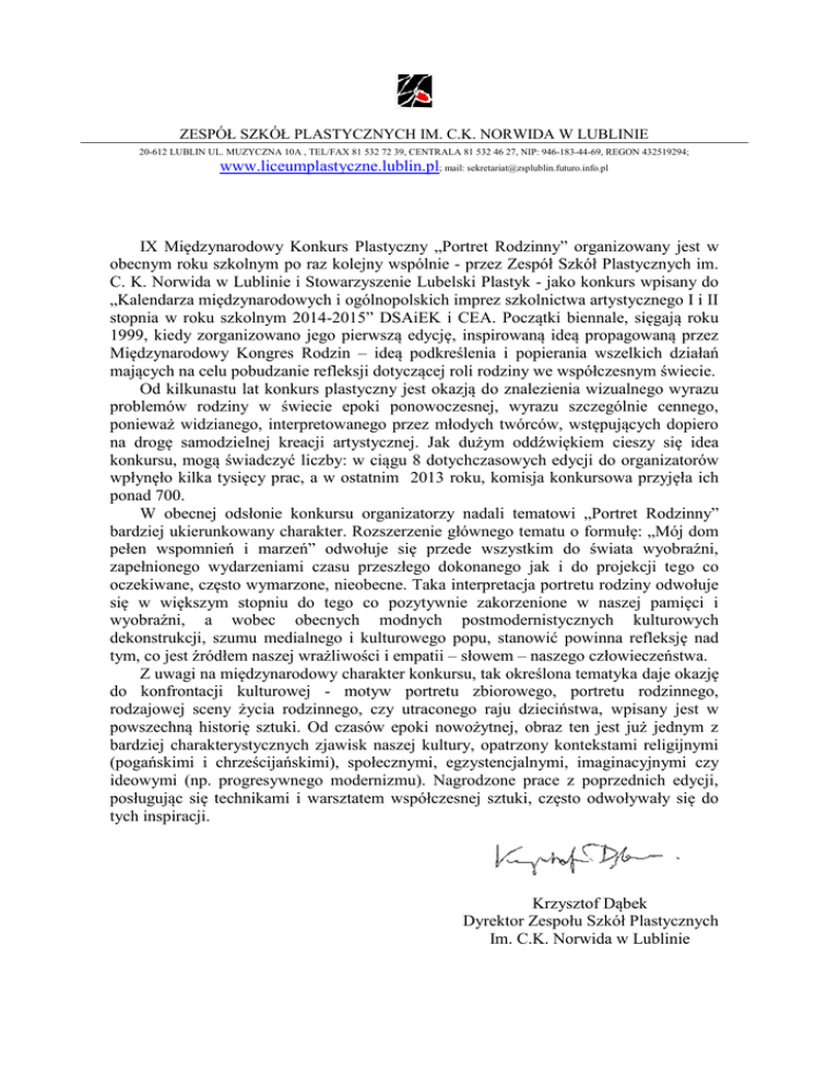 ZESPÓŁ SZKÓŁ PLASTYCZNYCH IM. C.K. NORWIDA W LUBLINIE 20-612 LUBLIN UL. MUZYCZNA 10A , TEL/FAX 81 532 72 39, CENTRALA 81 532 46 27, NIP: 946-183-44-69, REGON 432519294; www.liceumplastyczne.lublin.pl; mail: [email protected] IX Międzynarodowy Konkurs Plastyczny „Portret Rodzinny” organizowany jest w obecnym roku szkolnym po raz kolejny wspólnie - przez Zespół Szkół Plastycznych im. C. K. Norwida w Lublinie i Stowarzyszenie Lubelski Plastyk - jako konkurs wpisany do „Kalendarza międzynarodowych i ogólnopolskich imprez szkolnictwa artystycznego I i II stopnia w roku szkolnym 2014-2015” DSAiEK i CEA. Początki biennale, sięgają roku 1999, kiedy zorganizowano jego pierwszą edycję, inspirowaną ideą propagowaną przez Międzynarodowy Kongres Rodzin – ideą podkreślenia i popierania wszelkich działań mających na celu pobudzanie refleksji dotyczącej roli rodziny we współczesnym świecie. Od kilkunastu lat konkurs plastyczny jest okazją do znalezienia wizualnego wyrazu problemów rodziny w świecie epoki ponowoczesnej, wyrazu szczególnie cennego, ponieważ widzianego, interpretowanego przez młodych twórców, wstępujących dopiero na drogę samodzielnej kreacji artystycznej. Jak dużym oddźwiękiem cieszy się idea konkursu, mogą świadczyć liczby: w ciągu 8 dotychczasowych edycji do organizatorów wpłynęło kilka tysięcy prac, a w ostatnim 2013 roku, komisja konkursowa przyjęła ich ponad 700. W obecnej odsłonie konkursu organizatorzy nadali tematowi „Portret Rodzinny” bardziej ukierunkowany charakter. Rozszerzenie głównego tematu o formułę: „Mój dom pełen wspomnień i marzeń” odwołuje się przede wszystkim do świata wyobraźni, zapełnionego wydarzeniami czasu przeszłego dokonanego jak i do projekcji tego co oczekiwane, często wymarzone, nieobecne. Taka interpretacja portretu rodziny odwołuje się w większym stopniu do tego co pozytywnie zakorzenione w naszej pamięci i wyobraźni, a wobec obecnych modnych postmodernistycznych kulturowych dekonstrukcji, szumu medialnego i kulturowego popu, stanowić powinna refleksję nad tym, co jest źródłem naszej wrażliwości i empatii – słowem – naszego człowieczeństwa. Z uwagi na międzynarodowy charakter konkursu, tak określona tematyka daje okazję do konfrontacji kulturowej - motyw portretu zbiorowego, portretu rodzinnego, rodzajowej sceny życia rodzinnego, czy utraconego raju dzieciństwa, wpisany jest w powszechną historię sztuki. Od czasów epoki nowożytnej, obraz ten jest już jednym z bardziej charakterystycznych zjawisk naszej kultury, opatrzony kontekstami religijnymi (pogańskimi i chrześcijańskimi), społecznymi, egzystencjalnymi, imaginacyjnymi czy ideowymi (np. progresywnego modernizmu). Nagrodzone prace z poprzednich edycji, posługując się technikami i warsztatem współczesnej sztuki, często odwoływały się do tych inspiracji. Krzysztof Dąbek Dyrektor Zespołu Szkół Plastycznych Im. C.K. Norwida w Lublinie Cele konkursu: IX Międzynarodowy Konkurs Plastyczny „Portret Rodzinny. Mój dom pełen wspomnień i marzeń” ma na celu konfrontację różnych form plastycznej wypowiedzi, młodzieży w wieku od 15 do 20 lat. Adresowany jest przede wszystkim do utalentowanych uczniów szkół artystycznych, ale jego otwarty charakter pozwala także na indywidualne uczestnictwo. Międzynarodowy charakter konkursu daje okazję do porównania różnych kontekstów kulturowych, wymiany doświadczeń i integrację młodzieży z różnych krajów. Tematyka konkursu jest punktem wyjścia do refleksji nad wartościami, które wiążą się z rodziną rozumianą w różnych aspektach – społecznym, psychologicznym, kulturowym, odnosząc się w ten sposób bezpośrednio i pośrednio, do problemów nurtujących współczesnego człowieka. Prace konkursowe można realizować w dziedzinach odpowiadających współczesnym środkom plastycznej ekspresji: rysunku, malarstwa, grafiki warsztatowej, grafiki komputerowej, rzeźby, fotografii, tkaniny artystycznej, oraz w kategorii krótkiej formy filmu lub animacji. Daje to okazję do wybrania najwłaściwszego medium do realizacji zamierzonej idei, odpowiada kierunkom artystycznego kształcenia w szkołach plastycznych, daje okazję do oceny prac pod kątem ich wartości estetycznych i warsztatowych. Konkurs przeprowadzony jest dla uczestników w dwóch kategoriach wiekowych: 1517 lat i 18-20 lat. Regulamin IX Międzynarodowego Konkursu Plastycznego „Portret Rodzinny. Mój dom pełen wspomnień i marzeń”. Konkurs ma charakter otwarty. Uczestnikami konkursu może być młodzież w wieku 15-20 lat. Uczestnik indywidualnie może nadesłać maksymalnie 3 prace wykonane w latach 2014-15, które nie były prezentowane wcześniej podczas innych przeglądów, konkursów. Szkoła może nadesłać maksymalnie 5 prac /w każdej dziedzinie/ wykonanych w latach 2014-15, które nie były prezentowane wcześniej w innych przeglądach, konkursach. Szkoła do zestawu prac dołącza kartę zgłoszeniową / załącznik nr 1/; Uczestnicy zobowiązani są do wypełnienia i dołączenie do każdej pracy: 1) metryki zawierającej informacje o pracy /załącznik nr 2/; 2) identyfikatora uczestnika konkursu /załącznik nr 3/ w zaklejonej kopercie oznaczonej wybranym godłem; 3) oświadczenia o zgodzie na przetwarzanie danych osobowych /załącznik nr 4/. Oświadczenie należy przesłać w zaklejonej kopercie razem z identyfikatorem uczestnika konkursu. Każdy uczestnik konkursu występuje pod wybranym przez siebie godłem /np. godło – Byk/. Udział w Konkursie jest równoznaczny z wyrażeniem zgody na bezpłatne reprodukowanie prac w celach promocyjnych. Prace nagrodzone stają się własnością organizatora, pozostałe prace są odesłane na koszt uczestnika w terminie do 30 czerwca 2015 roku. Prace nadesłane na Konkurs mogą stać się własnością organizatora, o ile tak postanowią dyrektorzy zainteresowanych szkół. Organizatorz