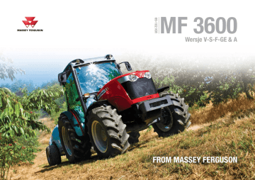 69-102 KM MF 3600 Wersje V-S-F-GE & A FROM MASSEY FERGUSON www.masseyferguson.com 02 Strona 04 Zwrotne, silne i uniwersalne Strona 06 Znakomite i zdumiewające cechy Strona 08 Silnik Mocne i dynamiczne silniki Strona 10 Przekładnia napędowa Wydajne i silne przekładnie napędowe Strona 12 Tylny TUZ i napęd WOM Wszystko co potrzebuje operator umieszczone w jednym miejscu 03 04 Ciągniki MF serii 3600 - zwrotne, silne i uniwersalne 06 Znakomite i zdumiewające cechy Strona 14 Kabina Wygodne miejsce pracy Strona 16 Komfortowe i specjalistyczne wersje bez kabiny Strona 18 Ładowacze czołowe Ładowacze czołowe zapewniające maksymalną wydajność 08 Mocne i dynamiczne silniki 10 Wydajne i silne przekładnie napędowe 12 Tylny TUZ i napęd WOM - wszystko co potrzebuje operator umieszczone w jednym miejscu 14 Kabina - wygodne miejsce pracy 16 Komfortowe i specjalistyczne wersje bez kabiny 18 Ładowacze czołowe zapewniające maksymalną wydajność 24 Zapewnij opłacalną przyszłość – program manager™ 26 Dane techniczne FROM MASSEY FERGUSON Spis treści www.masseyferguson.com 04 05 Nowe ciągniki MF 3600 posiadają elegancką linię, są zwrotne i silne. Zostały skonstruowane do wykonywania większości prac rolniczych, komunalnych i specjalistycznych. Ciągniki są wydajne, ekonomiczne a miejsce pracy operatora komfortowe i przestronne. Wersja do winnic (V) 1,00 - 1,30 m* Wersja sadownicza (S) Wersja uniwersalna (F) Wersja rolnicza (A) 1,30 - 1,50 m* 1,45 - 1,90 m 1,70 - 2,40 m* Wersja obniżona (GE) 1,15 - 1,40 m* 1,80 - 2,20 m 2,00 - 2,50 m 2,50 - 3,00 m 2,50 - 3,50 m 2,00 - 3,00 m *Typowa szerokość robocza Ciągniki Massey Ferguson 3600 cechują kompaktowe wymiary i łatwość obsługi. Ponadto, dzięki znakomitej zwrotności, mocy i stabilności są one doskonale przygotowane do następujących zastosowań: • Koszenie, przetrząsanie, zgrabianie i prasowanie • Praca z ładowaczem czołowym • Prace w niskich budynkach i miejscach trudno dostępnych • Praca z wozem paszowym przy karmieniu zwierząt • Wykonywanie oprysków • Rozsiewanie nawozów • Prace transportowe • Przygotowanie gleby • Utrzymanie właściwego stanu dróg i poboczy • Utrzymanie boisk i terenów zieleni • Prace na plantacjach szkółkarskich • Prace ogrodnicze • Prace komunalne • Prace na terenach górskich i pochyłych • Prace w sadach i winnicach • Wszelkie prace w małych gospodarstwach rolnych • Prace w gospodarstwach specjalistycznych Wersja do winnic (V) Minimalna szerokość robocza wynosząca 1,0 m sprawia, że ciągniki te stworzone są do pracy w tradycyjnych wąskich winnicach, w których międzyrzędzia mają szerokość 1,80 m - 2,20 m. Wersja sadownicza (S) Minimalna szerokość robocza od 1,3 m umożliwia pracę w sadach, w których międzyrzędzia mają szerokość 2,20 m - 2,50 m. Operator będzie czuł się komfortowo w przestronnej kabinie. Wersja uniwersalna (F) Dzięki szerokości zewnętrznej od 1,45 m do 1,90 m, ciągniki wersji F są elastyczne, kompaktowe i wielozadaniowe – idealne jeżeli szukają Państwo ciągnika do wielu różnorodnych prac. Są one również stworzone do prac ogrodniczych, w sadach owocowych, ciasnych budynkach inwentarskich oraz terenach pochyłych. Wersja rolnicza (A) Ciągniki MF 3600 w wersji A to prawdziwe maszyny wielozadaniowe. Szerokość zewnętrzna wynosi od 1,7 m do 2,4 m; dzięki czemu umożliwiają one wykonanie wielu prac, co podkreśla ich uniwersalność. Wersja obniżona (GE) Minimalna szerokość robocza od 1,15 m, sprawia, że są to idealne ciągniki do pracy w tunelach foliowych oraz na plantacjach niskich drzew owocowych takich jak: brzoskwinie, morele, kiwi czy oliwki. FROM MASSEY FERGUSON Zwrotne, silne i uniwersalne www.masseyferguson.com 06 Znakomite i zdumiewające cechy Kabina – Przede wszystkim kabina jest zdumiewająco przestronna. Ponadto jest komfortowa i zapewnia znakomitą widoczność co łącznie tworzy przyjemną atmosferę do wydajnej pracy. Kabina wersji A posiada płaską podłogę i cechuje ją łatwy dostęp do wnętrza oraz znakomity komfort i ergonomia. Nieważne czy wybiorą Państwo model bez kabiny z ramą ochronną czy model z kabiną – znakomita widoczność jest zawsze zapewniona. Ciągniki te „czują się jak u siebie w domu” podczas wykonywania tradycyjnych prac polowych czy prac komunalnych i utrzymania boisk i terenów zieleni. Silnik – Sercem każdego modelu jest mocny silnik dostarczający wysoką moc i moment obrotowy przy jednoczesnym niskim zużyciu paliwa. Zastosowanie silników z układem Common rail zapewnia łagodną pracę maszyny. Przekładnia napędowa – Mogą Państwo wybrać przekładnię, która najbardziej odpowiada Waszym wymaganiom, również przekładnię nowej generacji 24 x 12 PowerShuttle & Speedshift łączącą rewers elektrohydrauliczny z półbiegami zmienianymi pod obciążeniem. Tylny podnośnik – Dobrze znany na całym świecie 3-punktowy układ zawieszenia stworzony przez firmę Massey Ferguson może posiadać udźwig 3 000 kg (w zależności od modelu i wersji) oraz opcjonalnie układ EHR możliwy w wersjach V/S/F/GE. Układ hydrauliczny i napęd WOM - Wydajny układ hydrauliczny oraz duży wybór prędkości obrotowych wałka WOM jest dostępny, łącznie z prędkościami zależnymi od prędkości jazdy i obrotami ekonomicznymi. Dostępnych jest w sumie 5 par wyjść hydraulicznych montowanych z tyłu i z przodu ciągnika, z których 2 pary mogą być sterowane za pomocą joysticka. Pompa hydrauliczna wysokiego ciśnienia o wydatku 62 litry/min bez problemu radzi sobie z wymaganiami nowoczesnych maszyn rolniczych. Obroty ekonomiczne wałka WOM wymagają mniejszych obrotów silnika, dzięki czemu zużycie paliwa i poziom hałasu w kabinie są niższe. Przemyślany design – Wersja F ciągników MF 3600 jest węższa, idealna do wąskich i trudno dostępnych miejsc, takich jak sady czy ciasne budynki inwentarskie. Wąska, taliow