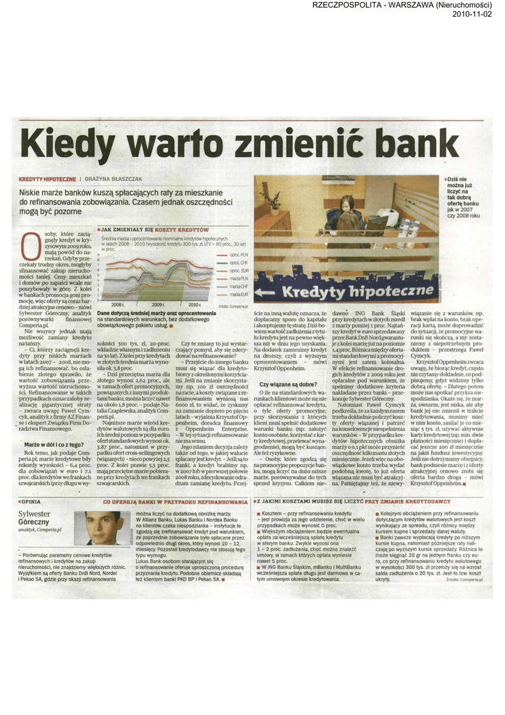 RZECZPOSPOLITA - WARSZAWA (Nieruchomo¶ci) 2010-11-02 Kiedy warto zmienić bank KREDYTY HIPOTECZNE I GRAŻYNA BŁASZCZAK • Dziś nie można już liczyć na tak dobrą ofertą banku jak w 2 0 0 7 czy 2008 roku Niskie marże banków kuszą spłacających raty za mieszkanie do refinansowania zobowiązania. Czasem jednak oszczędności mogą być pozorne O soby, które zacią gnęły kredyt w kry zysowym 2009 roku, mają powód do na rzekań. Gdyby prze czekały trudny okres, mogłyby sfinansować zakup nierucho mości taniej. Ceny mieszkań i domów po zapaści wcale nie poszybowały w górę. Z kolei w bankach promocja goni pro mocję, więc oferty są coraz bar dziej atrakcyjne cenowo - mówi Sylwester Góreczny, analityk porównywarki finansowej Comperia.pL Nie wszyscy jednak mają możliwość zamiany kredytu na tańszy. - Ci, którzy zaciągnęli kre dyty przy niskich marżach wiatach 2007- 2008, nie mo gą ich refinansować, bo osła bienie złotego sprawiło, że wartość zobowiązania prze wyższa wartość nieruchomo ści. Refinansowanie w takich •przypadkach oznaczałoby re alizację gigantycznej straty - zwraca uwagę Paweł Cym cyk, analityk z firmy AZ Finan se i ekspert Związku Firm Do radztwa Finansowego. * JAK ZMIENIAŁY SIĘ KOSZTY KREDYTÓW Średnia marzą i oprocentowanie nominalne kredytów hipotecznych w latach 2008 - 2010 (wysokość kredytu 300 tys. zt, LTV - 80 proc, 30 lat) w proc. 9 — oprocPLN oprocCHE 6 «W oproc. EUR 5 . AB mażą CHF — 20081 2009 r. Sylwester Góreczny 2010 r. marżaEUR ście na inną walutę oznacza, że dopłacamy sporo do kapitału i akceptujemy tę stratę. Dziś bo wiem wartość zadłużenia z tytu łu kredytu jest na pewno więk Czy te zmiany to już wystar sza niż w dniu jego uzyskania. czający pomysł, aby się zdecy Na dodatek zamienimy kredyt na droższy, czyli z wyższym dować na refinansowanie? - Przejście do innego banku oprocentowaniem - mówi musi się wiązać dla kredyto Krzysztof Oppenheim. biorcy z określonymi korzyścia mi. Jeśli na zmianie skorzysta Czy wiązane są dobre? my np. 100 zł oszczędności na racie, a koszty związane z re O ile na standardowych wa finansowaniem wyniosą nas runkach klientowi może się nie 6000 zł, to widać, że zyskamy opłacać refinansować kredytu, na zamianie dopiero po pięciu o tyle oferty promocyjne, latach - wyjaśnia Krzysztof Op przy skorzystaniu z których penheim, doradca finansowy klient musi spełnić dodatkowe z Oppenheim Enterprise. warunki banku (np. założyć - W tej sytuacji refinansowanie konto osobiste, korzystać z kar nie ma sensu. ty kredytowej, przelewać wyna Jego zdaniem decyzja zależy grodzenie), mogą być kuszące. także od tego, w jakiej walucie Ale też ryzykowne. spłacanyjest kredyt. - Jeśli są to - Osoby, które zgodzą się franki, a kredyt braliśmy np. na promocyjne propozycje ban w 2007 lub w pierwszej połowie ku, mogą liczyć na dużo niższe 2008 roku, zdecydowanie odra-. marże, porównywalne do tych dzam zamianę kredytu. Przej- sprzed kryzysu. Całkiem nie CO OFERUJĄ BANKI W PRZYPADKU REFINANSOWANIA można liczyć na dodatkową obniżkę marży. W Allianz Banku, Lukas Banku i Nordea Banku na klientów czeka niespodzianka - instytucje te analityk, Comperia.pl = zgodzą się zrefinansować kredyt pod warunkiem, 5 że poprzednie zobowiązanie było spłacane przez 3S odpowiednio długi okres, który wynosi 10 - 12 miesięcy. Pozostali kredytodawcy nie stosują tego typu wymogu. - Porównując parametry cenowe kredytów refinansowych i kredytów na zakup Lukas Bank osobom starającym się nieruchomości, nie znajdziemy większych różnic. o refinansowanie oferuje uproszczoną procedurę przyznania kredytu. Podobne obietnice sktadają Wyjątkiem są oferty Banku DnB Nord, Nordei też klientom banki PKO BP i Pekao SA. • i Pekao SA, gdzie przy okazji refinansowania v<$. Kredyty hipoteczne źrOdto: Compenapł Dane dotyczą średniej marzy oraz oprocentowania na standardowych warunkach, bez dodatkowego obowiązkowego pakietu usług. • sokości 300 tys. zł, 20-proc. wkładzie własnym i zadłużeniu na3olat). Z kolei przy kredytach w złotych średnia marża wyno siła ok 3,8 proc. - Dziś przeciętna marża dla złotego wynosi 2,62 proc, ale w ramach ofert promocyjnych, powiązanych z innymi produk tami banku, można liczyć nawet na około i,8 proc. - podaje Na talia Czaplewska, analityk Comperii.pL Najniższe marże wśród kre dytów walutowych są dla euro. Ich średni poziom w przypadku ofert standardowych wynosi ok Marże w dół i co z tego? 3,87 proc., natomiast w przy Rok temu, jak podaje Com- padku ofert cross-sellingowych peria.pl, marże kredytowe biły (wiązanych) - nieco powyżej 2,5 rekordy wysokości - 6,4 proc. proc. Z kolei prawie 5,5 proc. dla zobowiązań w euro i 7,1 mają przeciętne marże pobiera proc. dla kredytów we frankach ne przy kredytach we frankach szwajcarskich (przy długu w wy- szwajcarskich. • OPINIA mu maiżaPLN dawno ING Bank Śląski przy kredytach w złotych zszedł z marży poniżej 1 proc. Najtań szy kredyt w euro sprzedawany przez Bank DnB Nord gwarantu je z kolei marżę już na poziomie 1,4 proc. Różnica między oferta mi standardowymi a promocyj nymi jest zatem kolosalna. W efekcie refinansowanie dro gich kredytów z 2009 roku jest opłacalne pod warunkiem, że spełnimy dodatkowe kryteria nakładane przez banki - prze konuje Sylwester Góreczny. Natomiast Paweł Cymcyk podkreśla, że za każdym razem trzeba dokładnie policzyć kosz ty oferty wiązanej i patrzeć na konsekwencje niespełnienia warunków. - W przypadku kre dytów hipotecznych obniżka marży o 0,1 pkt może przynieść oszczędność kilkunastu złotych miesięcznie. Jeżeli więc na obo wiązkowe konto trzeba wydać podobną kwotę, to już oferta wiązana nie musi być atrakcyj na. Pamiętajmy też, że niewy- wiązanie się z warunków, np. brak wpłat na konto, brak ope racji kartą, może doprowadzić d