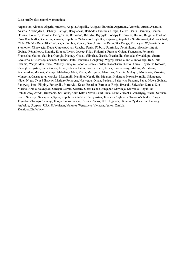 Lista krajów dostępnych w roamnigu: Afganistan, Albania, Algeria, Andorra, Angola, Anguilla, Antigua i Barbuda, Argentyna, Armenia, Aruba, Australia, Austria, Azerbejdżan, Bahamy, Bahrajn, Bangladesz, Barbados, Białoruś, Belgia, Belize, Benin, Bermudy, Bhutan, Boliwia, Bonaire, Bośnia i Hercegowina, Botswana, Brazylia, Brytyjskie Wyspy Dziewicze, Brunei, Bułgaria, Burkina Faso, Kambodża, Kamerun, Kanada, Republika Zielonego Przylądka, Kajmany, Republika Środkowoafrykańska, Chad, Chile, Chińska Republika Ludowa, Kolumbia, Kongo, Demokratyczna Republika Konga, Kostaryka, Wybrzeże Kości Słoniowej, Chorwacja, Kuba, Curacao, Cypr, Czechy, Dania, Dżibuti, Dominika, Dominikana, Ekwador, Egipt, Gwinea Równikowa, Estonia, Etiopia, Wyspy Owcze, Fidżi, Finlandia, Francja, Gujana Francuska, Polinezja Francuska, Gabon, Gambia, Georgia, Niemcy, Ghana, Gibraltar, Grecja, Grenlandia, Grenada, Gwadelupa, Guam, Gwatemala, Guernsey, Gwinea, Gujana, Haiti, Honduras, Hongkong, Węgry, Islandia, Indie, Indonezja, Iran, Irak, Irlandia, Wyspa Man, Izrael, Włochy, Jamajka, Japonia, Jersey, Jordan, Kazachstan, Kenia, Korea, Republika Kosowa, Kuwejt, Kirgistan, Laos, Łotwa, Liban, Liberia, Libia, Liechtenstein, Litwa, Luxembourg, Makau, Macedonia, Madagaskar, Malawi, Malezja, Malediwy, Mali, Malta, Martynika, Mauritius, Majotta, Meksyk, Mołdawia, Monako, Mongolia, Czarnogóra, Maroko, Mozambik, Namibia, Nepal, Sint Maarten, Holandia, Nowa Zelandia, Nikaragua, Niger, Niger, Cypr Północny, Mariany Północne, Norwegia, Oman, Pakistan, Palestyna, Panama, Papua-Nowa Gwinea, Paragwaj, Peru, Filipiny, Portugalia, Portoryko, Katar, Reunion, Rumunia, Rosja, Rwanda, Salwador, Samoa, San Marino, Arabia Saudyjska, Senegal, Serbia, Seszele, Sierra Leone, Singapur, Słowacja, Słowenia, Republika Południowej Afryki, Hiszpania, Sri Lanka, Saint Kitts i Nevis, Saint Lucia, Saint Vincent i Grenadyny, Sudan, Surinam, Suazi, Szwecja, Szwajcaria, Syria, Republika Chińska, Tadżykistan, Tanzania, Tajlandia, Timor Wschodni, Tonga, Trynidad i Tobago, Tunezja, Turcja, Turkmenistan, Turks i Caicos, U.K., Uganda, Ukraina, Zjednoczone Emiraty Arabskie, Urugwaj, USA, Uzbekistan, Vanuatu, Wenezuela, Vietnam, Jemen, Zambia, Zanzibar, Zimbabwe.