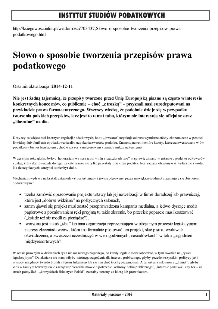 INSTYTUT STUDIÓW PODATKOWYCH http://ksiegowosc.infor.pl/wiadomosci/703437,Slowo-o-sposobie-tworzenia-przepisow-prawapodatkowego.html Słowo o sposobie tworzenia przepisów prawa podatkowego Ostatnia aktualizacja: 2014-12-11 Nie jest żadną tajemnicą, że przepisy tworzone przez Unię Europejską pisane są często w interesie konkretnych koncernów, co publicznie – choć „z troską” – przyznali nasi eurodeputowani na przykładzie prawa farmaceutycznego. Wszyscy wiedzą, że podobnie dzieje się w przypadku tworzenia polskich przepisów, lecz jest to temat tabu, którym nie interesują się oficjalne oraz „liberalne” media. Dotyczy to większości istotnych regulacji podatkowych, bo tu „inwestor” uzyskuje od razu wymierne efekty ekonomiczne w postaci likwidacji lub obniżenia opodatkowania albo uzyskania zwrotów podatku. Znane są nawet niektóre kwoty, które zainwestowano w ów podatkowy biznes legislacyjny, choć wszyscy zainteresowani z zasady milczą na ten temat. W zeszłym roku głośno było o honorarium wynoszącym 4 mln zł za „doradztwo” w sprawie zmiany w ustawie o podatku od towarów i usług, która doprowadziła do tego, że całe branże nie tylko przestały płacić ten podatek, lecz zaczęły otrzymywać wyłącznie zwroty. Na tle uzyskanych korzyści to niezbyt dużo. M echanizm wpływu na kształt ustawodawstwa jest znany i jawnie oferowany przez największe podmioty zajmujące się „biznesem podatkowym”: trzeba zamówić opracowanie projektu ustawy lub jej nowelizacji w firmie doradczej lub prawniczej, która jest „dobrze widziana” na politycznych salonach, zanim ujawni się projekt musi zostać przeprowadzona kampania medialna, a ledwo dyszące media papierowe z pocałowaniem ręki przyjmą tu takie zlecenie, bo przecież poparcie musi kosztować („ksiądz też się modli za pieniądze”), tworzona jest jakaś „izba” lub inna organizacja reprezentująca w oficjalnym procesie legislacyjnym interesy zleceniodawców, która ma formalnie pilotować ten projekt, słać pisma, wydawać oświadczenia, a zwłaszcza uczestniczyć w wielogodzinnych „nasiadówkach” w toku „uzgodnień międzyresortowych”. W sensie prawnym w działaniach tych nie ma niczego nagannego, bo każdy legalnie może lobbować, w tym również na „rynku legislacyjnym”. Działania te nie stanowiłyby istotnego zagrożenia dla interesu publicznego, gdyby przede wszystkim politycy jak i wysocy urzędnicy twardo bronili interesu fiskalnego lub się nim choć trochę przejmowali. A tu jest przysłowiowy „dramat”: gdyby ktoś w tamtym towarzystwie zaczął współcześnie mówić o potrzebie „ochrony dobra publicznego”, „interesie państwa”, czy też – aż strach pomyśleć – „korzyściach fiskalnych Polski”, zostałby uznany za idiotę lub prowokatora. Materia³y prasowe – 2014 1 INSTYTUT STUDIÓW PODATKOWYCH Niedawno, podczas konferencji w Polskiej Akademii Nauk, gdzie poruszałem w referacie te problemy, gościł znany (obecnie również z rekordowych wydatków na wyjazdy) polityk, który nie tylko nie podjął tematu, lecz nawkładał mi w stylu „Gazety Wyborczej” i szybko uciekł z posiedzenia. Widać temat „biznesu legislacyjnego” jest problemem niewygodnym, a na udział w dyskusji nad tym tematem, przynajmniej części polityków, nie ma na co liczyć. Zresztą samym „inwestorom” na rynku legislacyjnym rozwiązuje się czasami język i publicznie mówią jak uzyskuje się przychylność w załatwianiu często zupełnie słusznych postulatów: otóż najpierw trzeba zamówić „opinię” na ten temat w „renomowanej firmie doradczej”, a potem mając ją w garści trzeba pochodzić po odpowiednich gabinetach, gdzie robi ona dobre wrażenie. I znów nie ma w tym, przynajmniej zewnętrznie, nic złego, bo są to opinie „poważne”, firma jest „międzynarodowa”, a jej przedstawiciele zasiadają oficjalnie w gremiach konsultacyjnych przy ministrach lub nawet jeszcze wyżej. Zapewne niewygodnym szczegółem, o którym już lepiej nie wspominać, jest fakt, że w tym biznesie doradczym pracuje wiele byłych urzędników, lecz to też pewnie nie jest zakazane. Konkluzja jest jednak dość smutna: gdy politycy i urzędnicy nie chronią interesu publicznego w procesie legislacyjnym, rządzą ci, którzy pierwsi wepchnęli swój projekt i wykazali się wyższą skutecznością lobbystyczną. Tak jest już od lat w Unii Europejskiej, tak jest i będzie w Polsce dopóki nie zmieni się w sposób istotny obecna klasa polityczna, bo dla dzisiejszego liberała obecny stan rzeczy jest czymś zupełnie normalnym, bo dzięki prywatyzacji tworzenia przepisów podatkowych „więcej pieniędzy zostanie w kieszeni podatników”. Potem niech nikt się nie dziwi, że spada udział podatku w PKB, mimo formalnego podwyższenia stawek. Nie sądzę, aby udało się odnaleźć interes publiczny w procesie tworzenia większości przepisów podatkowych, ale można oczekiwać jawności tego procesu, w tym ujawnienia potencjalnego konfliktu interesów: władza, a zwłaszcza ministerstwa powinny publikować ile wydały pieniędzy na doradztwo (opinie, raporty, ekspertyzy) ze strony firm, które działają również na rzecz podmiotów, których interesy są sprzeczne z interesem publicznym. Oczywiście trzeba zacząć od resortu finansów. Witold Modzelewski Profesor Uniwersytetu Warszawskiego Instytut Studiów Podatkowych Materia³y prasowe – 2014 2